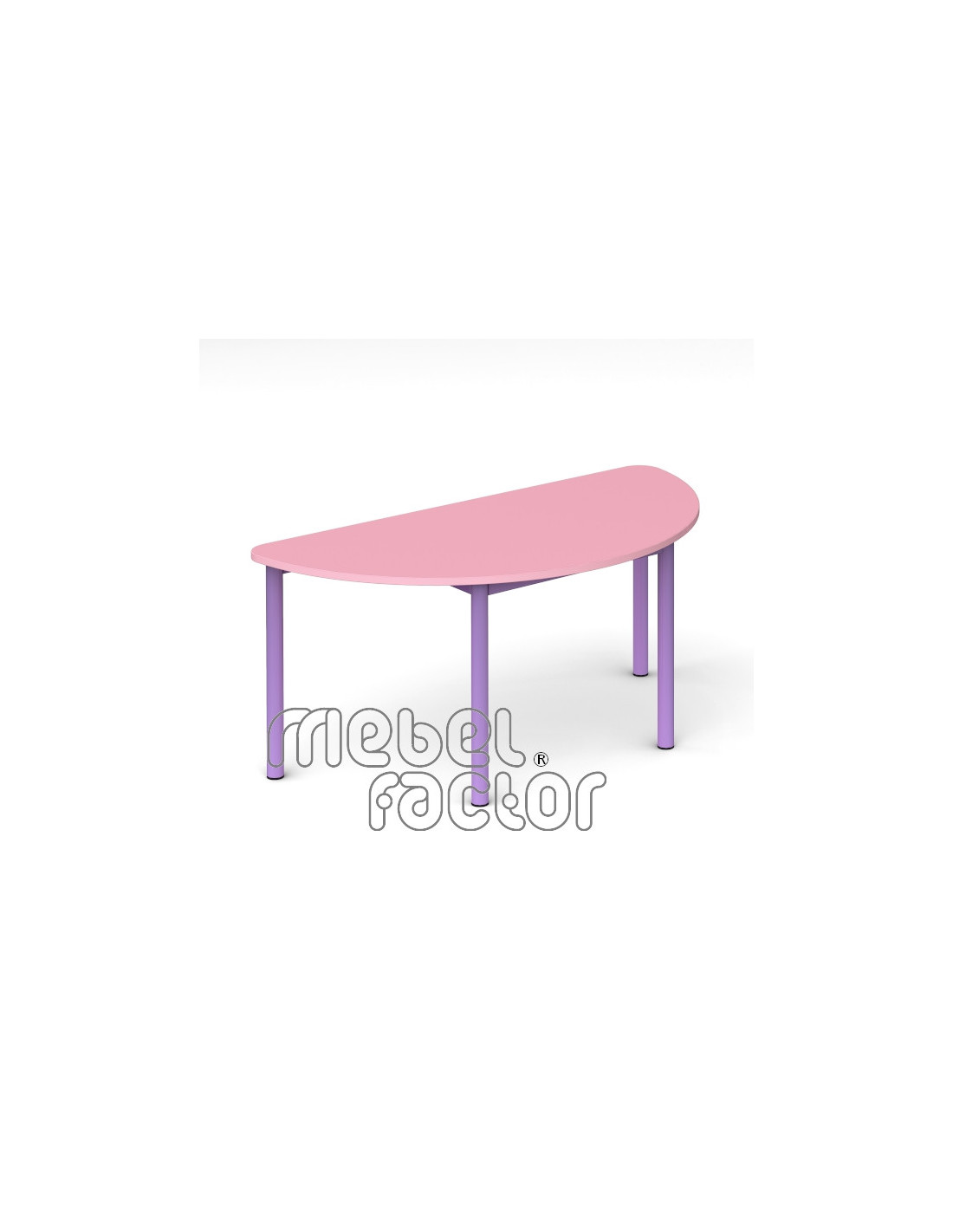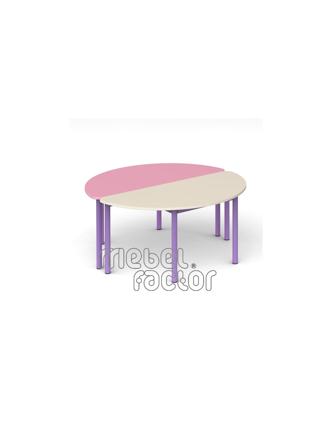Детска модулна маса РОНДО, размер 2. Подходяща за възраст до 5 години. Плот полукръг с размери 120х60см./Н53см, кант 2,0мм. Обезопасени, заоблени ъгли на плота. Декори на ламинирано ПДЧ от фирмения картел. Заварена конструкция с крака от тръба 40мм. Царги от правоъгълен профил 40х20мм. Полимерно, прахово покритие в цветове по RAL. Произведено в България. Продуктът отговаря на стандарт БДС EN 1729 - "Мебели. Столове и маси за учебни заведения."