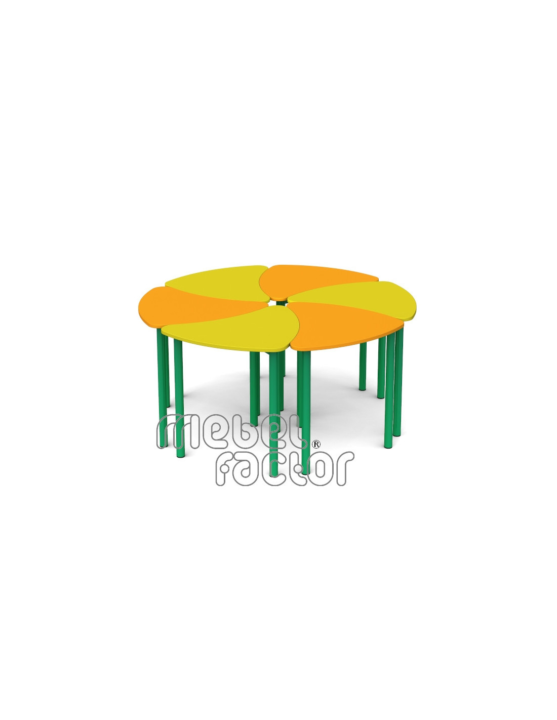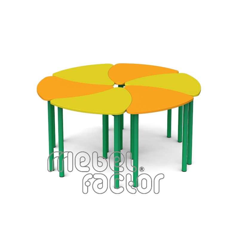 Детска, модулна маса ЦВЕТЕ, размер 1. Удобна за самостоятелна и съвместна работа. Комбиниране в кръг от 6 броя с диаметър 140см. Подходяща за възраст до 3 години. Плот с размери 69х56/Н46см., кант 2,0мм. Декори на ламинирано ПДЧ от фирмения картел. Заварена конструкция с крака от тръба 40мм. Царги от правоъгълен профил 40х20мм. Полимерно, прахово покритие в цветове по RAL. Произведено в България. Продуктът отговаря на стандарт БДС EN 1729 - "Мебели. Столове и маси за учебни заведения."
