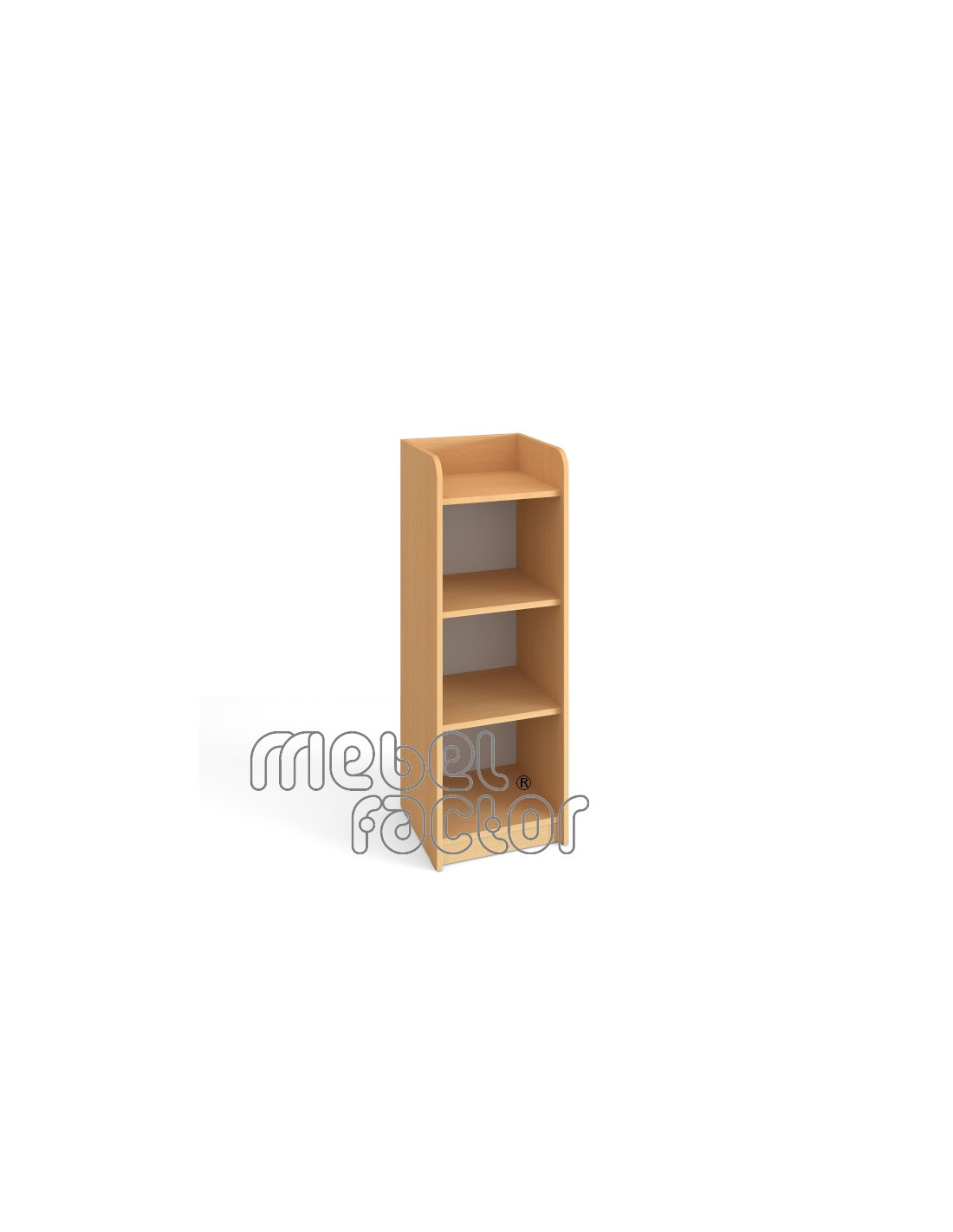 Единична, детска етажерка с четири рафта. Обезопасени, заоблени ъгли на корпуса. Разстояние между рафтовете 32см. Корпус от 18мм ламинирано ПДЧ с кант 2,0мм. Гръб от лакиран HDF 3мм. Декори на ламинирано ПДЧ от фирмения картел. Размери 42х39х119,5см. Произведено в България.