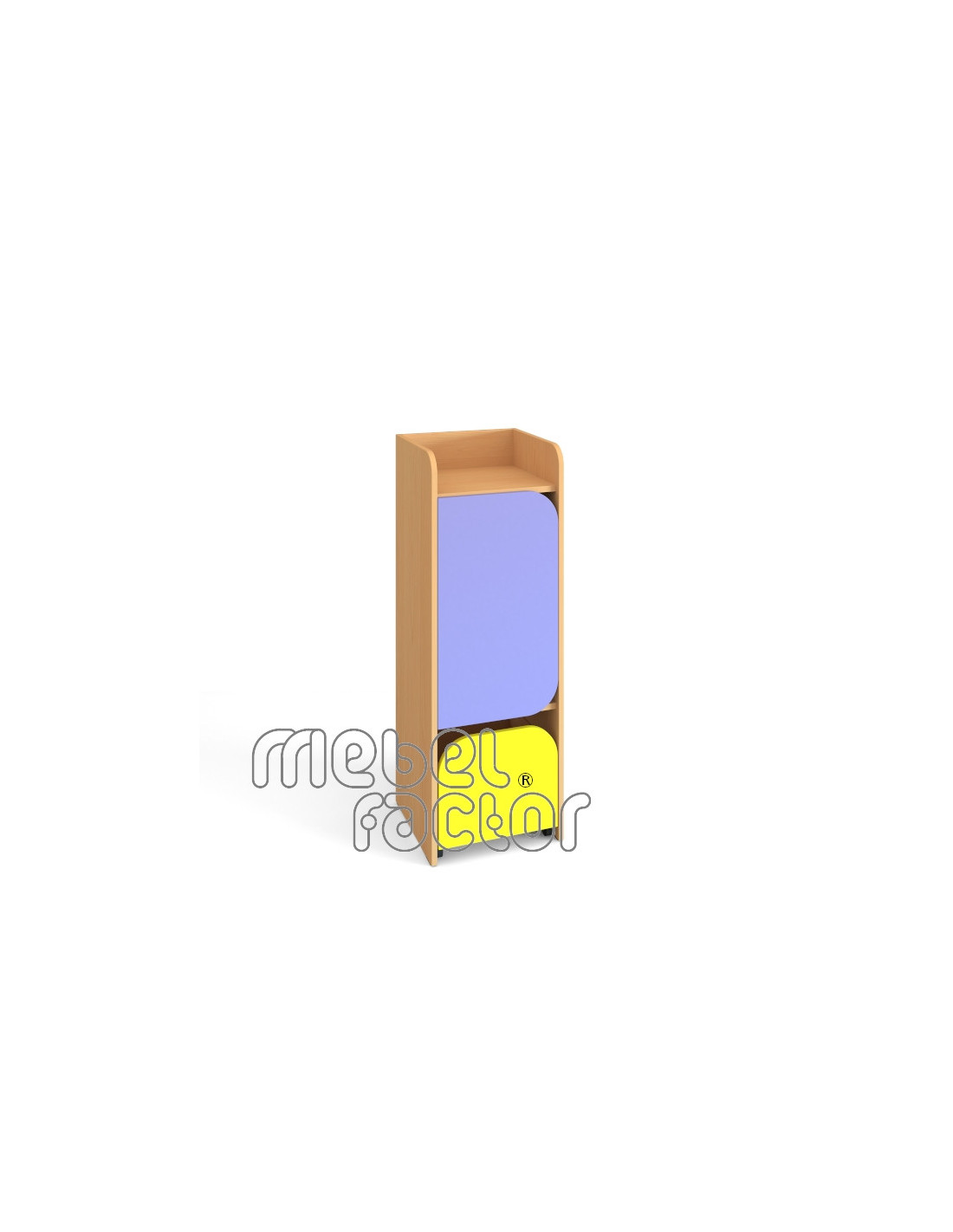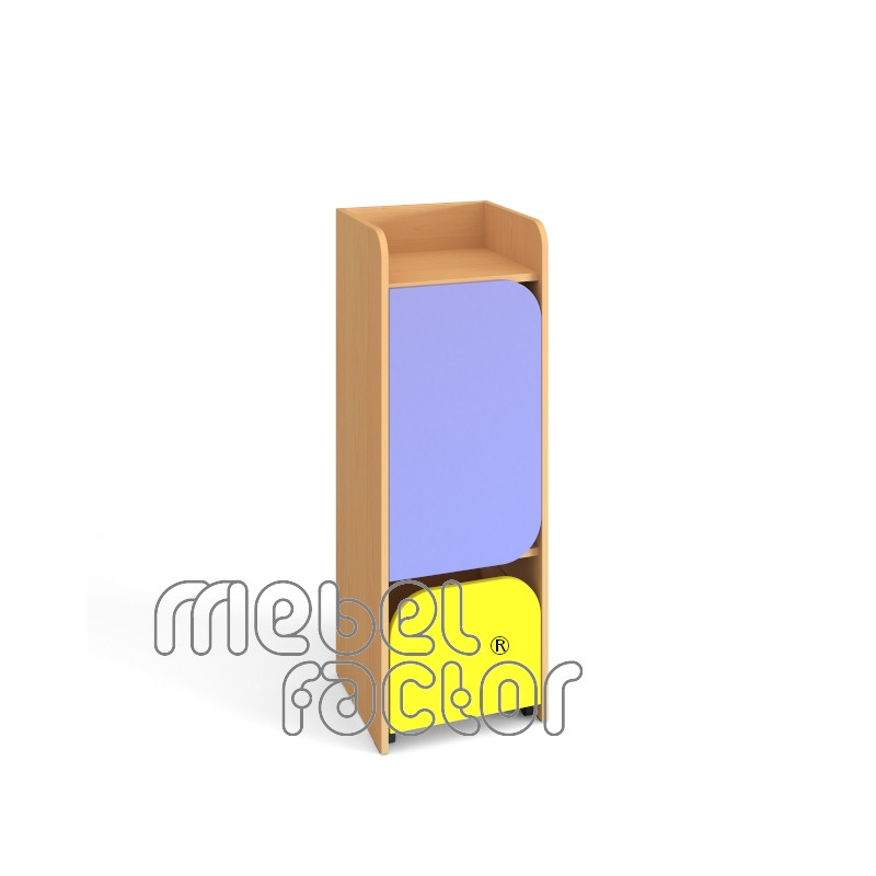 Единичен, детски шкаф с врата и чекмедже. Обезопасени, заоблени ъгли на външните елементи. Чекмедже тип контейнер с пълно изтегляне. Разстояние между рафтовете 32см. Корпус от 18мм ламинирано ПДЧ с кант 2,0мм. Гръб от ламиниран HDF 3мм. Декори на ламинирано ПДЧ от фирмения картел. Размери 42х39х119,5см. Произведено в България.