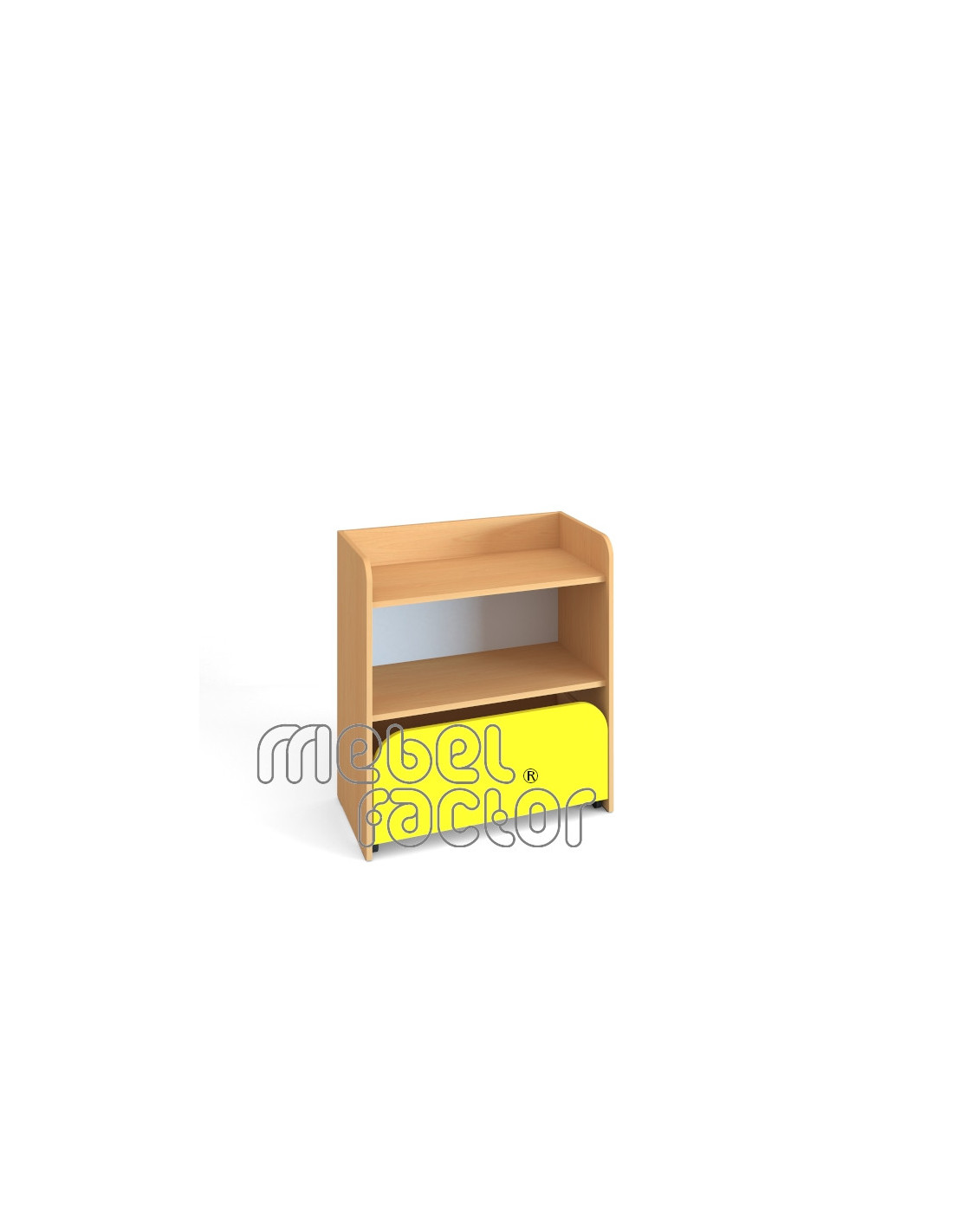 Двоен, детски шкаф с два рафта и чекмедже. Обезопасени, заоблени ъгли на външните елементи. Чекмедже тип контейнер с пълно изтегляне. Разстояние между рафтовете 32см. Корпус от 18мм ламинирано ПДЧ с кант 2,0мм. Гръб от ламиниран HDF 3мм. Декори на ламинирано ПДЧ от фирмения картел. Размери 80х39х86,5см. Произведено в България.