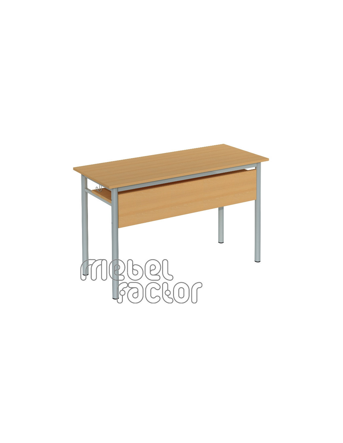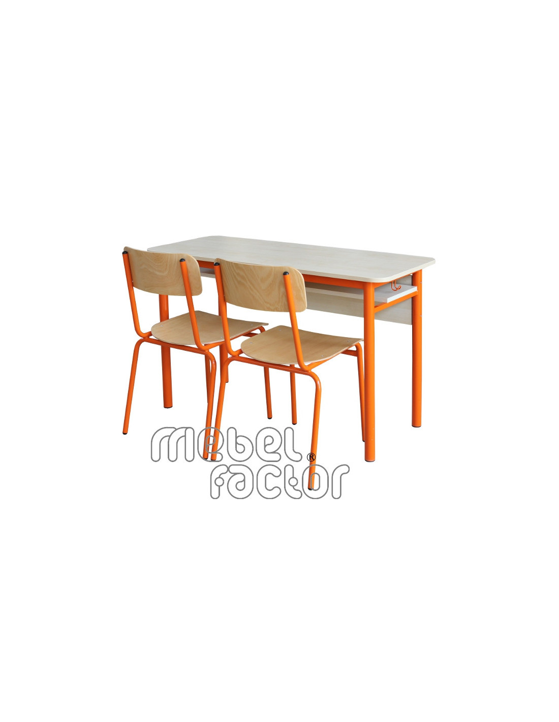 Двуместна ученическа маса РОНДО, размер 6. Вариант със заоблени ъгли на плота. Подходяща за възраст над 14 години. Плот с размери 120х50/Н76см., кант 2,0мм. Чело и рафт от ламинирано ПДЧ с дебелина 18мм. Декори на ламинирано ПДЧ от фирмения картел. Заварена конструкция с крака от тръба 40мм. Включени 2 броя закачалки за ученическа чанта. Полимерно, прахово покритие в цветове по RAL. Произведено в България. Продуктът отговаря на стандарт БДС EN 1729 - "Мебели. Столове и маси за учебни заведения."