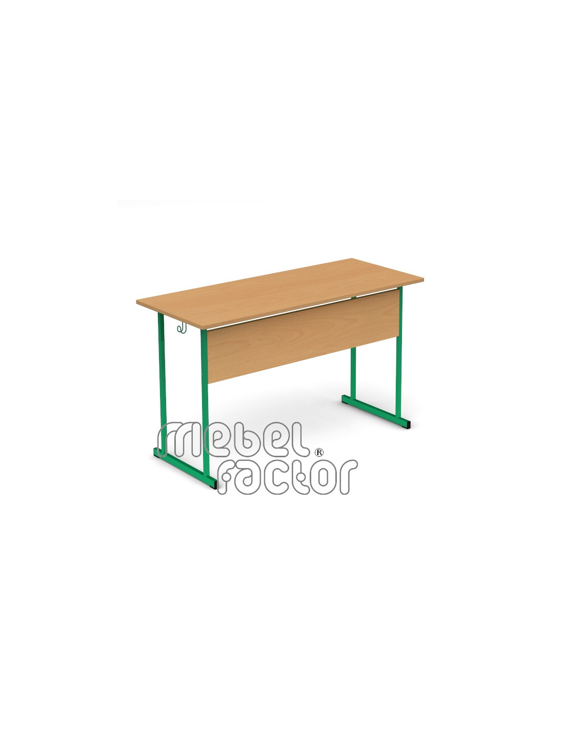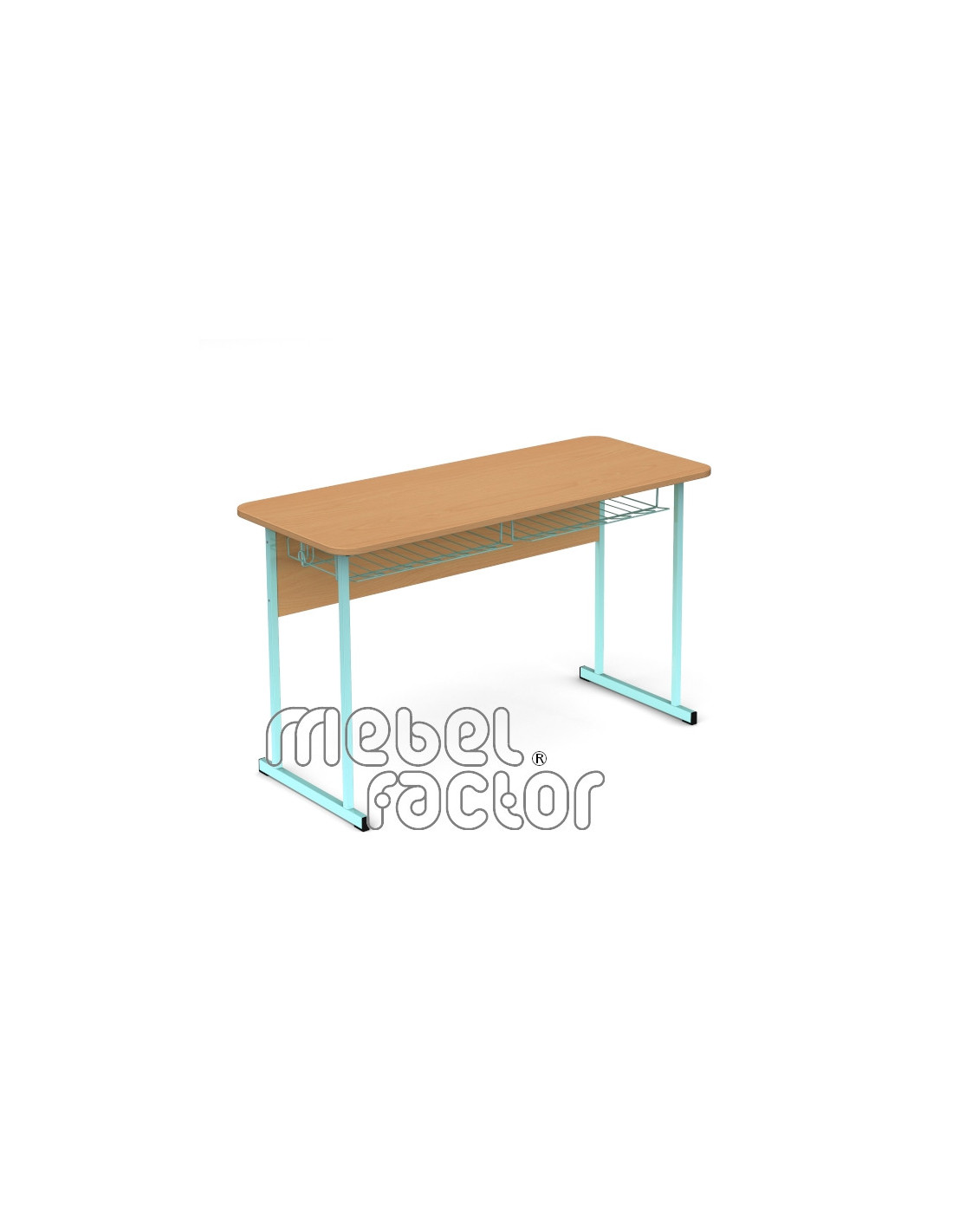 Двуместна ученическа маса УНИВЕРСАЛ, размер 5. Вариант със заоблени ъгли на плота. Подходяща за възраст от 11 до 14 години. Плот с размери 120х50/Н71см., кант 2,0мм. Чело от ламинирано ПДЧ с дебелина 18мм. Заварена конструкция от тръба 20х20мм. Включени 2 броя закачалки за ученическа чанта. Декори на ламинирано ПДЧ от фирмения картел. Полимерно, прахово покритие в цветове по RAL. Произведено в България. Продуктът отговаря на стандарт БДС EN 1729 - "Мебели. Столове и маси за учебни заведения."