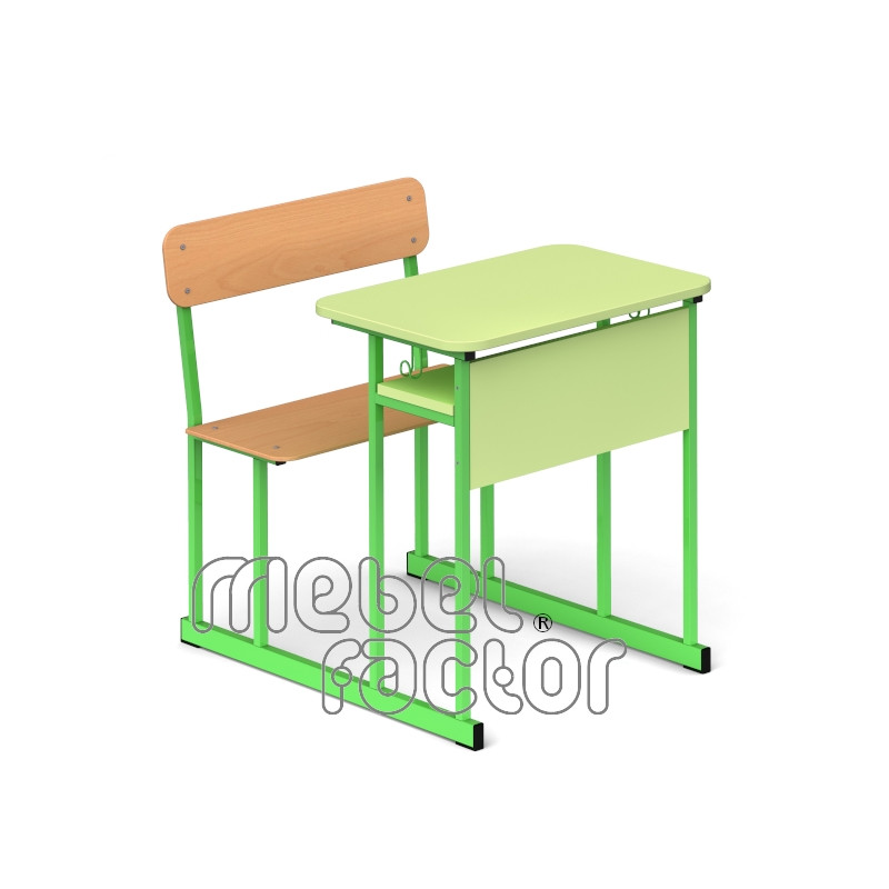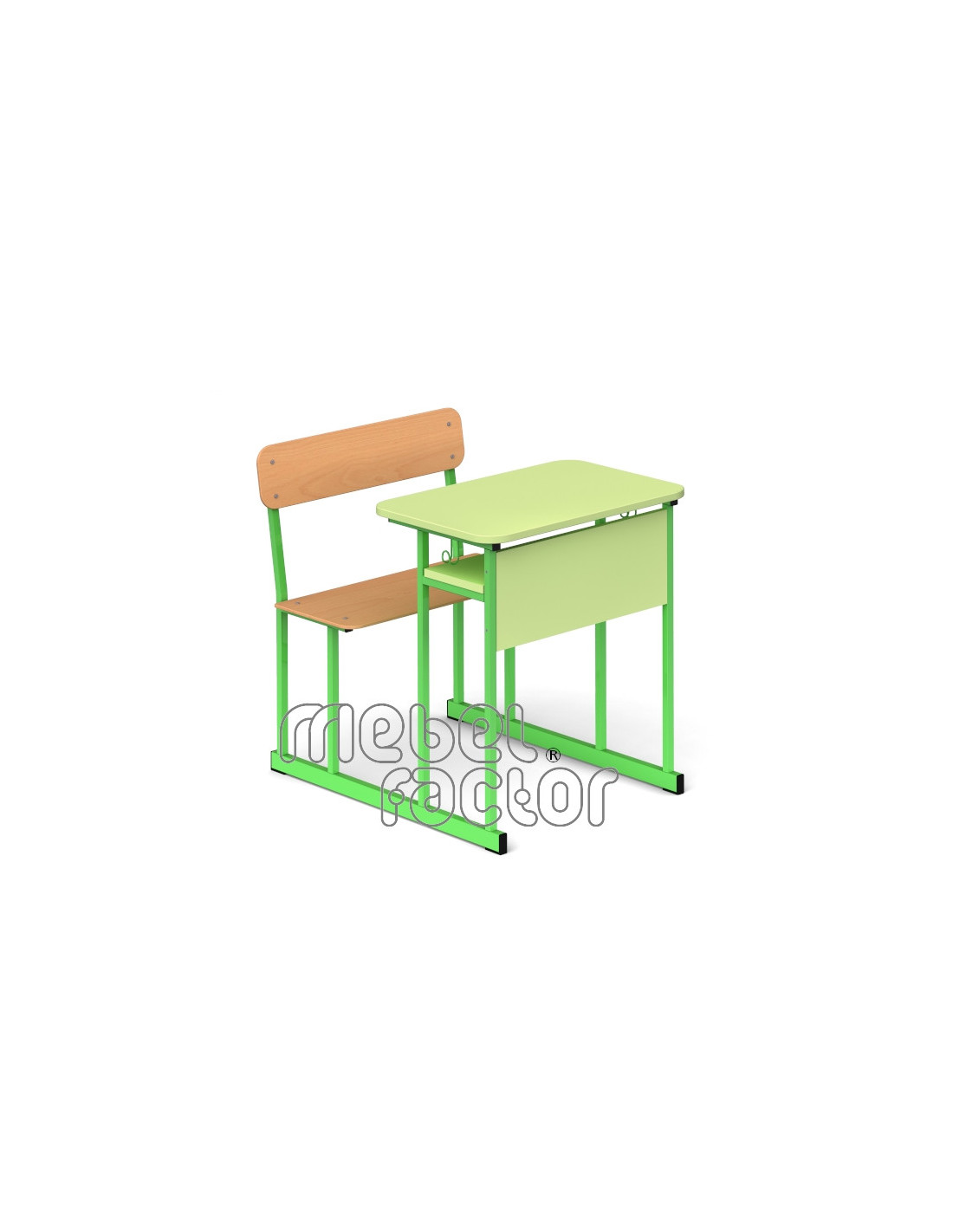 Едноместен ученически чин УНИВЕРСАЛ, размер 5. Вариант със заоблени ъгли на плота. Подходящ за възраст от 11 до 14 години. Плот с размери 60х45см., кант 2,0мм. Височина на плота 71см., височина на седалката 42см. Чело и рафт от ламинирано ПДЧ с дебелина 18мм. Седалка и облегалка от лакиран шперплат 8мм. Декори на ламинирано ПДЧ от фирмения картел. Заварена конструкция от квадратен профил 20х20мм. Подсилваща метална царга под плота и седалката. Включени закачалки за ученическа чанта. Полимерно, прахово покритие в цветове по RAL. Произведено в България. Продуктът отговаря на стандарт БДС EN 1729 - "Мебели. Столове и маси за учебни заведения."