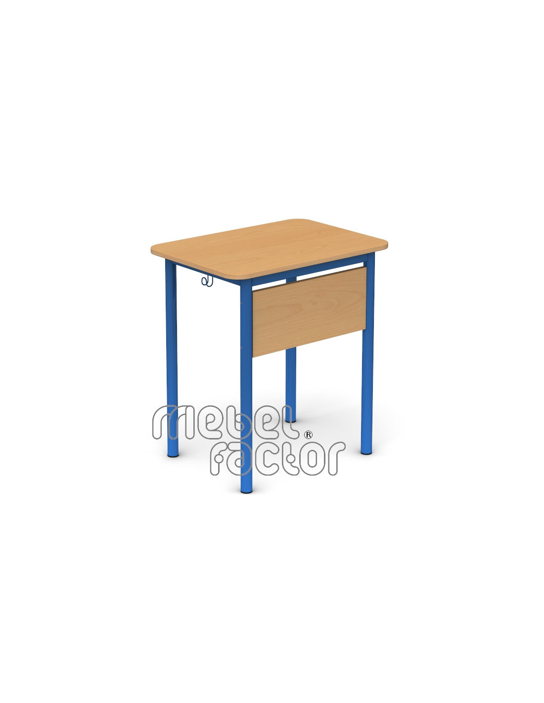 Едноместна ученическа маса РОНДО, размер 6. Вариант със заоблени ъгли на плота. Подходяща за възраст над 14 години. Плот с размери 70х50/Н76см., кант 2,0мм. Чело от ЛПДЧ с дебелина 18мм. Декори на ламинирано ПДЧ от фирмения картел. Заварена конструкция с крака от тръба 40мм. Включенa закачалкa за ученическа чанта. Полимерно, прахово покритие в цветове по RAL. Произведено в България. Продуктът отговаря на стандарт БДС EN 1729 - "Мебели. Столове и маси за учебни заведения."