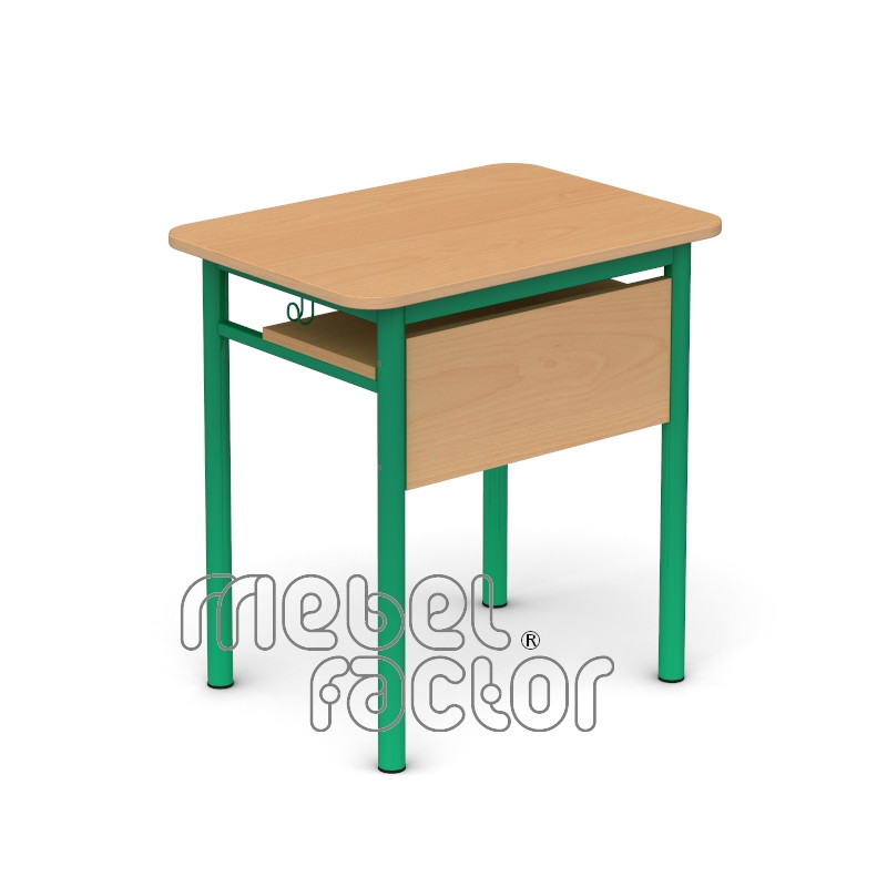 Едноместна ученическа маса РОНДО, размер 5. Вариант със заоблени ъгли на плота. Подходяща за възраст от 11 до 14 години. Плот с размери 70х50/Н71см., кант 2,0мм. Чело и рафт от ЛПДЧ с дебелина 18мм. Декори на ламинирано ПДЧ от фирмения картел. Заварена конструкция с крака от тръба 40мм. Включенa закачалкa за ученическа чанта. Полимерно, прахово покритие в цветове по RAL. Произведено в България. Продуктът отговаря на стандарт БДС EN 1729 - "Мебели. Столове и маси за учебни заведения."