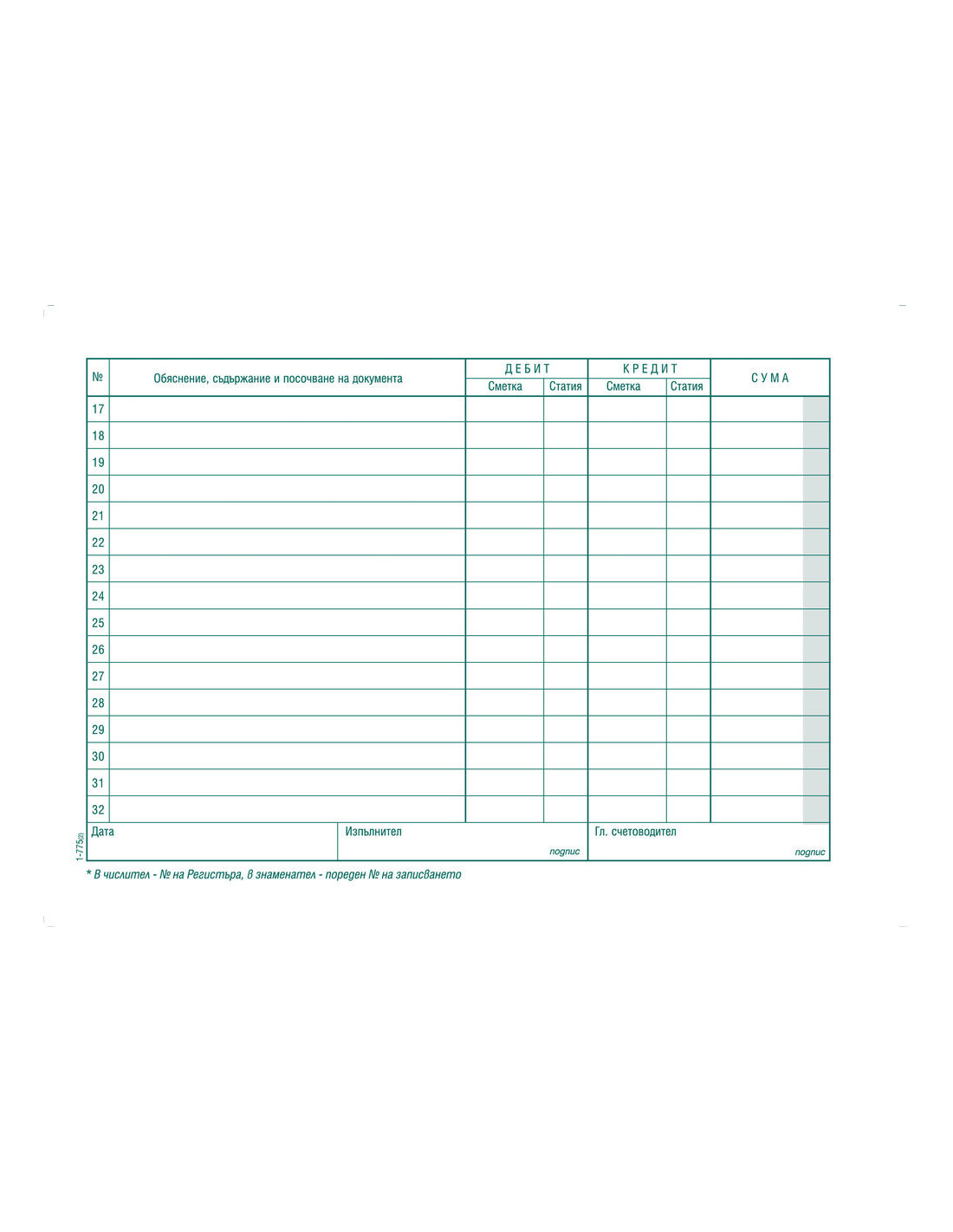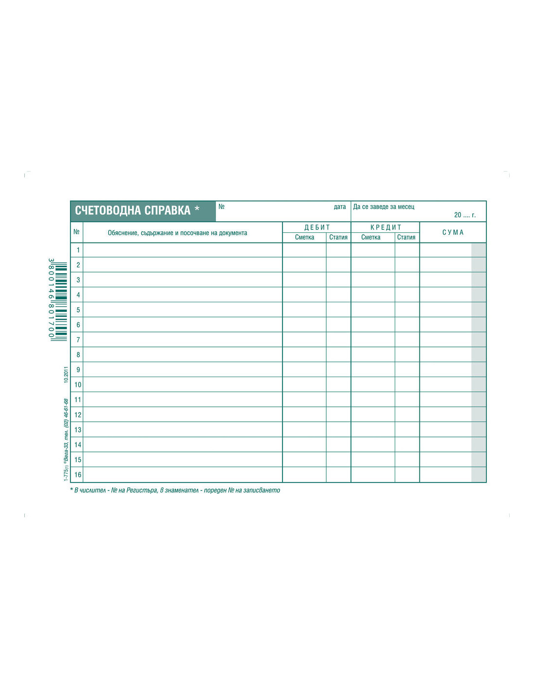 Счетоводна справка, вестникарска хартия, лепен кочан с размери 19.5 х 14 см.
