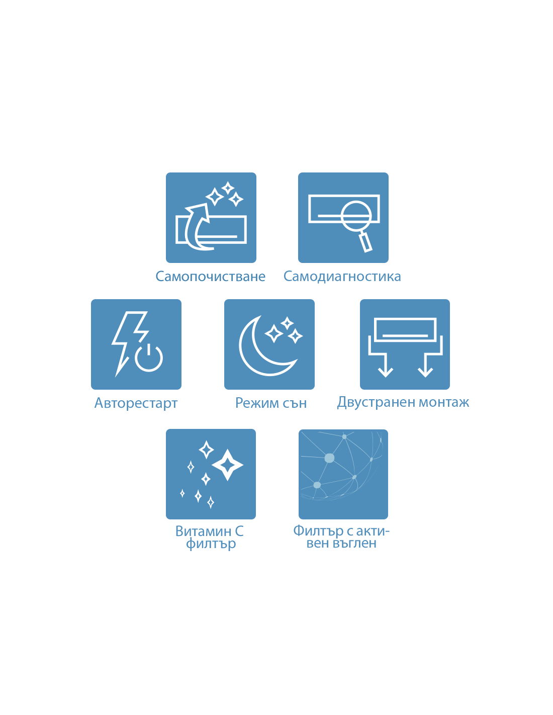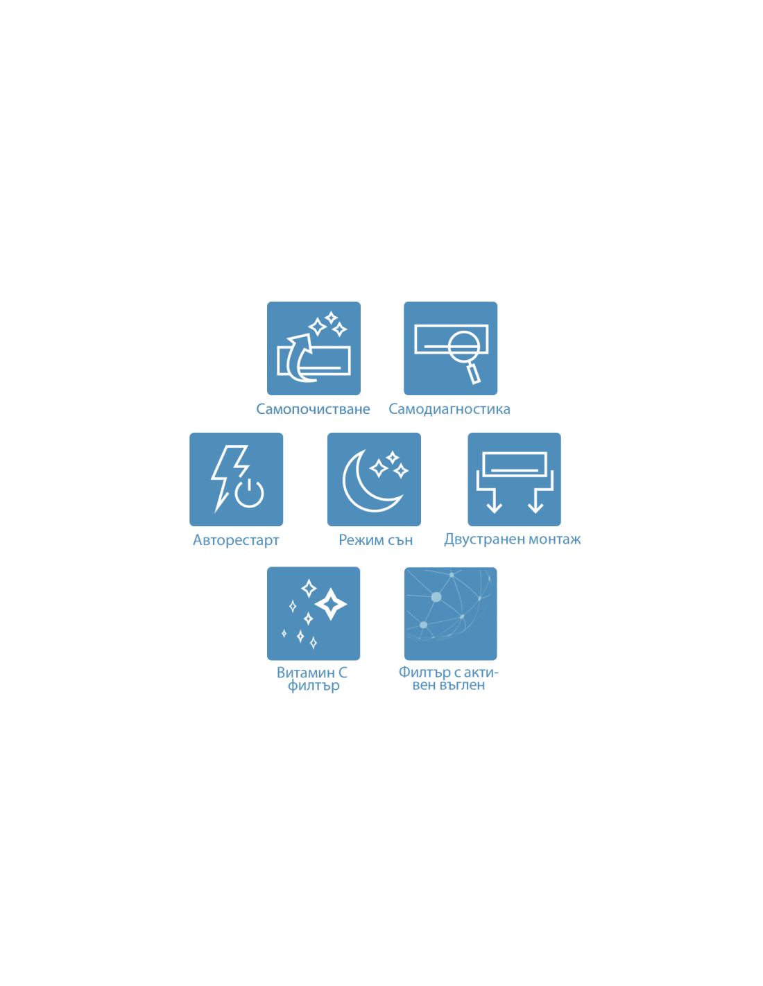 | Авторестарт При спиране на захранването климатикът запомня зададените настройки и възобновява работата си, когато токът е възстановен. |