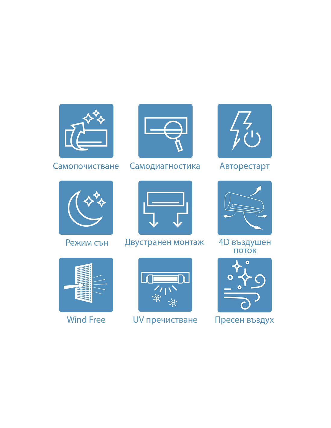 | 4D въздушен поток Функцията „4D въздушен поток“ предоставя възможност за управление на въздушния поток в 4 посоки – по вертикала и по хоризонтала. |