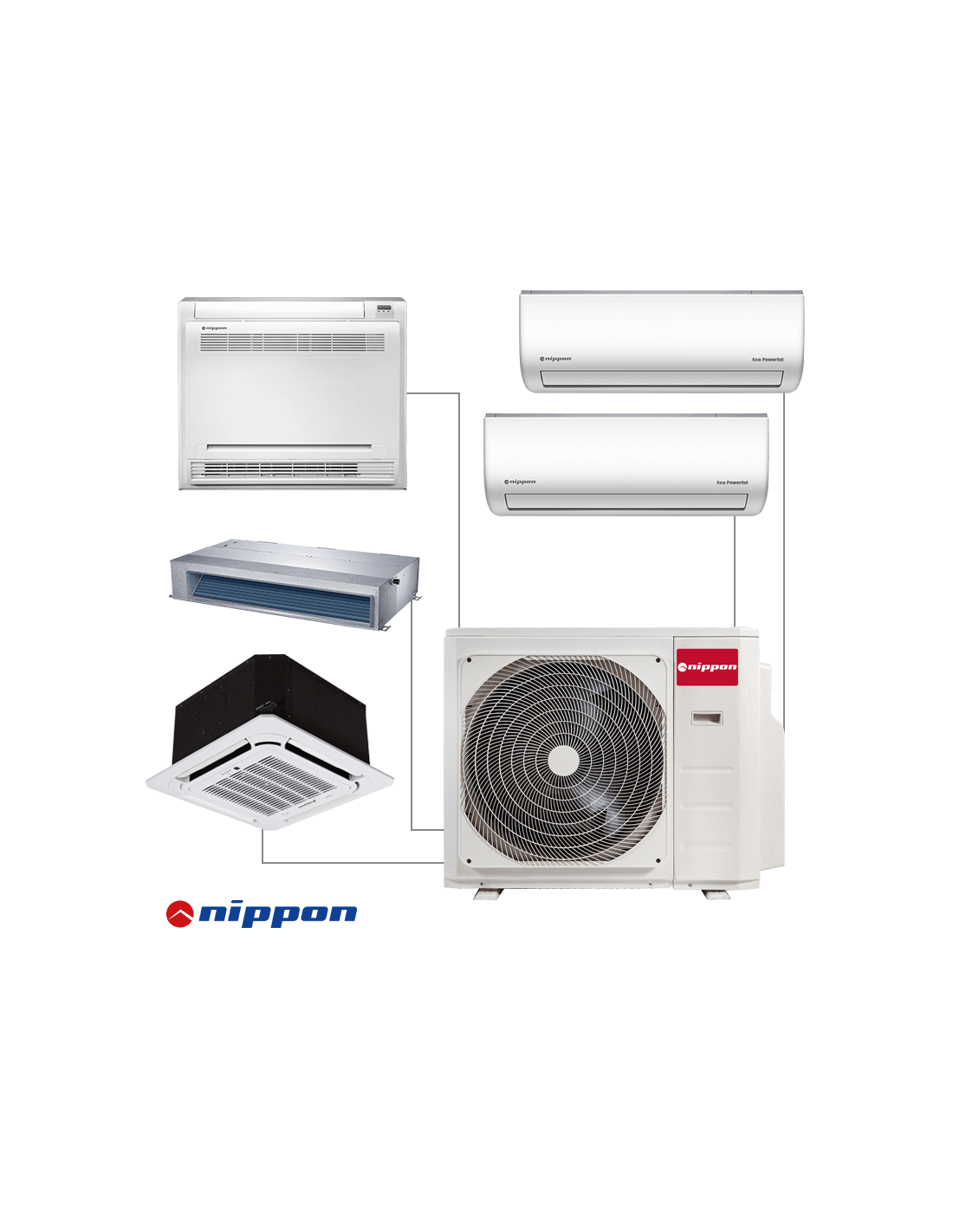 Мултисплит Nippon N50D-42HFN8-Q е климатична система, работеща с едно външно и пет вътрешни тела от климатици Nippon, които могат да бъдат различни по вид (стенен, касетъчен и канален тип). Предоставя възможност за гъвкав монтаж и независим контрол на всяко вътрешно тяло.
