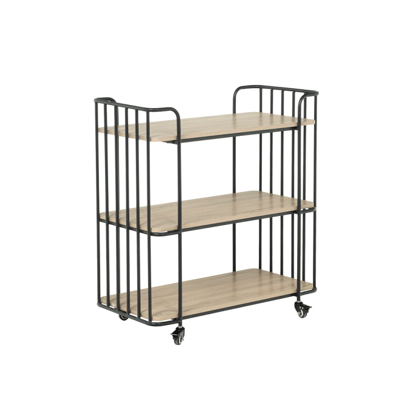 Помощната количка VARBERG съчетава индустриален стил и практичност. Стабилната ѝ основа е от праховобоядисан метал с черен финиш, а трите рафта са изработени от 15 мм МДФ. Колелцата със стопери осигуряват лесно преместване и надеждно фиксиране при нужда.