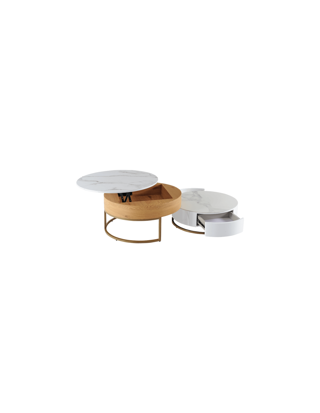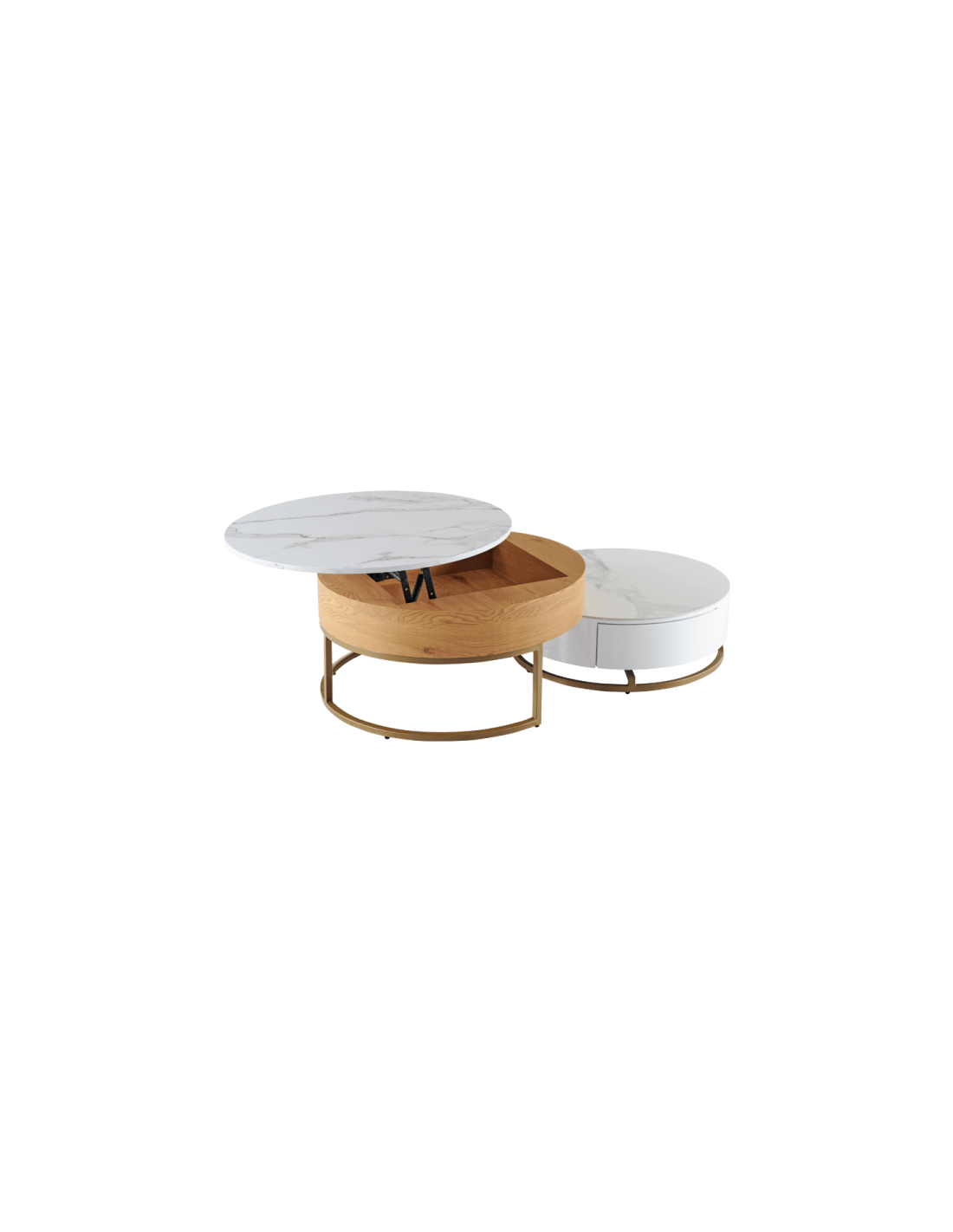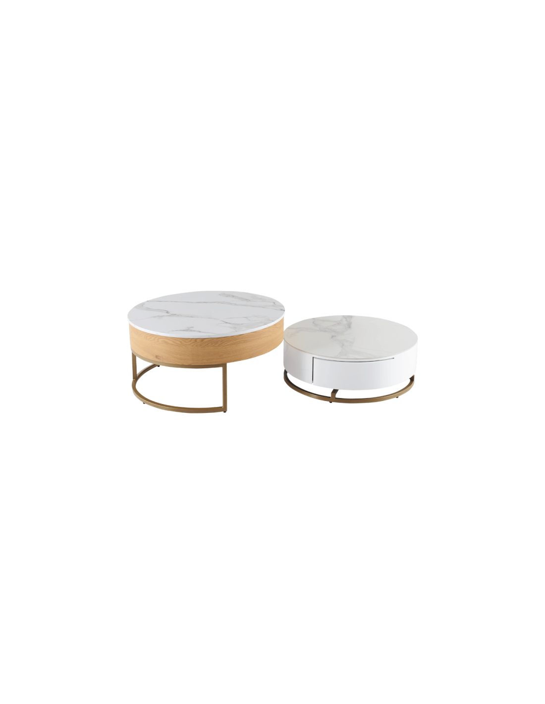 TAMPA 1 е комплект от 2 холни масички с модерен дизайн. Те имат основа от праховобоядисан метал в златист цвят. Плотовете на масите в комплекта са изработени от МДФ (за голямата) с 15 мм дебелина и керамика (за малката) с 5 мм дебелина, а страничния им борд от МДФ. Моделът притежава практична повдигаща функция и две компактни чекмеджета за съхранение.