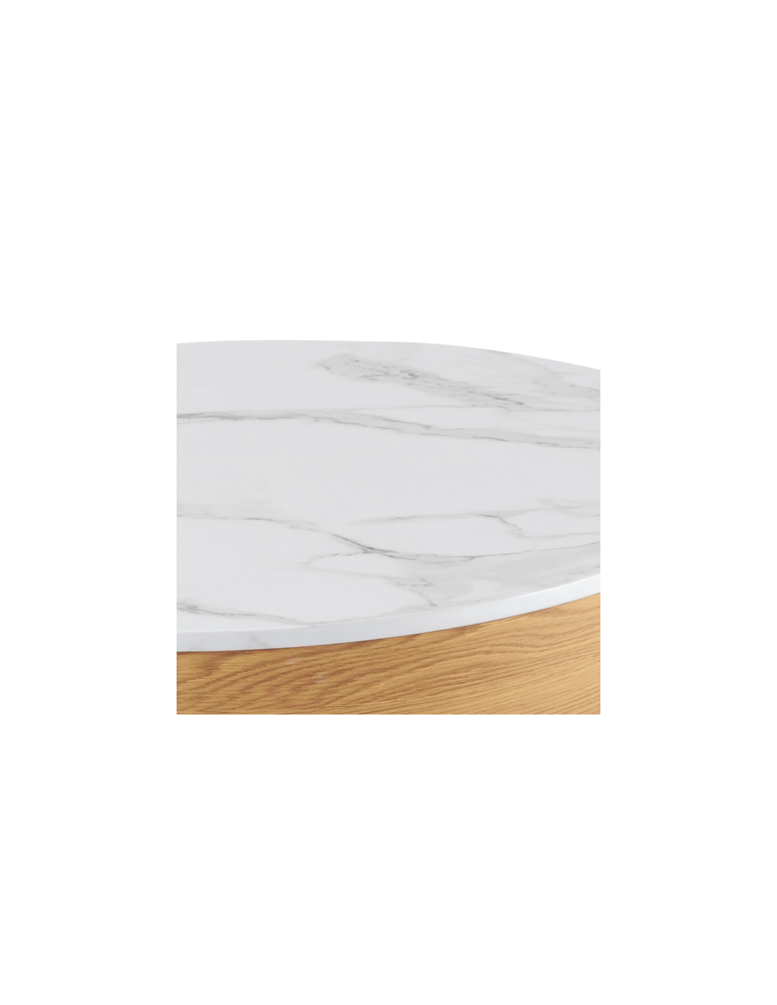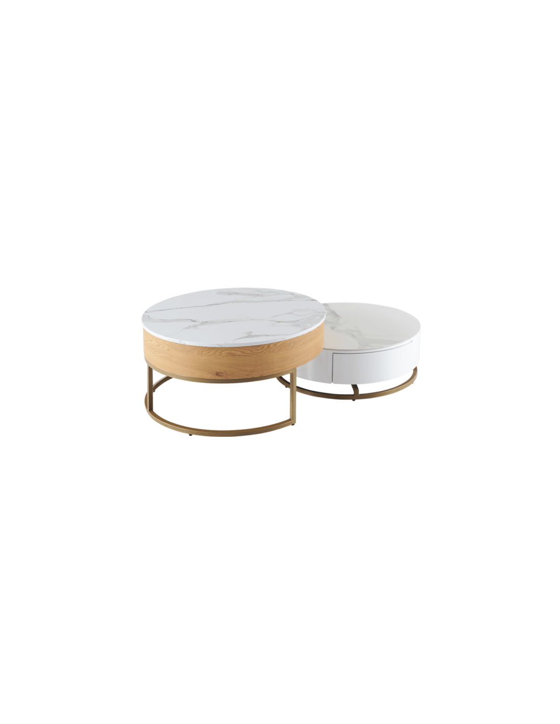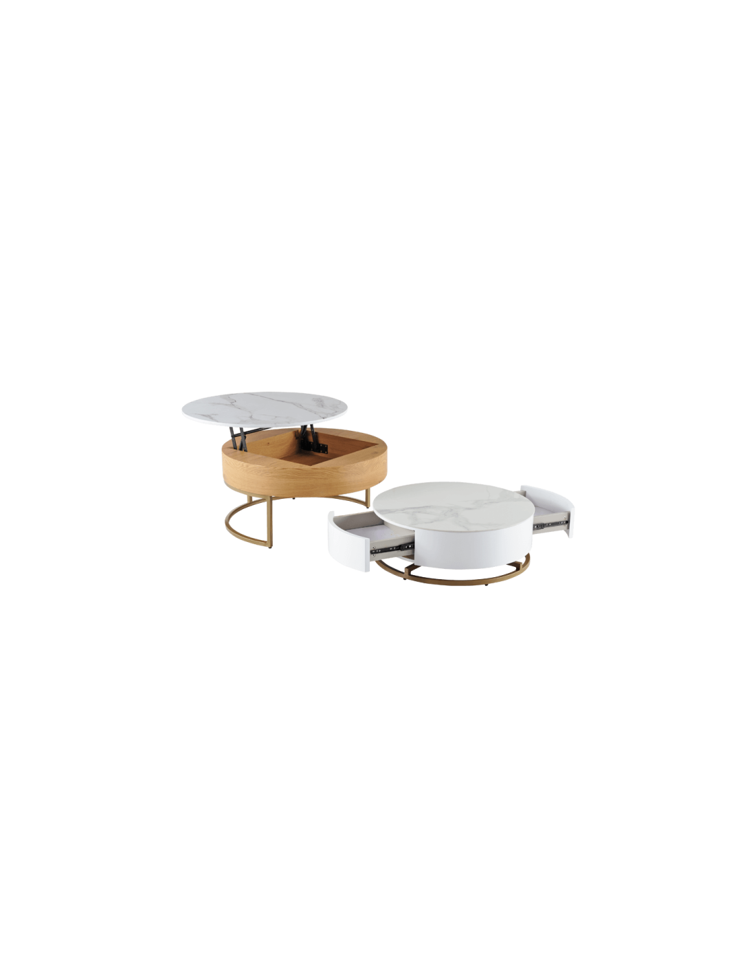 TAMPA 1 е комплект от 2 холни масички с модерен дизайн. Те имат основа от праховобоядисан метал в златист цвят. Плотовете на масите в комплекта са изработени от МДФ (за голямата) с 15 мм дебелина и керамика (за малката) с 5 мм дебелина, а страничния им борд от МДФ. Моделът притежава практична повдигаща функция и две компактни чекмеджета за съхранение.