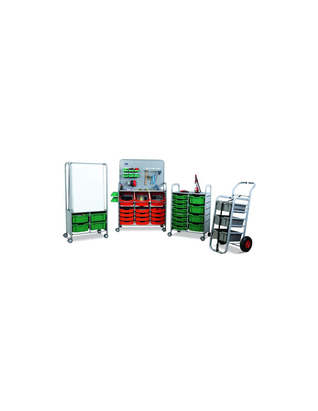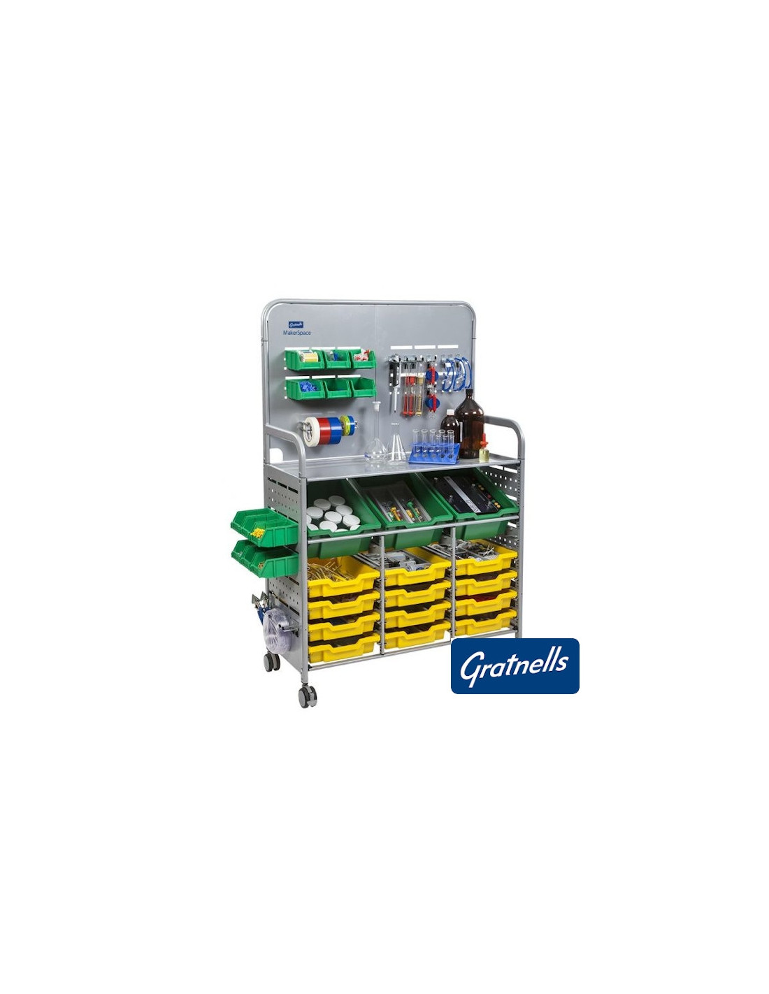 Подвижна работна станция за STEM проекти и дейности. Насърчава учениците за сътрудничество и изобретателност. Помага в организацията на учебният процес. Закачалките за инструменти се разместват лесно според нуждите. Комплектът съдържа: · Здрава стоманена рамка и заключващи колела 75мм · Странични и задни панели за аксесоари · 3 средни контейнера (F2) · 12 плитки контейнера (F1) · 12 мини кошчета · 1 държач за ролки · 5 единични куки и 5 двойни куки Подходяща за товари до 85кг.
