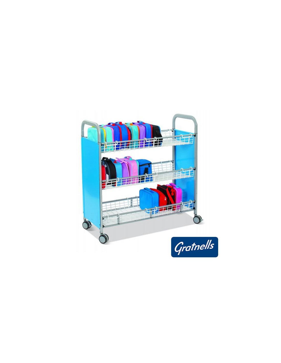 Предлага решение за транспорт и съхранение на чанти, спортни пособия и екипировка. Лесно предвижване с колелца 75мм. Спирачен механизъм в колелата, активиран с крака. Метална конструкция с прахово покритие RAL9006. Продава се в комплект с 3 рафта. Доставя се пакетирана, за сглобяване.