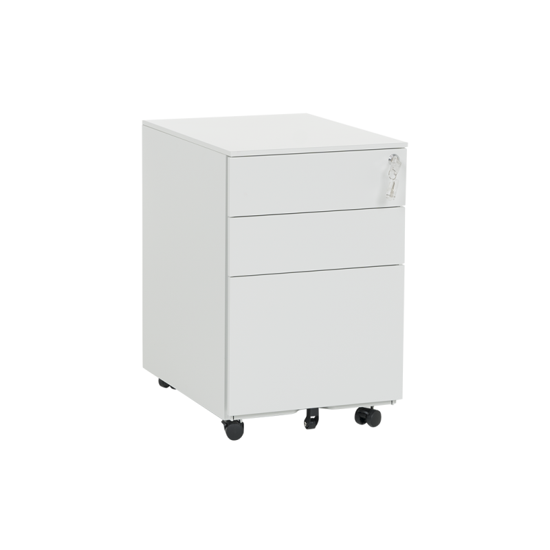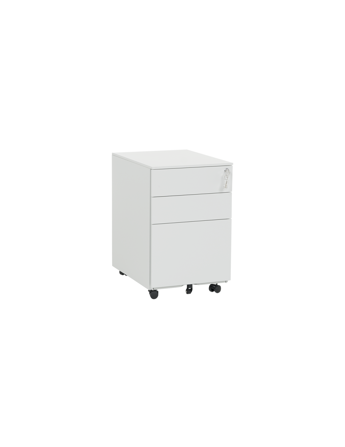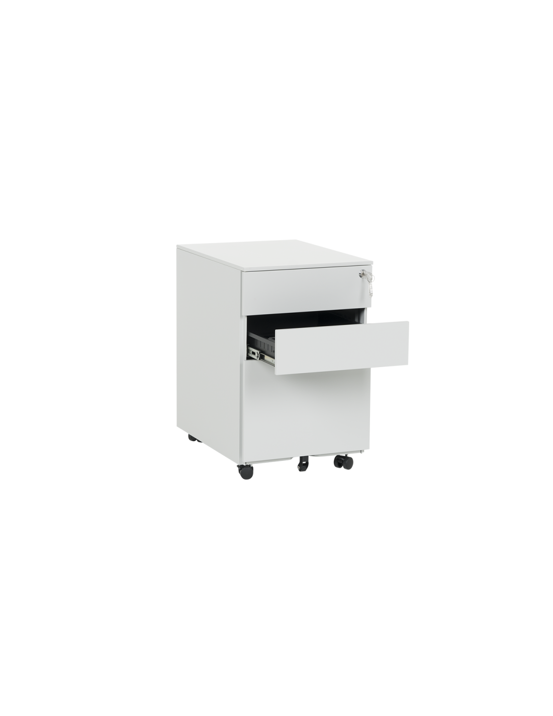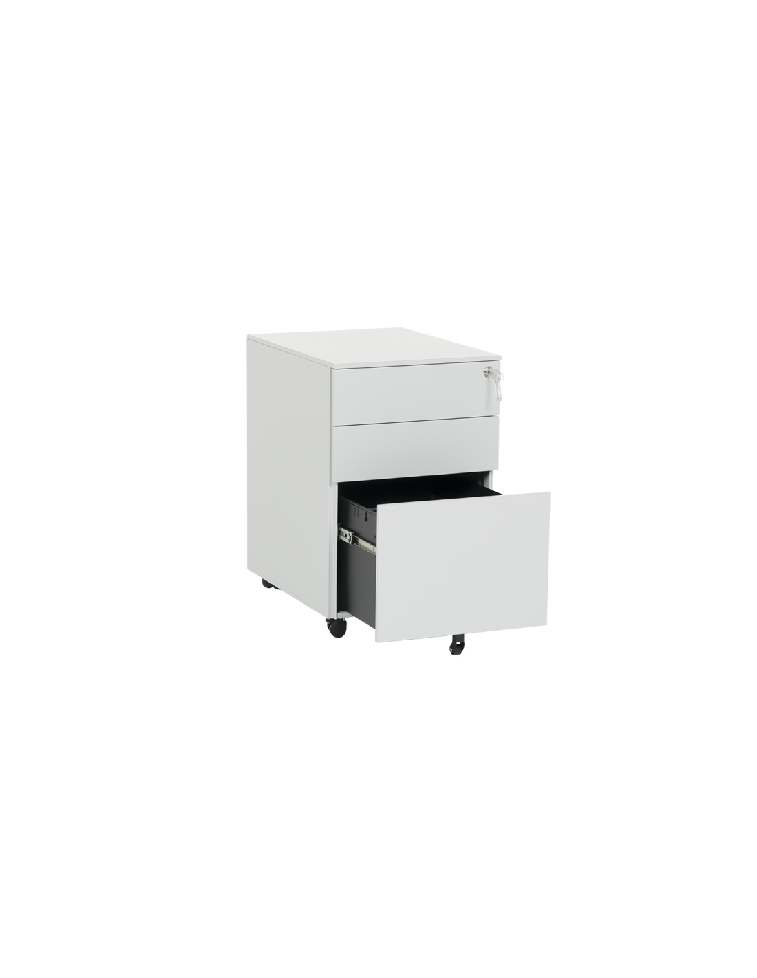 Офис контейнер Carmen CR-1806 K – практичен кардекс с 3 чекмеджета и централно заключване. След отключване всяко чекмедже се отваря самостоятелно, докато другите 2 са в затворено положение. Моделът е изработен от праховобоядисан метал с гладко покритие и пристига цял, без нужда от монтаж. В основата му има колела за лесно преместване.