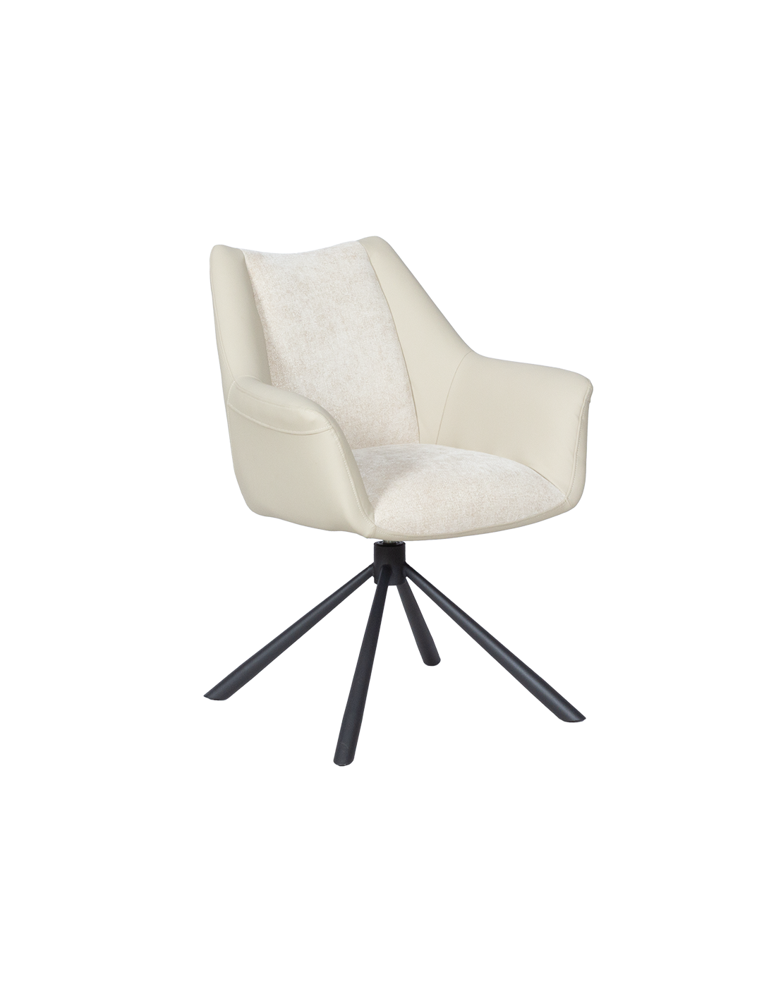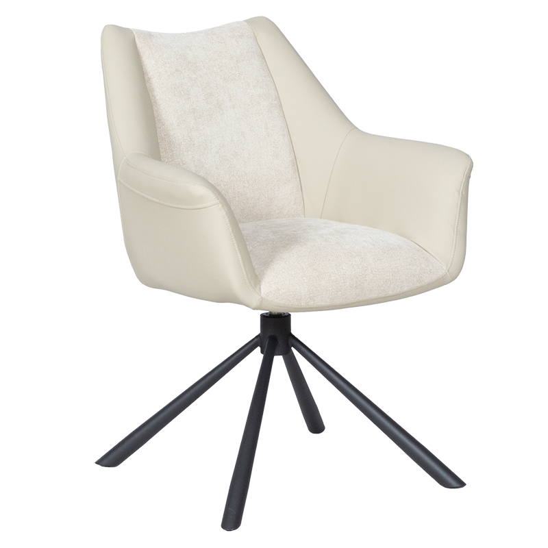 Трапезен стол TEMPE разполага с удобни подлакътници, широки седалка и облегалка, изработени от приятна на допир дамаска и висококачествена силиконова кожа. Интересната му основа е от метал, праховобоядисан в черно. Моделът има функция за въртене на седалката на 360° и връщането ѝ в изходяща позиция. Пълна информация за размерите и характеристиките на модела ще намерите в таблицата в таб/поле "Техническа информация".
