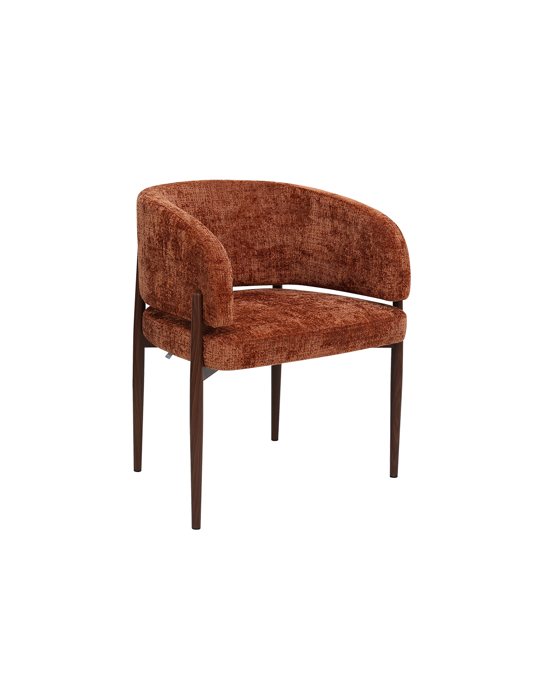 Трапезният стол RIMAR съчетава модерна визия с комфорт и прецизна изработка. Тапицираната седалка и облегалка с изчистени извивки осигуряват стабилна опора и приятна мекота при сядане. Издължените метални крака с праховобоядисано покритие в дървесен цвят допълват елегантния силует и придават изискан акцент на интериора. Пълна информация за размерите и характеристиките на модела ще намерите в таблицата в таб/поле "Техническа информация".