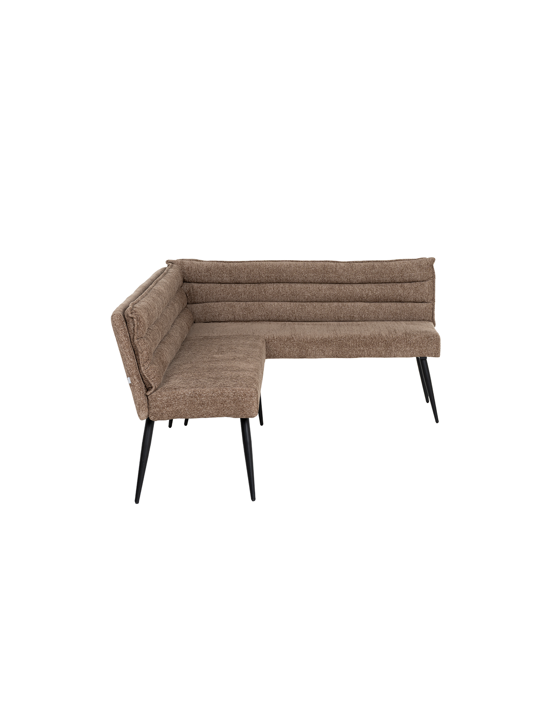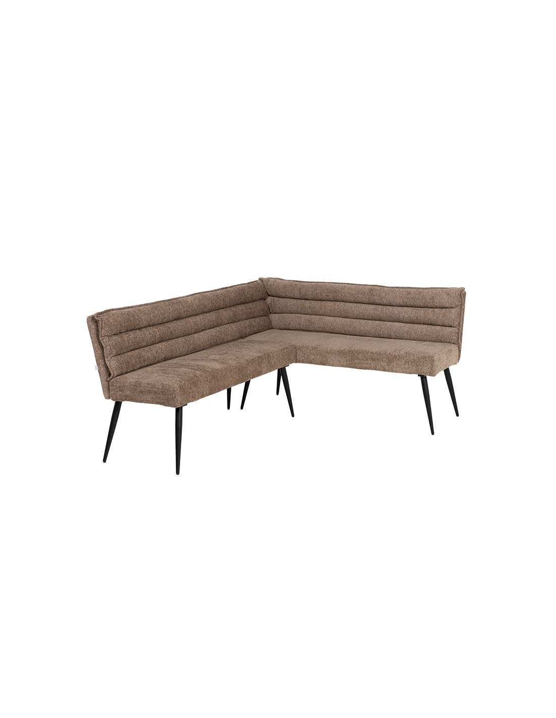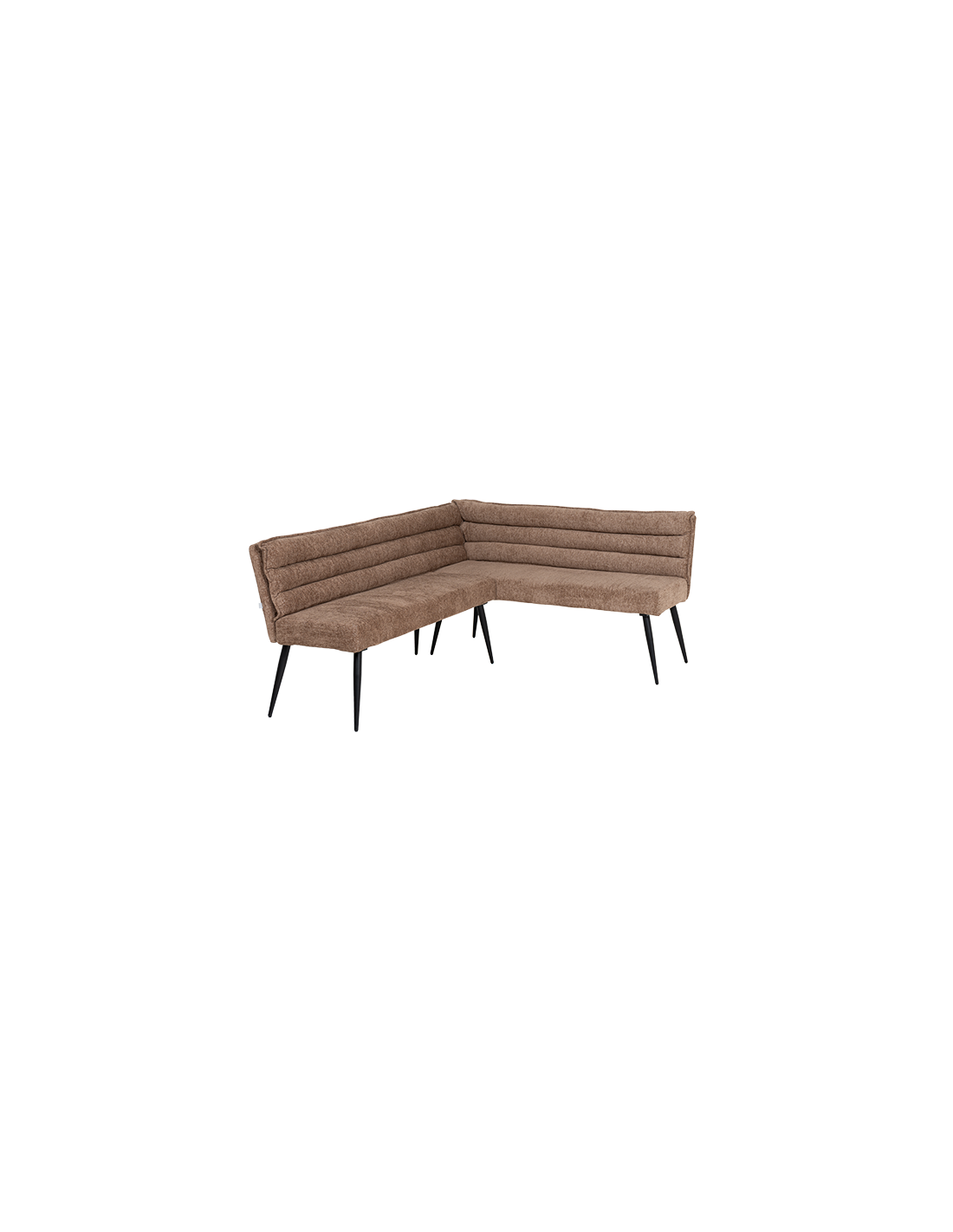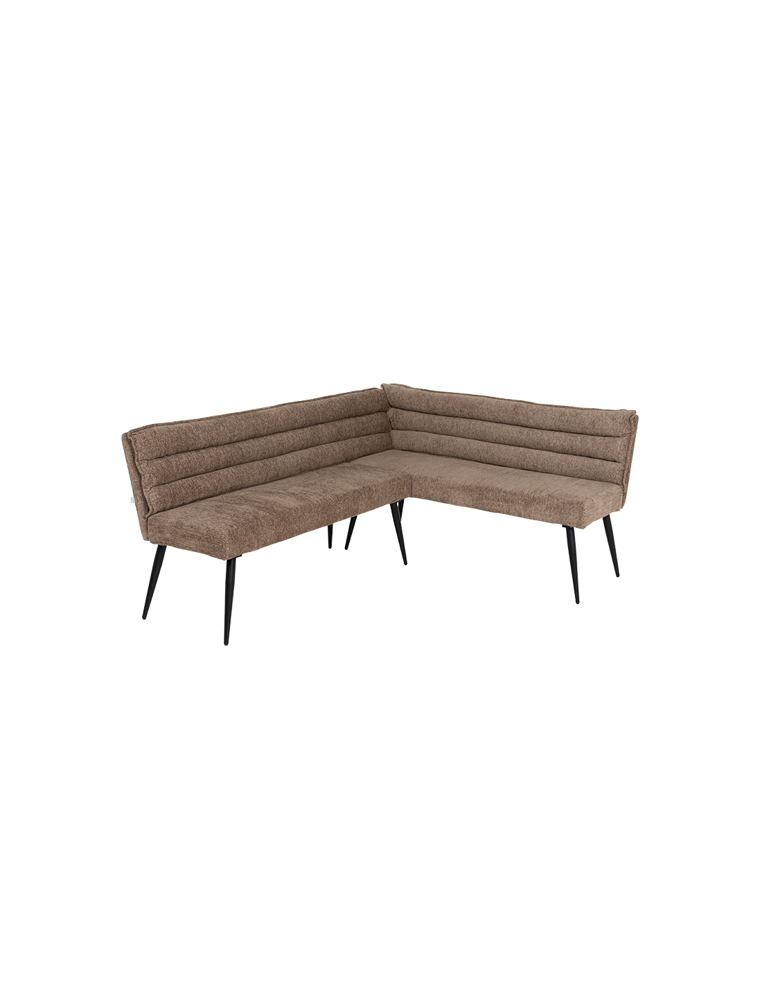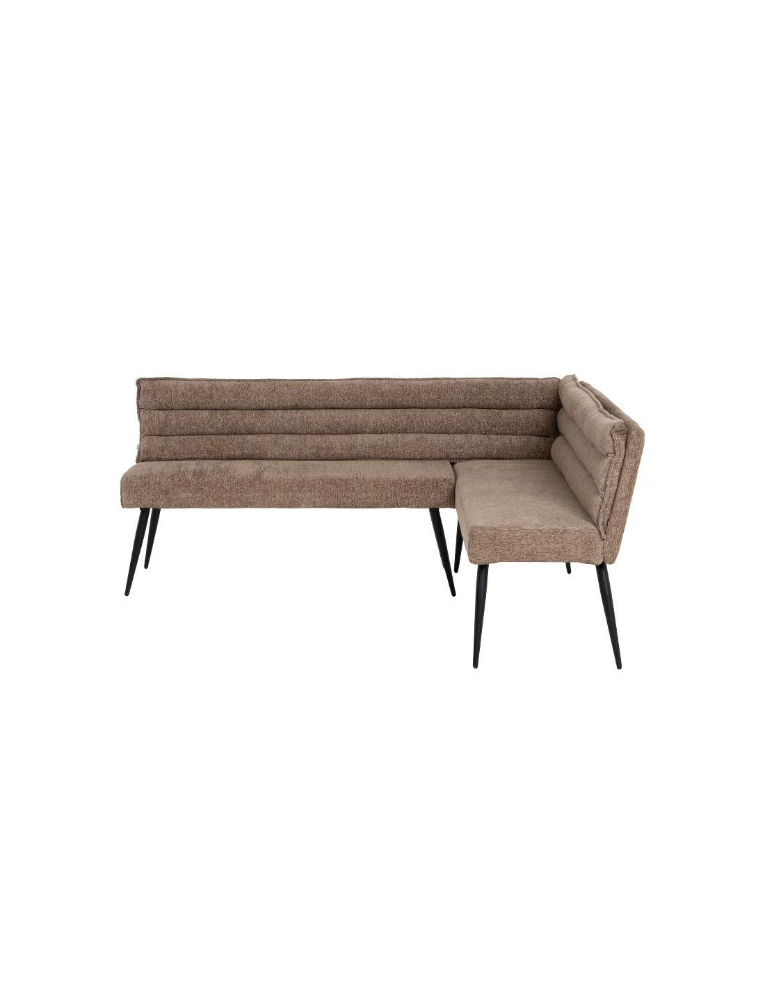 Кухненският ъгъл IKSAN съчетава стил, уют и практичност в едно елегантно решение за трапезарията. Седалката и облегалката са изработени от мека дамаска с пълнеж от полиуретанова пяна и покет пружини, които осигуряват комфорт и стабилна опора при ежедневно ползване. Моделът впечатлява с модерна визия и хоризонтално капитониран дизайн, който допринася за усещане за уют. Здравата основа от праховобоядисан метал в черен цвят гарантира устойчивост и дълготрайност. Пълна информация за размерите и характеристиките на модела ще намерите в таблицата в таб/поле "Техническа информация".