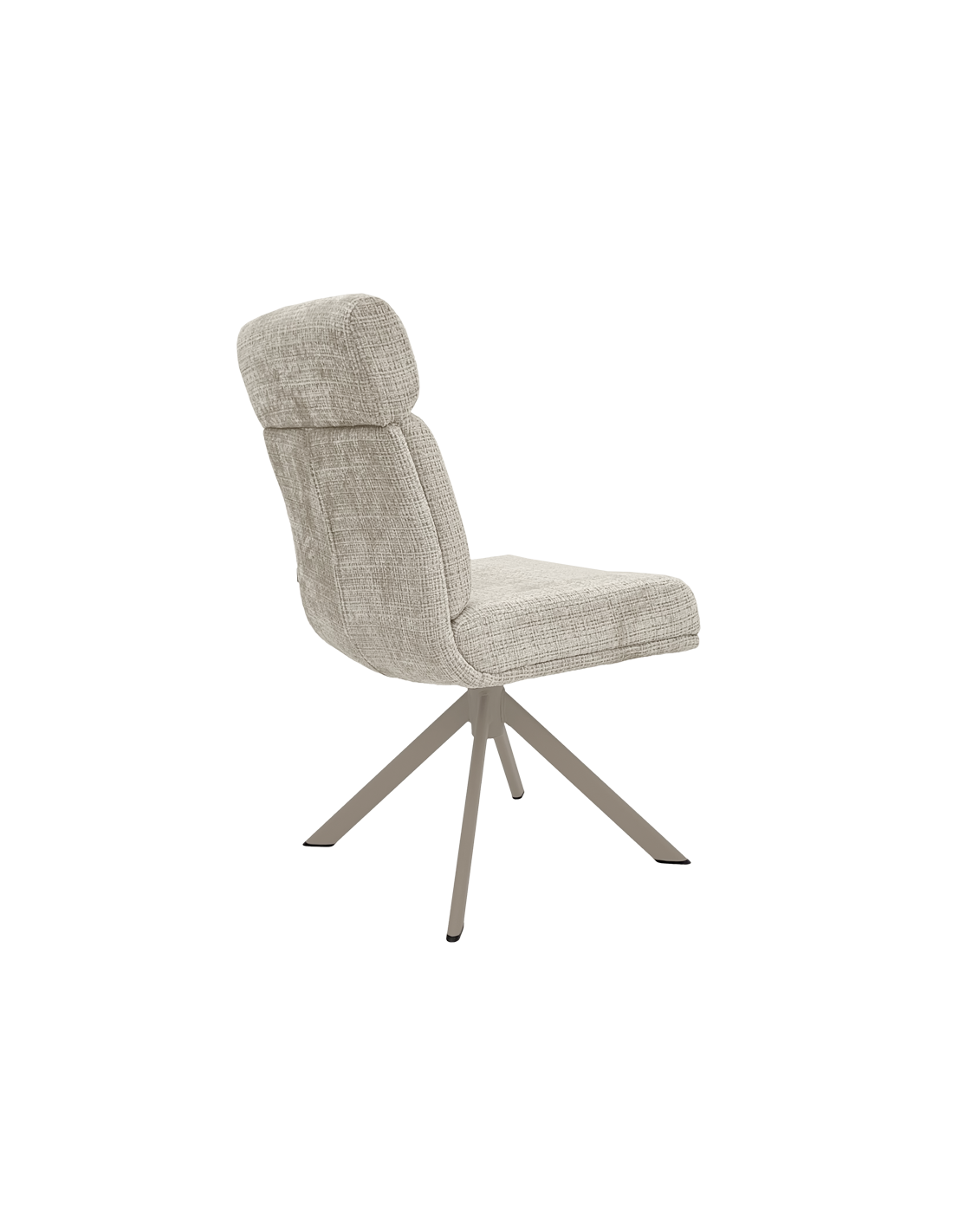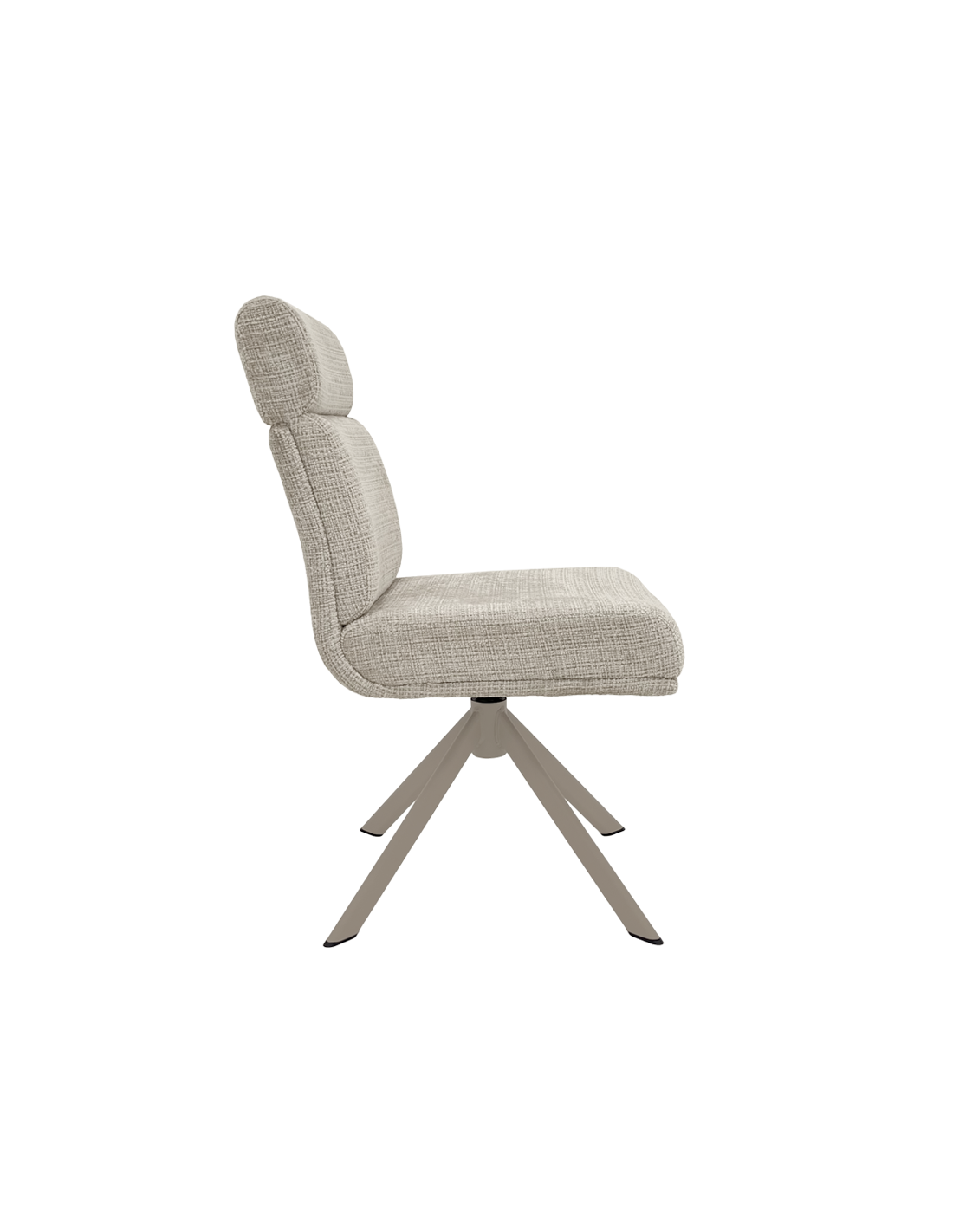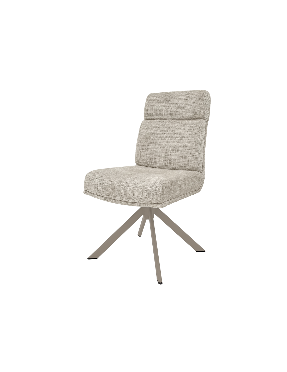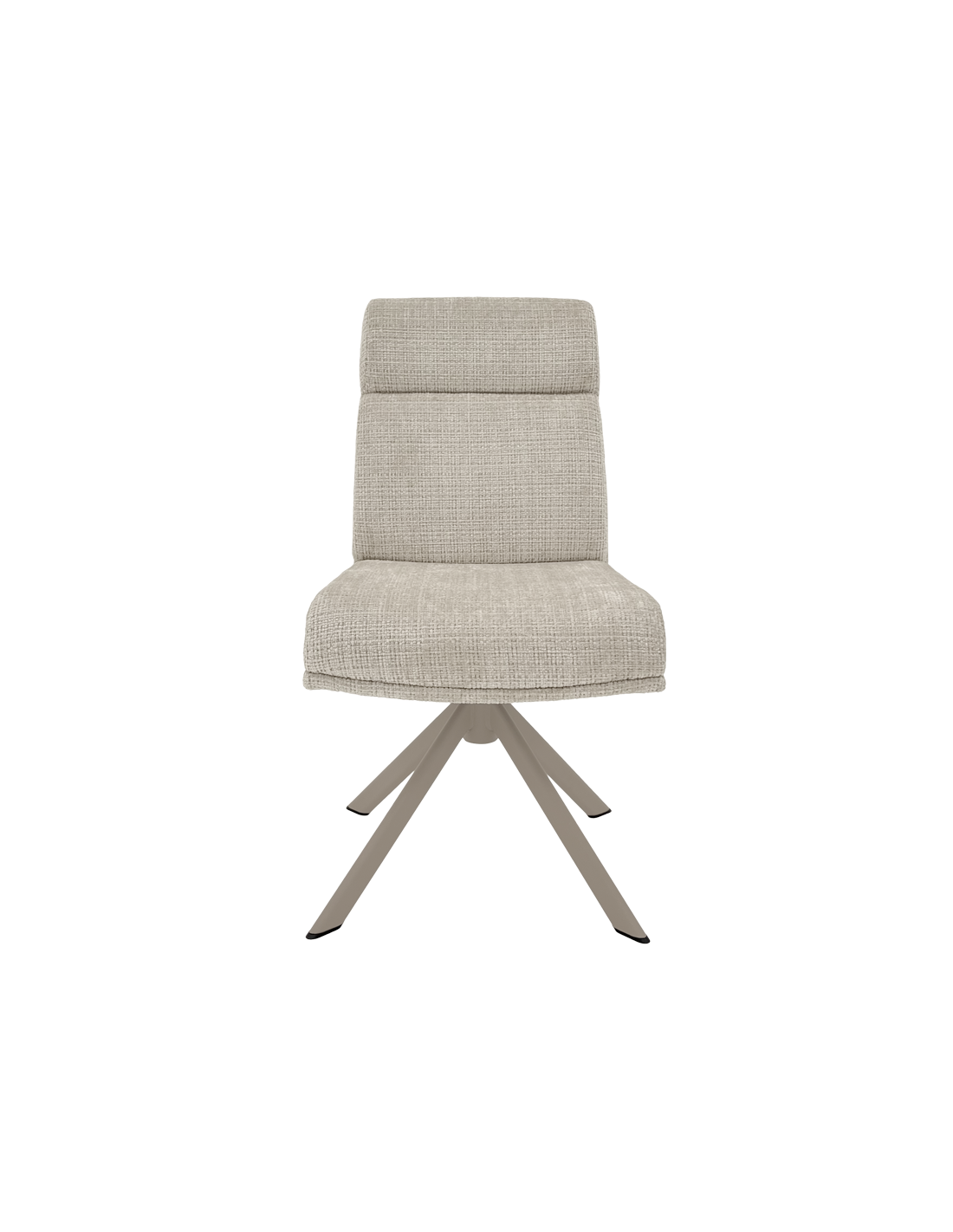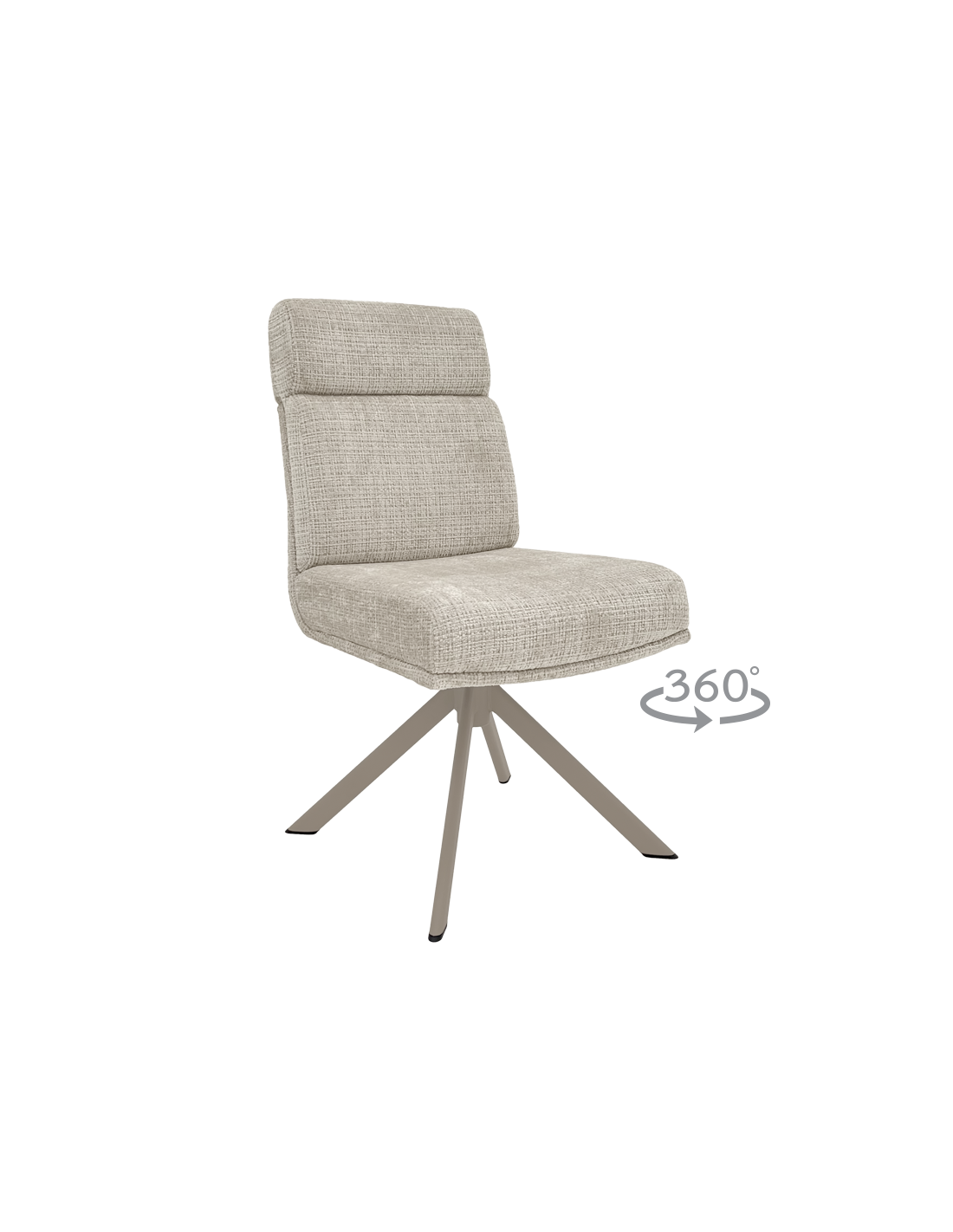 Трапезен стол TURI впечатлява с модерен силует и изключително комфортна седалка от мека дамаска с покет пружини. Основата от праховобоядисан метал в елегантен крем-перла цвят придава лек и изискан характер. Моделът разполага с 360° въртене, автоматично връщане в изходна позиция и дискретна люлееща функция, осигуряващи допълнителна свобода и удобство при сядане. Подходящ избор за съвременни трапезни кътове и стилно модерни интериори. Пълна информация за размерите и характеристиките на модела ще намерите в таблицата в таб/поле "Техническа информация".