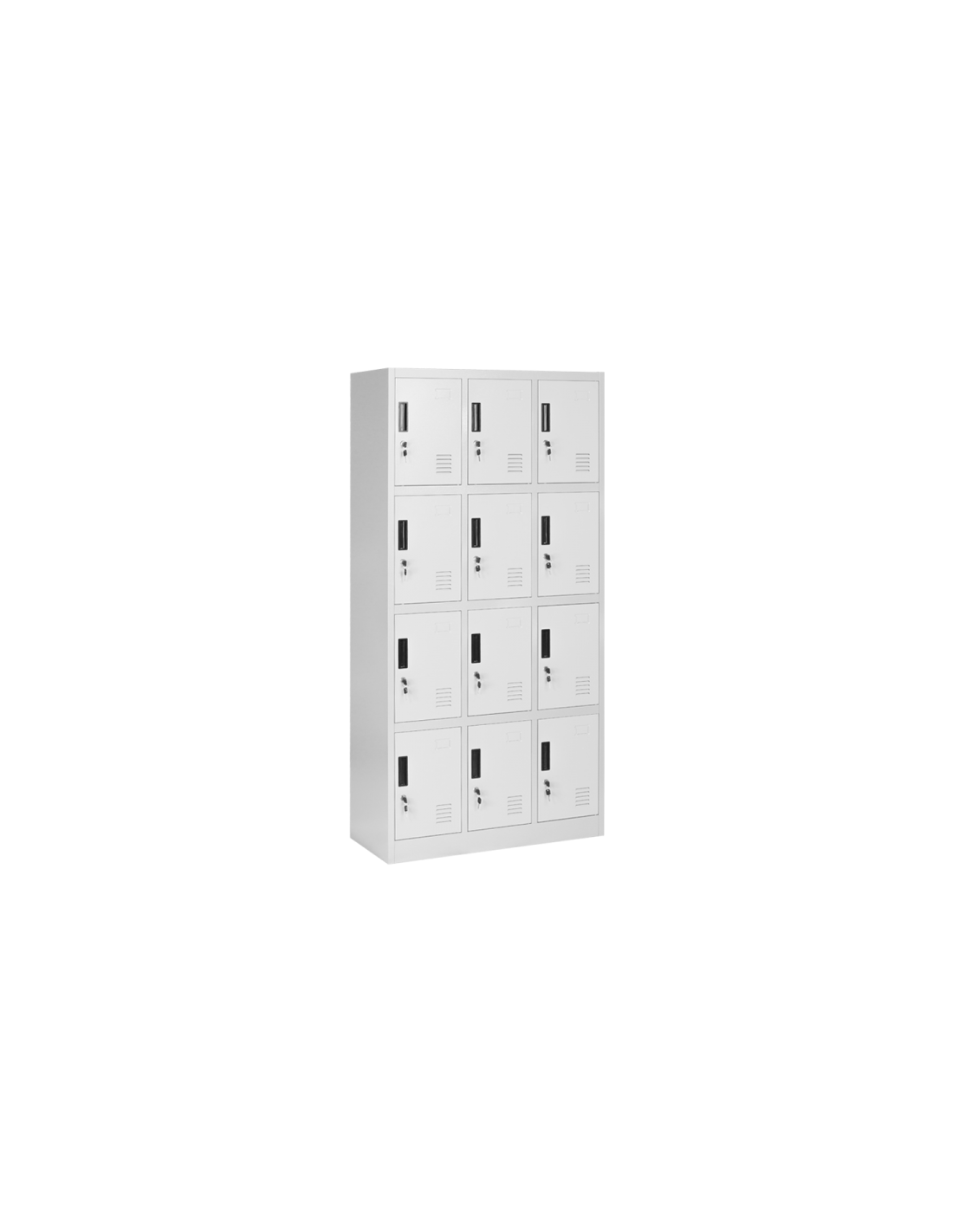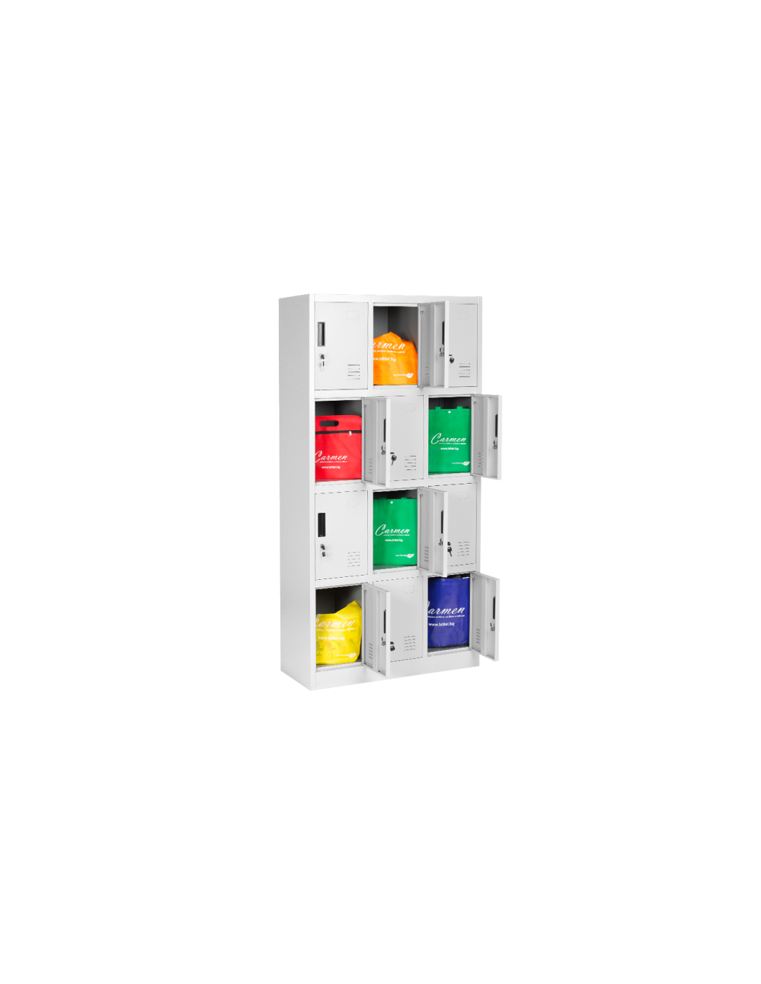 Металният шкаф Carmen CR-1274 J се състои от 9 отделения за съхранение на багаж. Моделът е изработен от прахово боядисан метал с гладко покритие. На вратите има вентилационен отвор и място за поставяне на етикет. Шкафчетата се затварят посредством заключващ механизъм с помощта на катинар. Катинарите не са включени в цената.