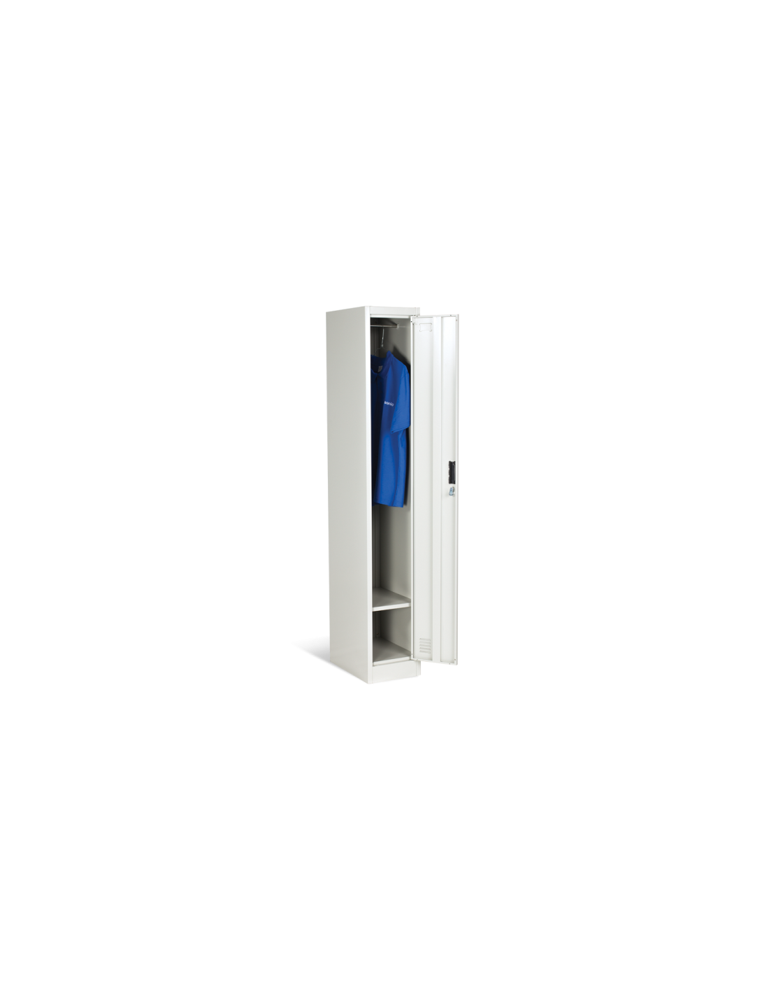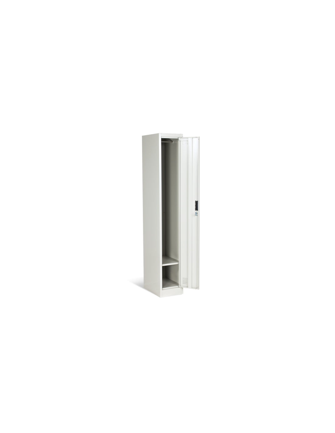 Металният шкаф за съблекалня Carmen CR-1242-1 ЕL е единичен гардероб с 1 рафт, 1 лост за закачалки и възможност за заключване. Системата от метални мебели на Carmen включва офис контейнери, метални гардероби за съблекалня, метални контейнери, метални шкафове за документи, кардекс и други.