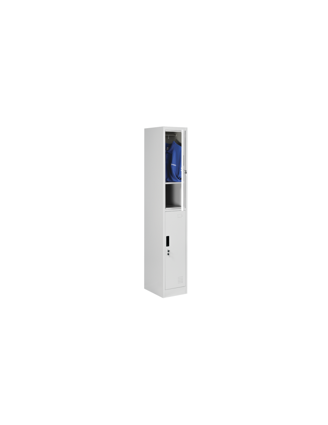 Метален шкаф Carmen CR-1257 J Метален шкаф Carmen CR-1257 J е удобен и практичен метален гардероб, подходящ за съхранение на дрехи, обувки и лични вещи. Широко приложение намира в интериора на съблекални в спортни зали, фитнес центрове, търговски сгради и помещения. Моделът се състои от две отделения, в които са разположени по един рафт и един лост за закачалки. Вентилационните отвори на вратичките осигуряват нужното проветрение и не позволяват задържането на неприятни миризми и образуването на влага. Сигурността и неприкосновеността на съдържанието се дължи на изключително надеждните заключващи механизми. За по-голямо удобство и улеснение е предвидено място за поставяне на обозначителен етикет на всяка вратичка. Стабилната метална конструкция е прахово боядисана в сив цвят. Благодарение на класическия си стилен дизайн, метален шкаф Carmen CR-1257 J лесно се вписва към всяко офис обзавеждане. |