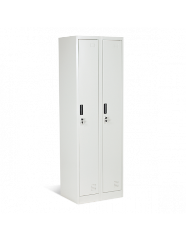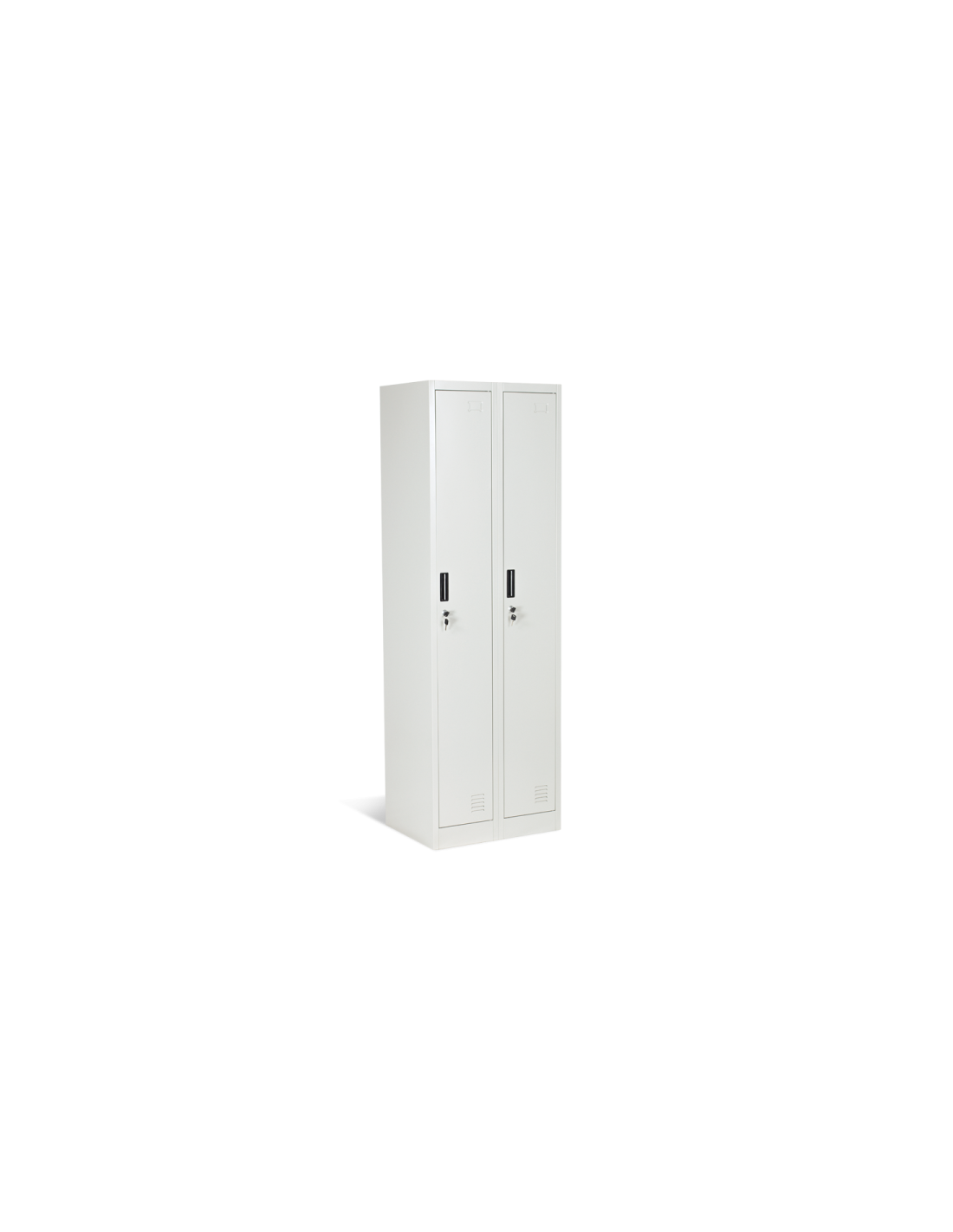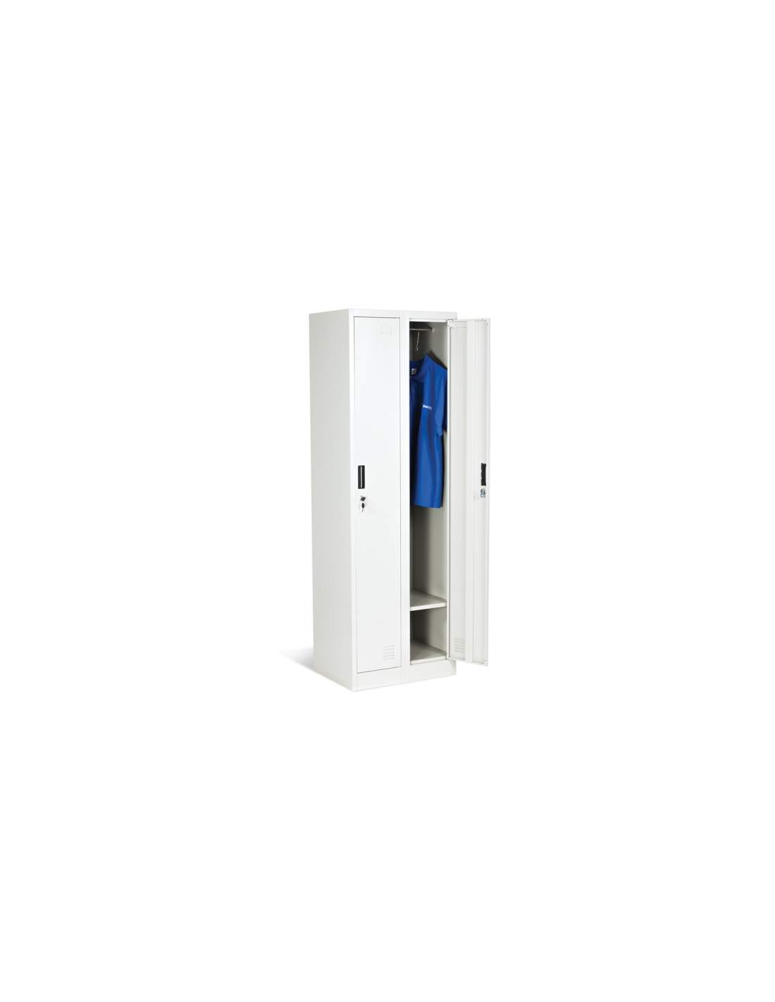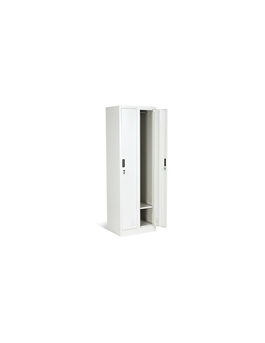 Металният шкаф Carmen CR-1242-2 J е компактен гардероб с 2 врати със заключване и вентилационен отвор. Моделът е с 2 лоста за закачалки и 2 рафта, всеки от които може да издържи натоварване до 40 кг. Размери: ш. 60 см / д. 45 см / в.185 см.