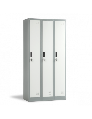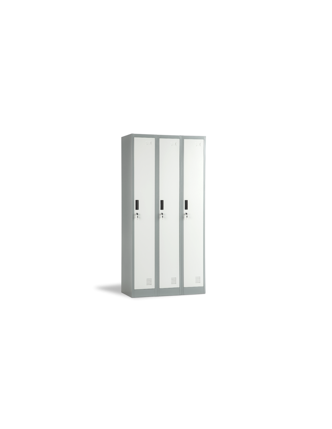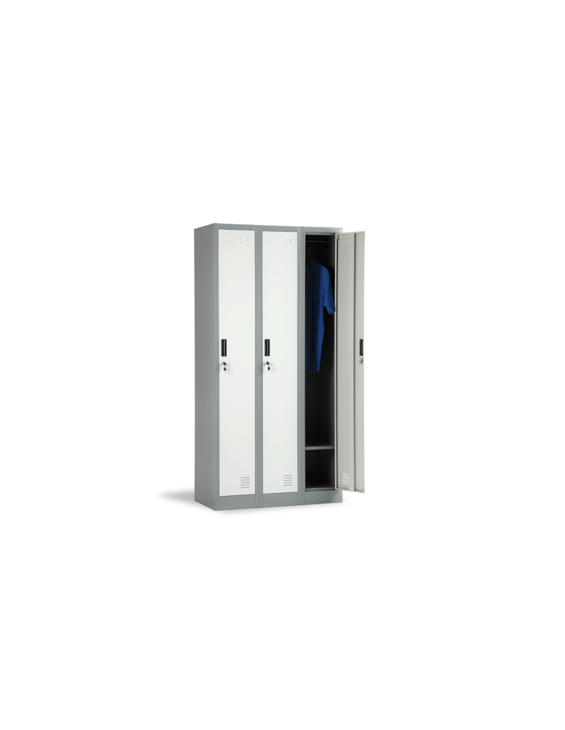 Металният шкаф Carmen CR-1242 J LUX е оборудван с три врати, три вътрешни рафта и механизъм за заключване. Вратите имат вентилационни отвори и предвидено място за поставяне на етикети. Системата от метални мебели Carmen предлага разнообразие от решения за офис и съблекални – включително контейнери, гардероби, шкафове за документи, кардекси и други модели.