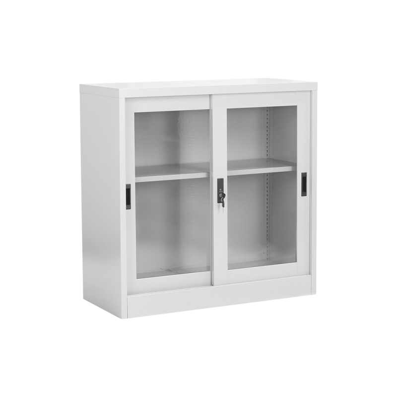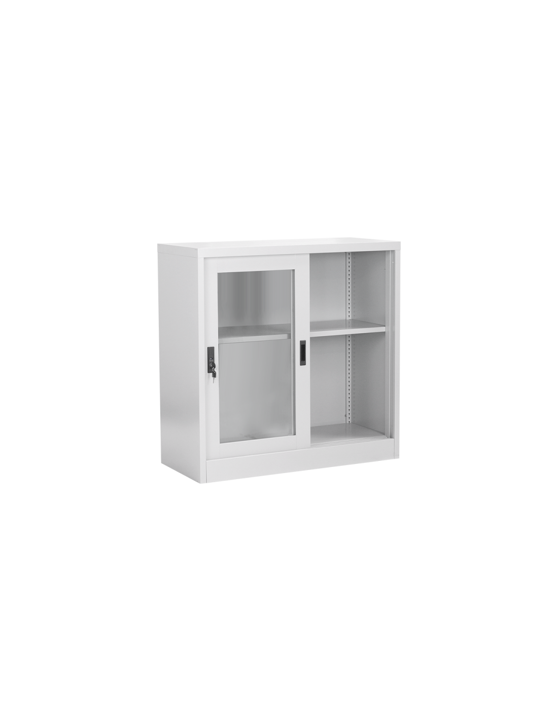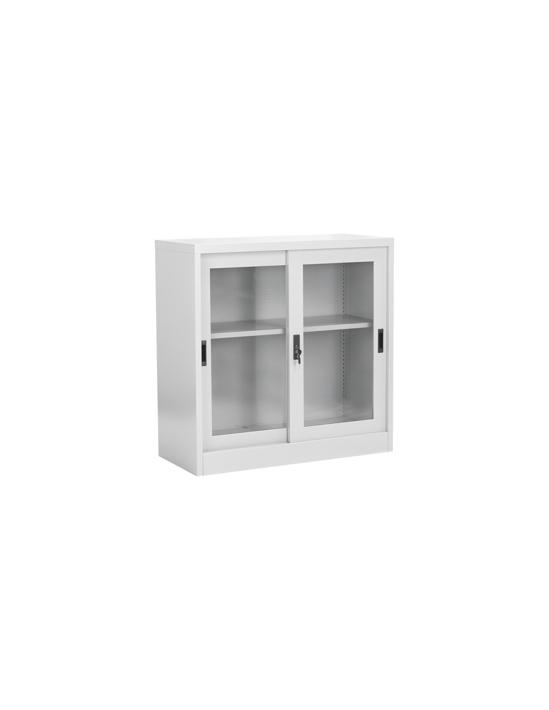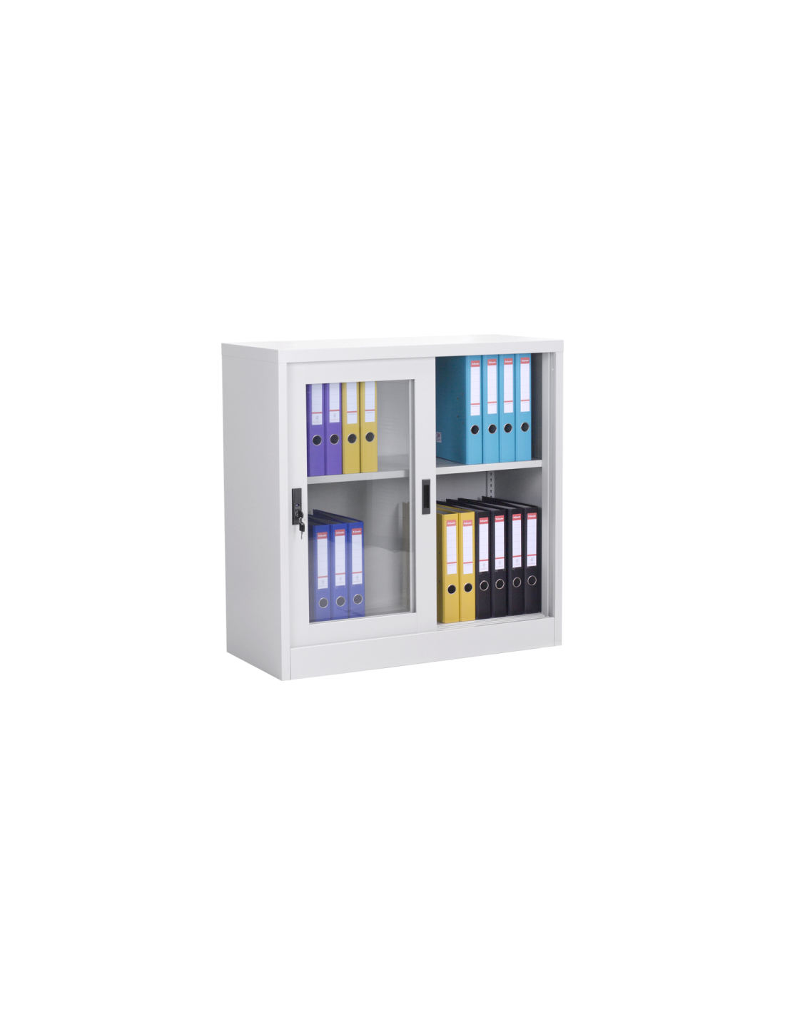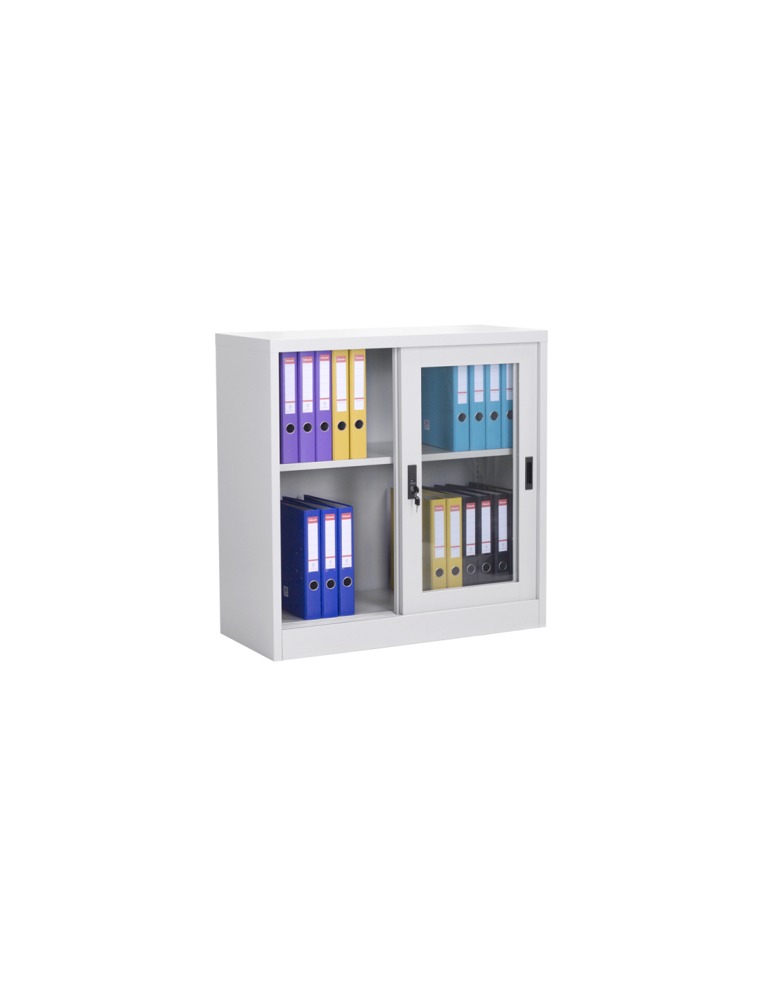 Металният шкаф Carmen CR-1234 Е е идеално решение за съхранение на документи в офиса. Моделът е с 2 врати, които се заключват и 2 рафта с регулируема височина, всеки от които има товароносимост до 40 кг. Размери: ш. 90 см / д. 40 см / в.130 см.