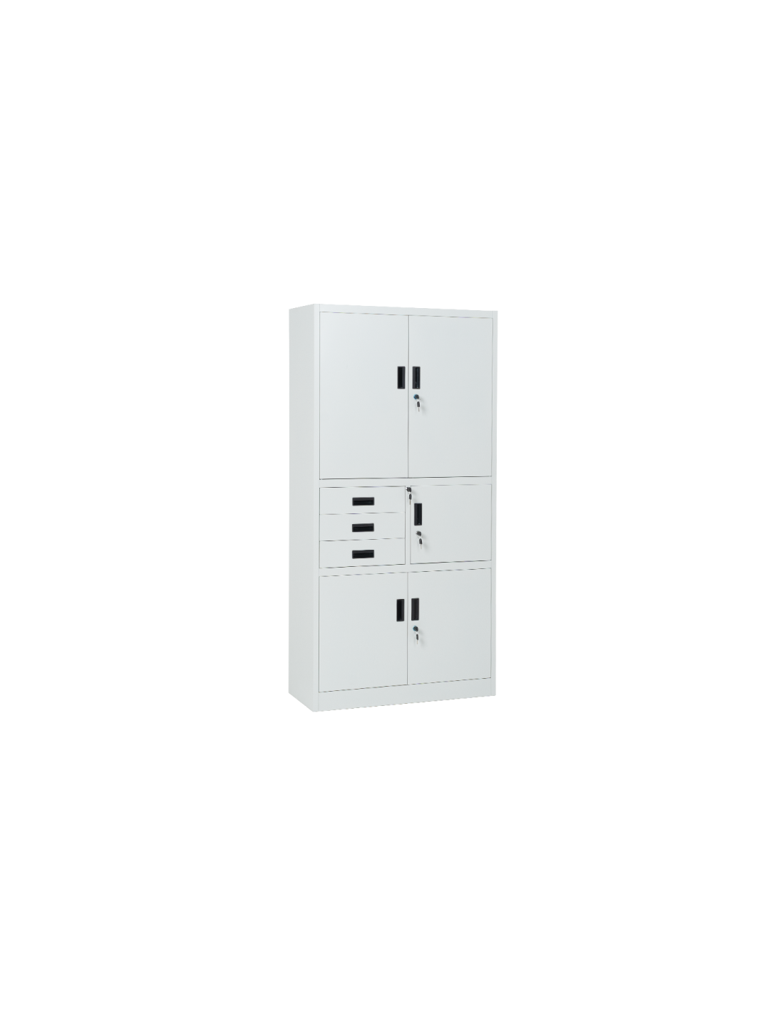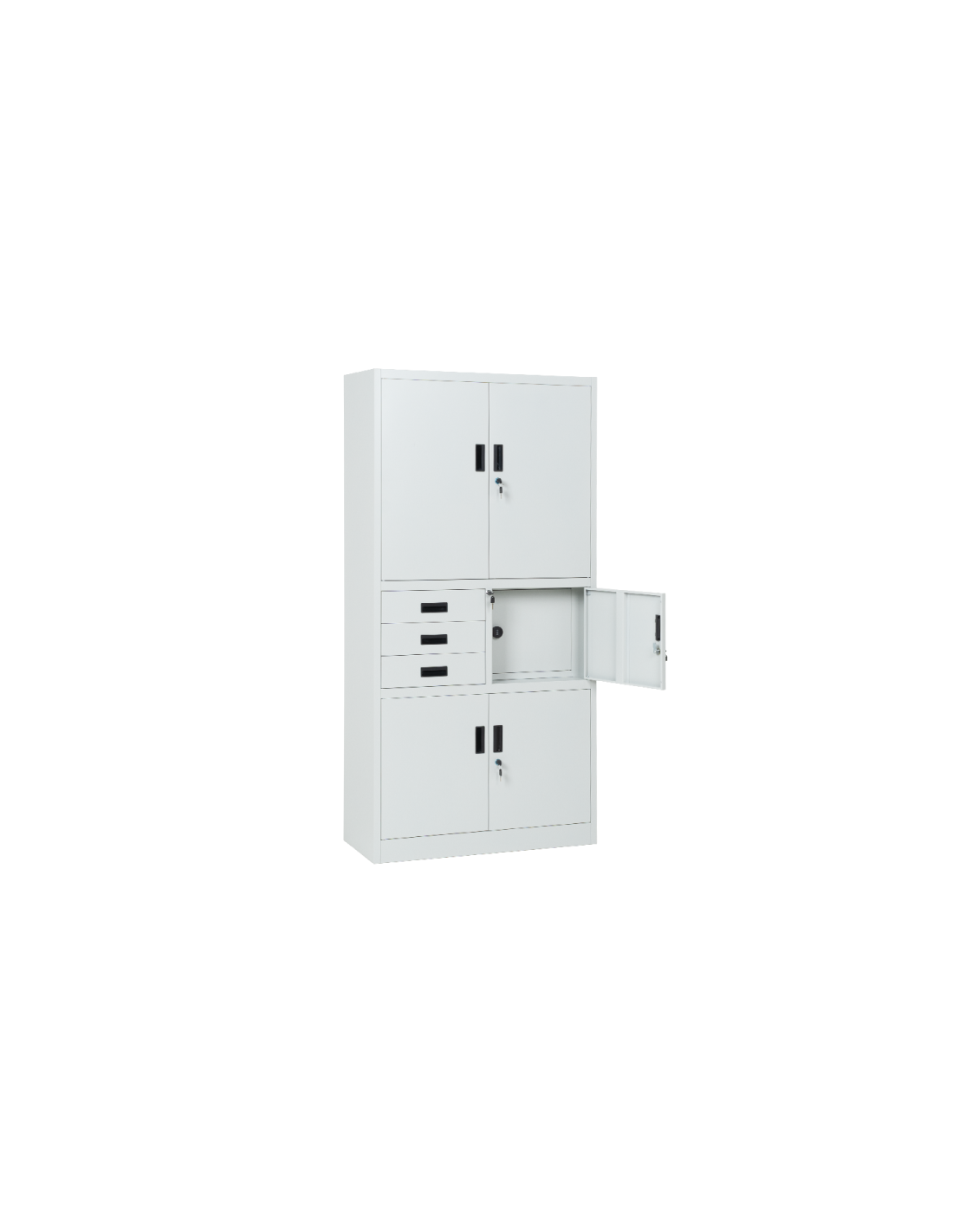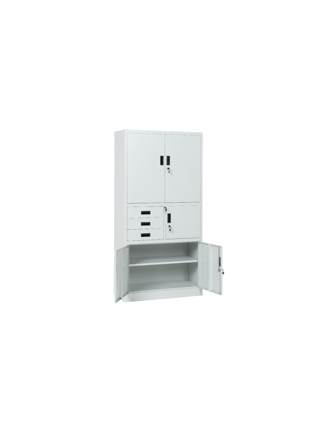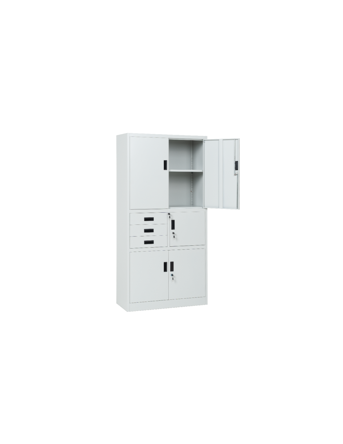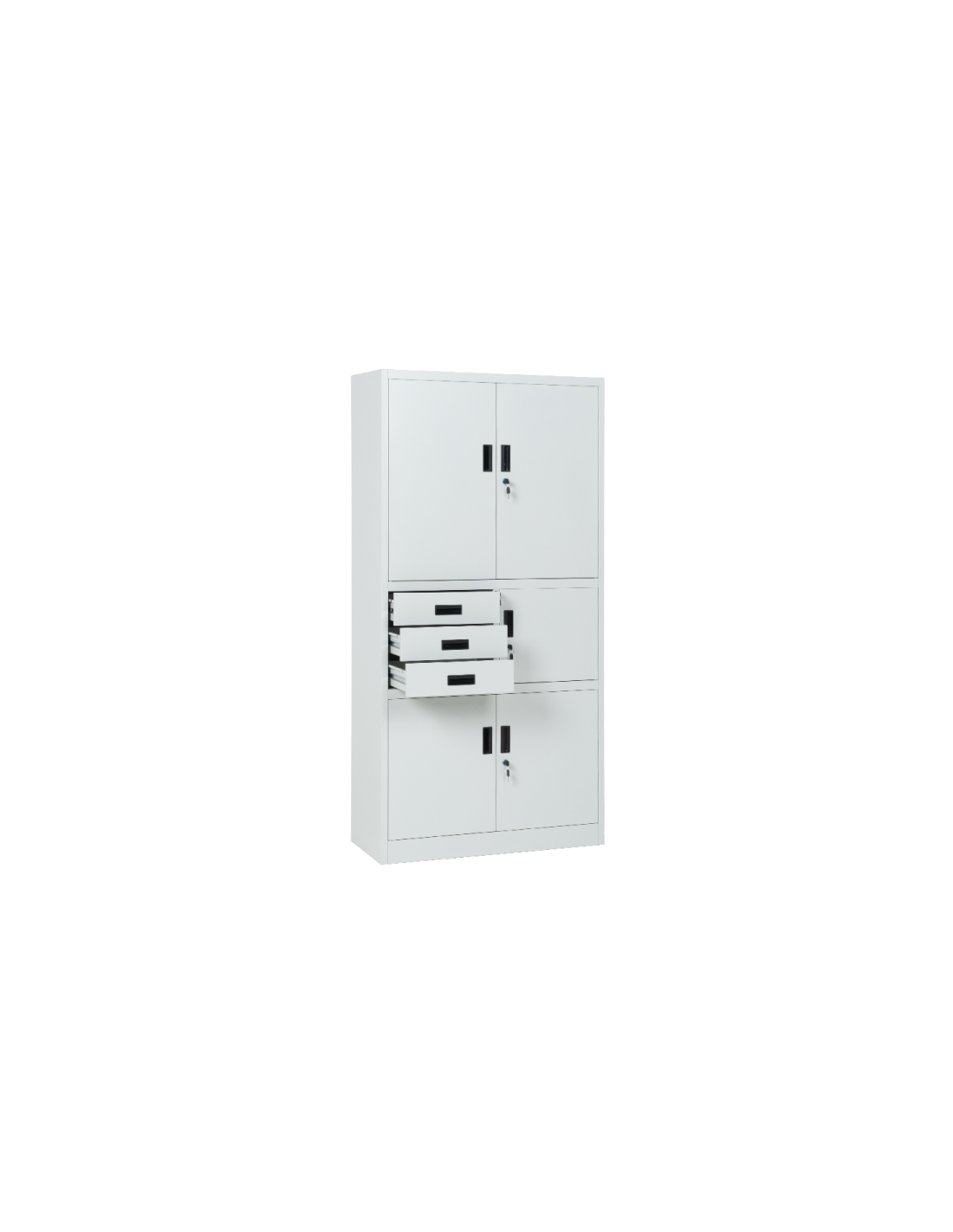 Carmen CR-1281 E K е метален шкаф за документи с удобно разпределение от две отделни шкафчета, 3 чекмеджета с общо заключване и 1 сейф. Всяко шкафче разполага с един рафт с регулируема височина и плътни врати със заключване.