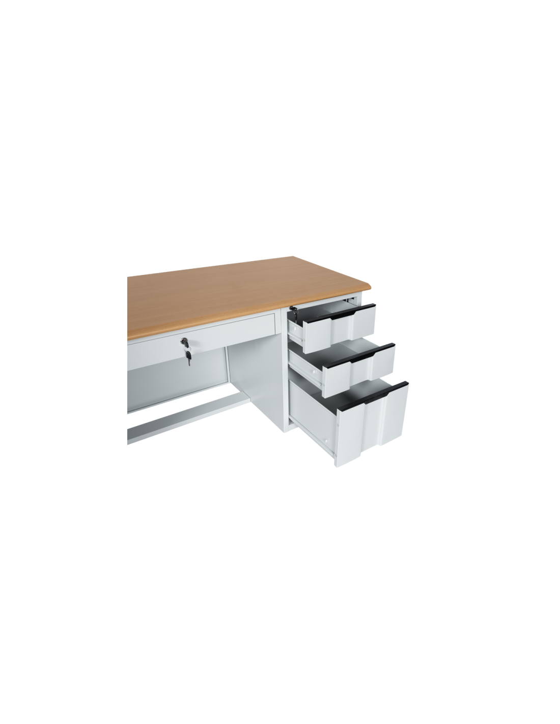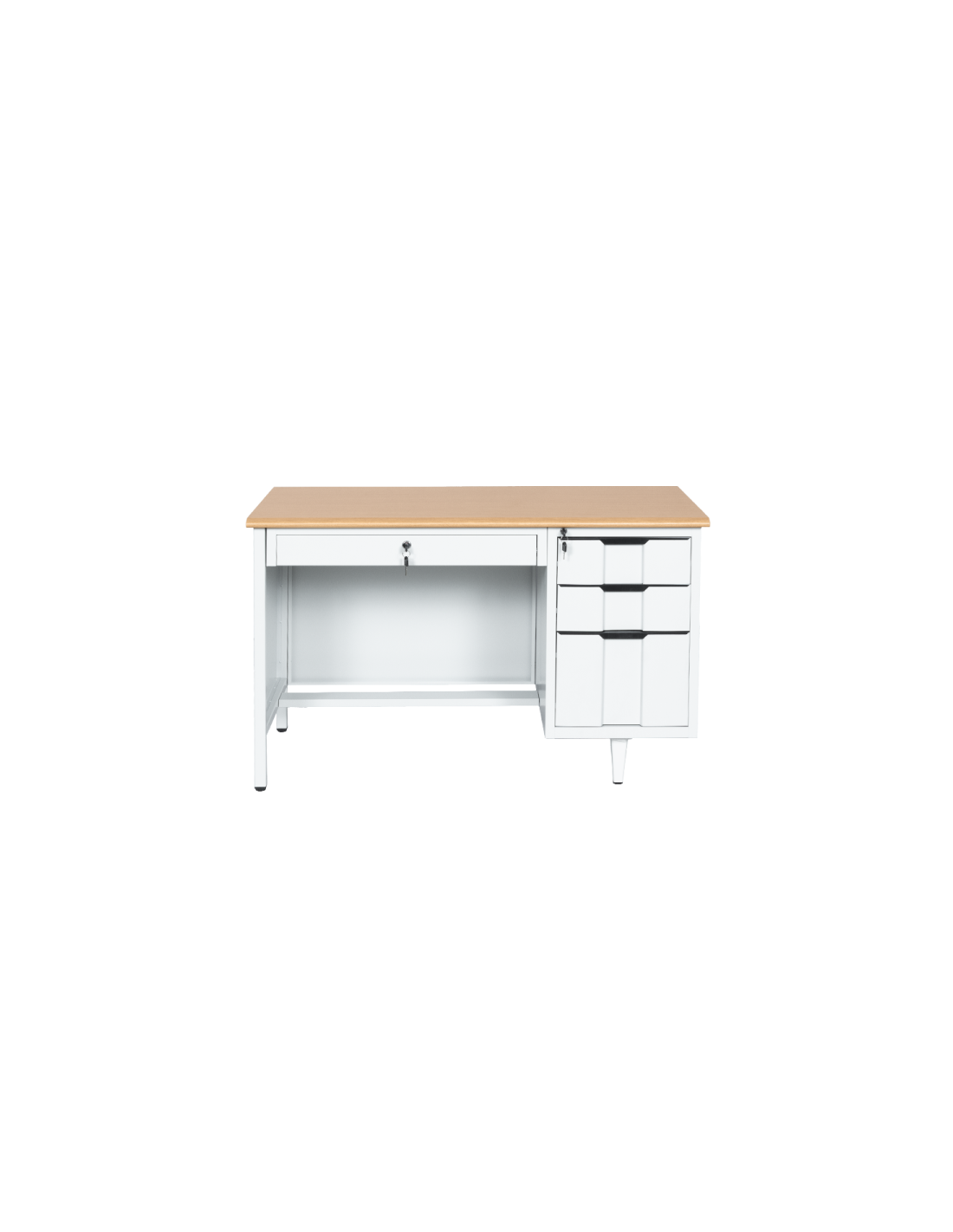 Бюрото Carmen CR-1310 K съчетава здравина и функционалност в изчистен, професионален дизайн. Конструкцията е изработена от праховобоядисан метал, а плотът е от MDF с меламиново покритие и дебелина 25 мм – стабилен и устойчив на натоварване. Моделът разполага с общо 4 чекмеджета, включително широко централно, като всички са оборудвани със заключване за по-добра сигурност на документите и вещите. На гърба са предвидени дискретни отвори за организиране на кабели, което го прави подходящо за офис, учебна среда или домашен работен кът.