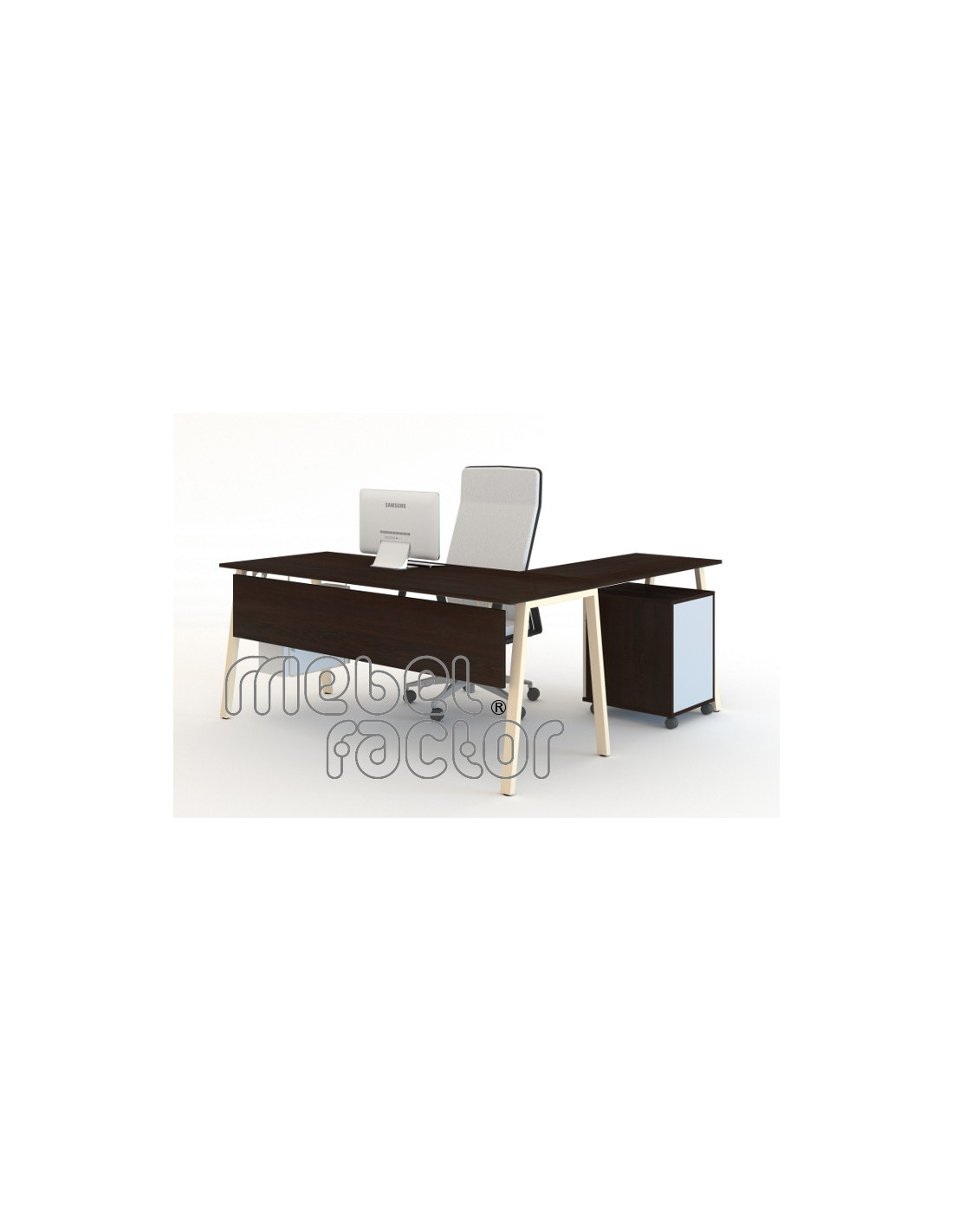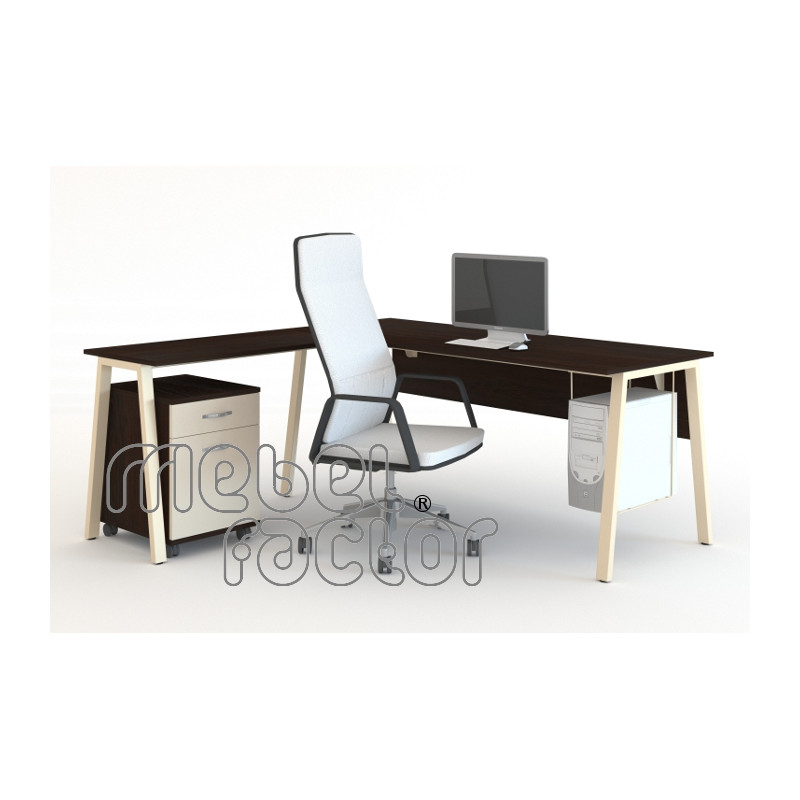 Плотове 18мм ламинирано ПДЧ с кант 2мм. Декори на ЛПДЧ от фирмения картел. Конструкция от правоъгълен профил 50х30мм. Нивелирани винтови стъпки. Полимерно прахово покритие в цветове на RAL. Тази композиция съдържа: 130 407181 Бюро ЕЛЕГАНТ 180х70см с лицев панел. 130 415100 Помощно бюро ЕЛЕГАНТ 100х50см. 131 112632 Подвижен офис контейнер с шкаф и чекмедже. 131 290050 Висящ носач за компютър.