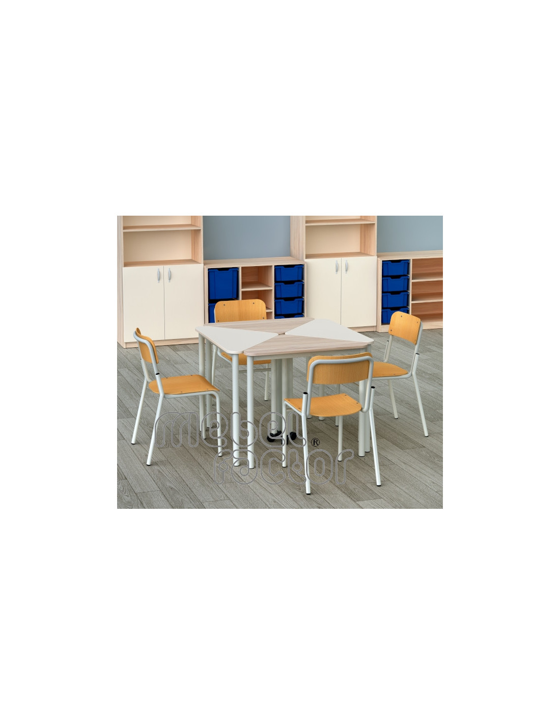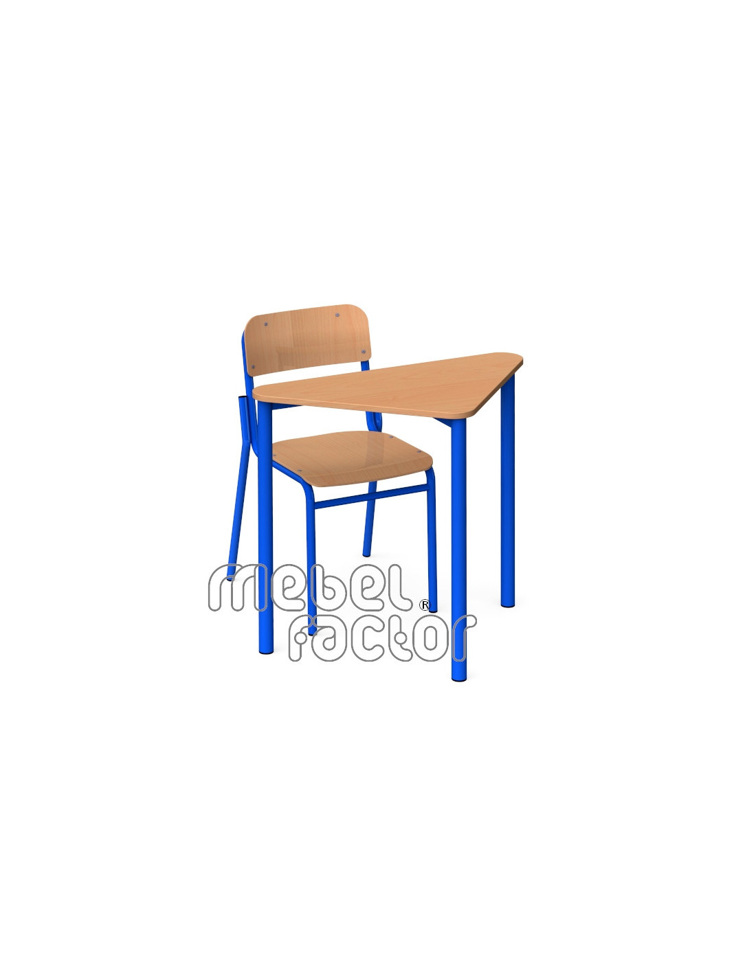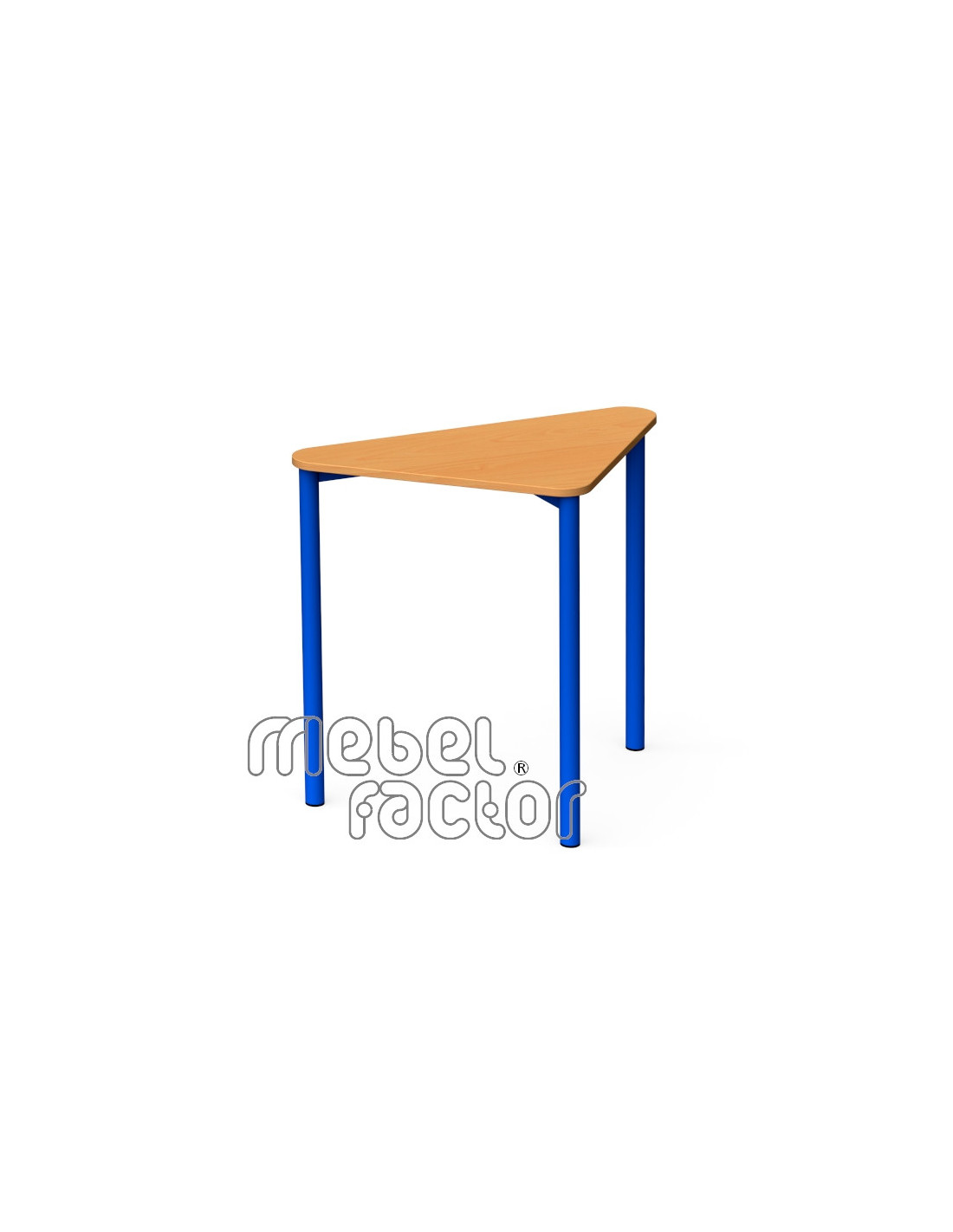 Ученическа, модулна маса ТРИА, размер 6. Удобна за самостоятелна и групова работа. Маса за малки учебни зали с плот осигуряващ достатъчно пространство. Триъгълната форма на плота позволява комбиниране в групи от 2 и 4 броя маси, или в редица. Подходяща за възраст над 14 години. Плот с размери 82х47/Н76см., кант 2,0мм. Декори на ламинирано ПДЧ от фирмения картел. Заварена конструкция с крака от тръба 40мм. Царги от правоъгълен профил 40х20мм. Полимерно, прахово покритие в цветове по RAL. Произведено в България. Продуктът отговаря на стандарт БДС EN 1729 - "Мебели. Столове и маси за учебни заведения."
