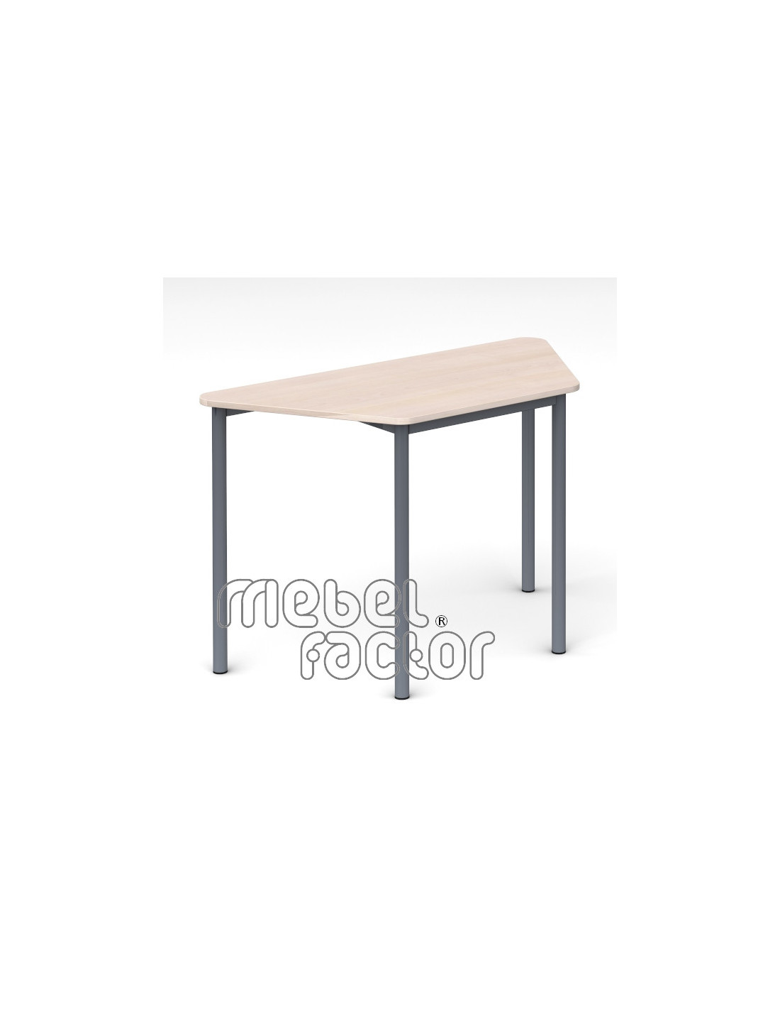 Ученическа модулна маса РОНДО, размер 6. Подходяща за възраст над 14 години. Трапецовиден плот с размери 120х58см./Н76см, кант 2,0мм. Дължина на горната основа и бедрата на трапеца - 60см. Обезопасени, заоблени ъгли на плота. Декори на ламинирано ПДЧ от фирмения картел. Заварена конструкция с крака от тръба 40мм. Царги от правоъгълен профил 40х20мм. Полимерно, прахово покритие в цветове по RAL. Произведено в България. Продуктът отговаря на стандарт БДС EN 1729 - "Мебели. Столове и маси за учебни заведения."