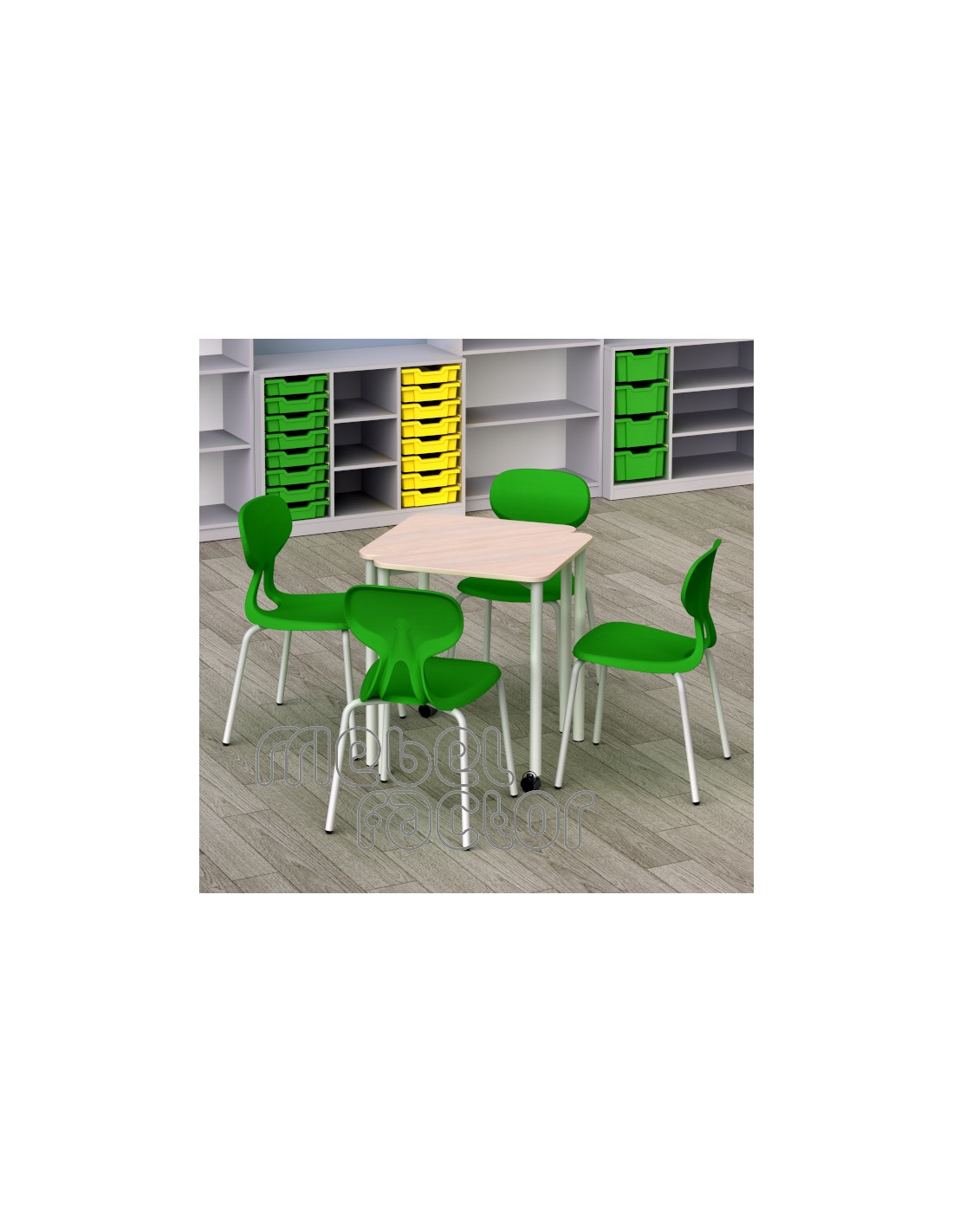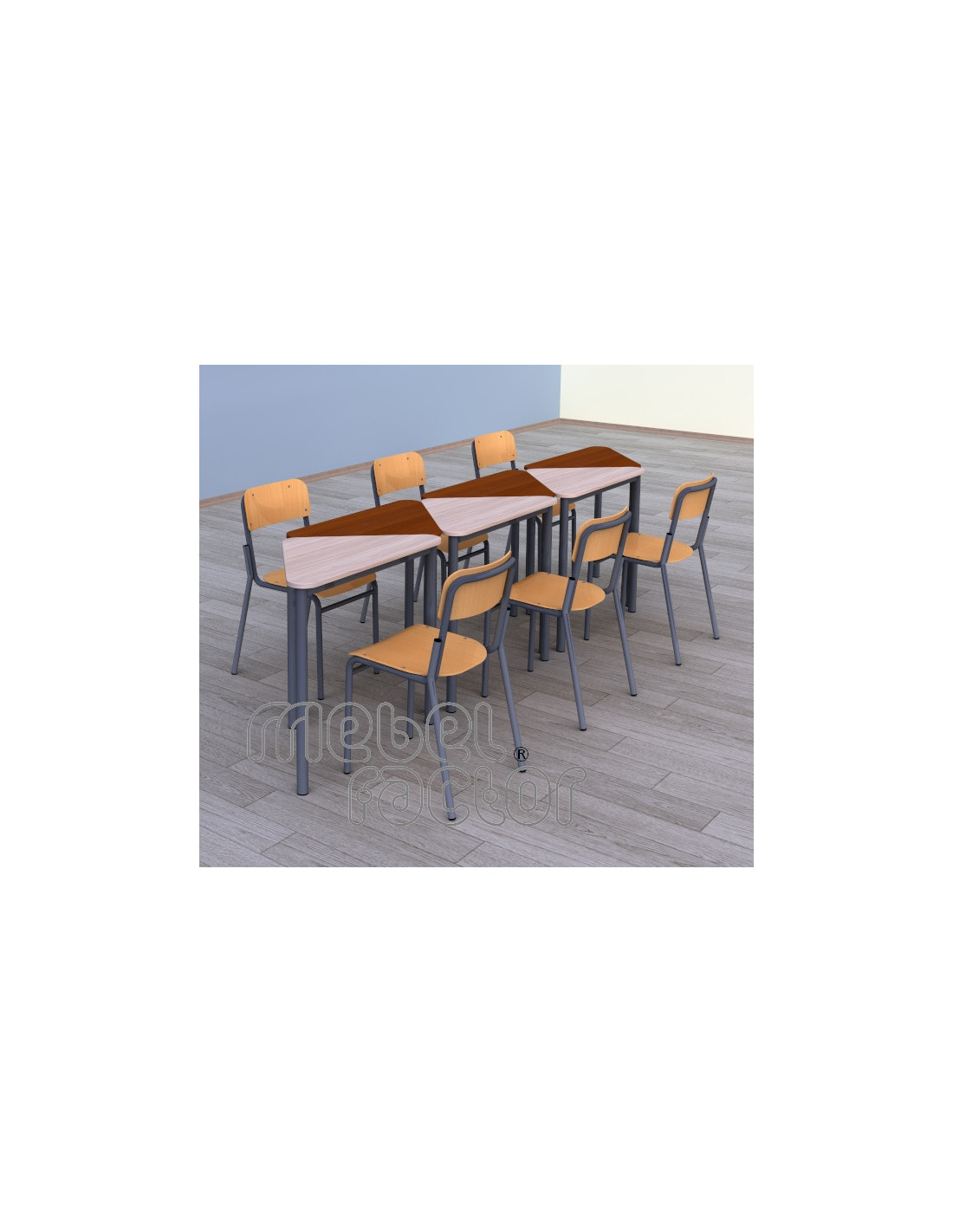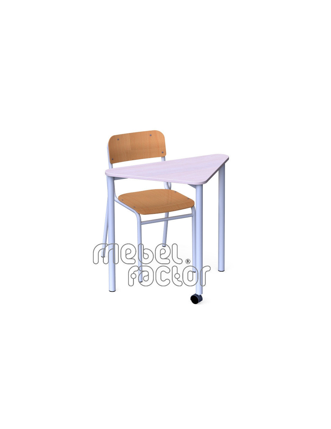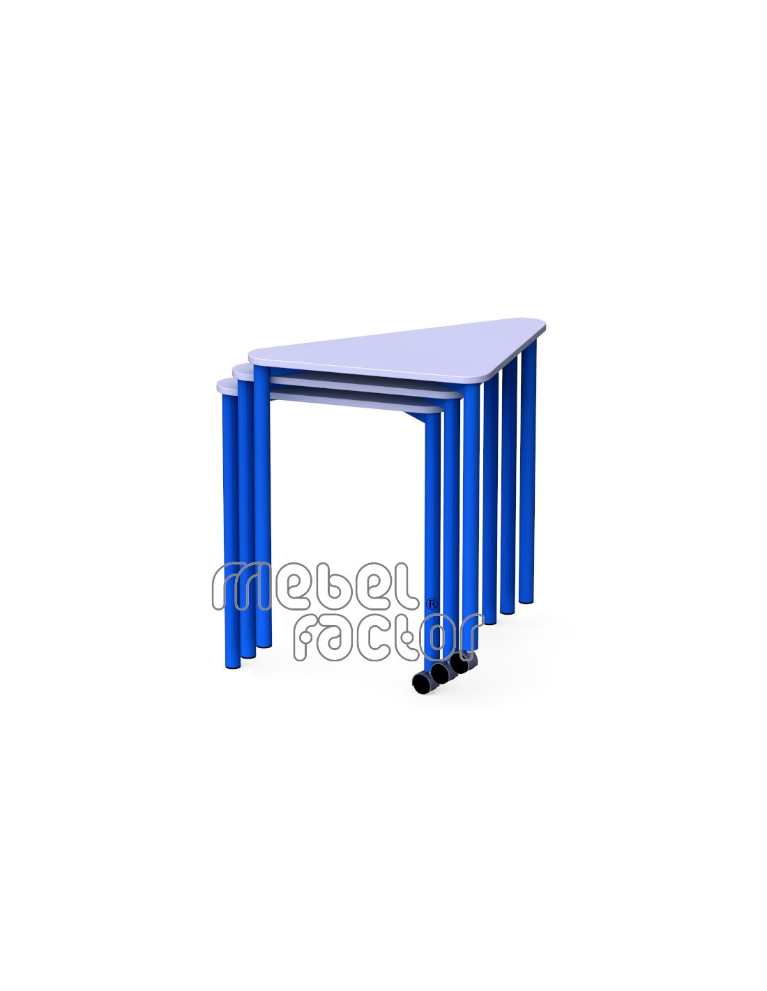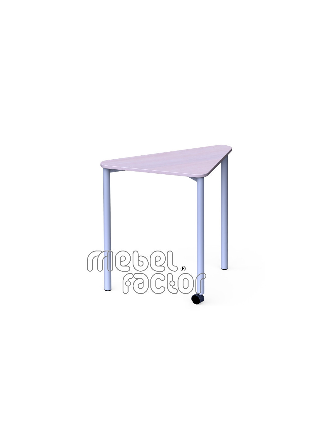 Подвижна, модулна маса ТРИА, размер 5. Удобна за самостоятелна и групова работа. Маса за малки учебни зали с плот осигуряващ достатъчно пространство. Триъгълната форма на плота позволява комбиниране в групи от 2 и 4 броя маси, или в редица. Придвижване на колело с фиксиращ механизъм. Подходяща за възраст от 11 до 14 години. Плот с размери 82Х47/Н71см., кант 2,0мм. Декори на ламинирано ПДЧ от фирмения картел. Заварена конструкция с крака от тръба 40мм. Царги от правоъгълен профил 40х20мм. Полимерно, прахово покритие в цветове по RAL. Произведено в България. Продуктът отговаря на стандарт БДС EN 1729 - "Мебели. Столове и маси за учебни заведения."