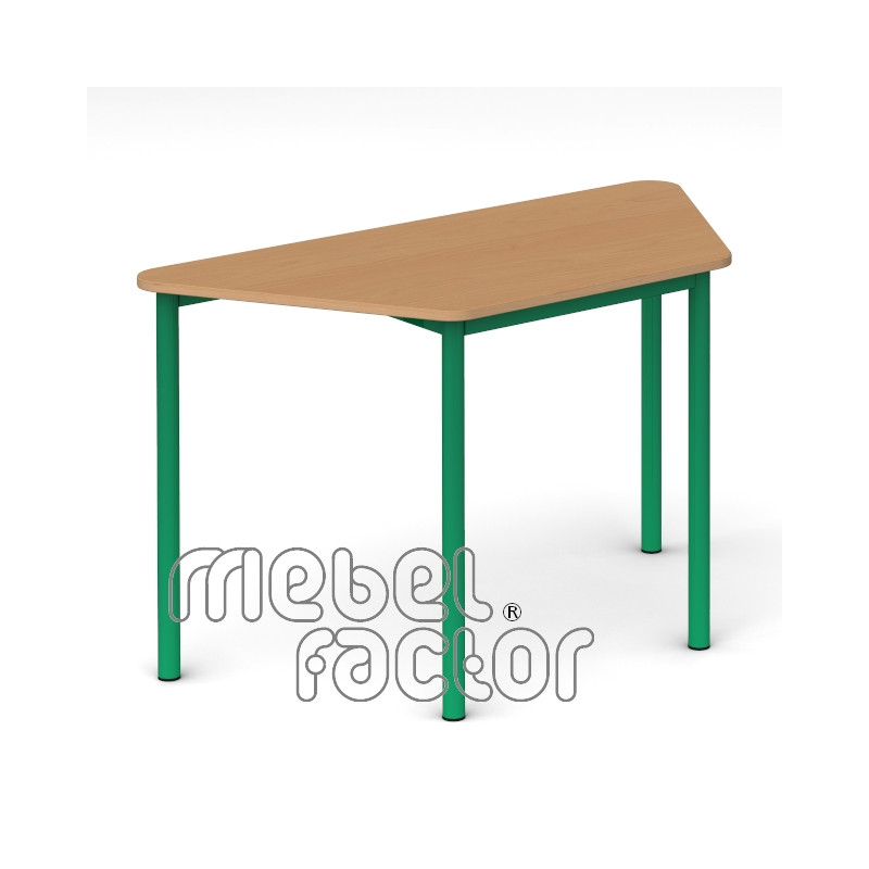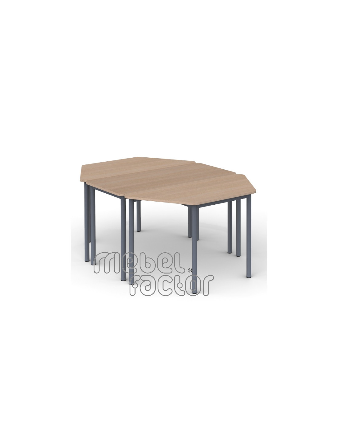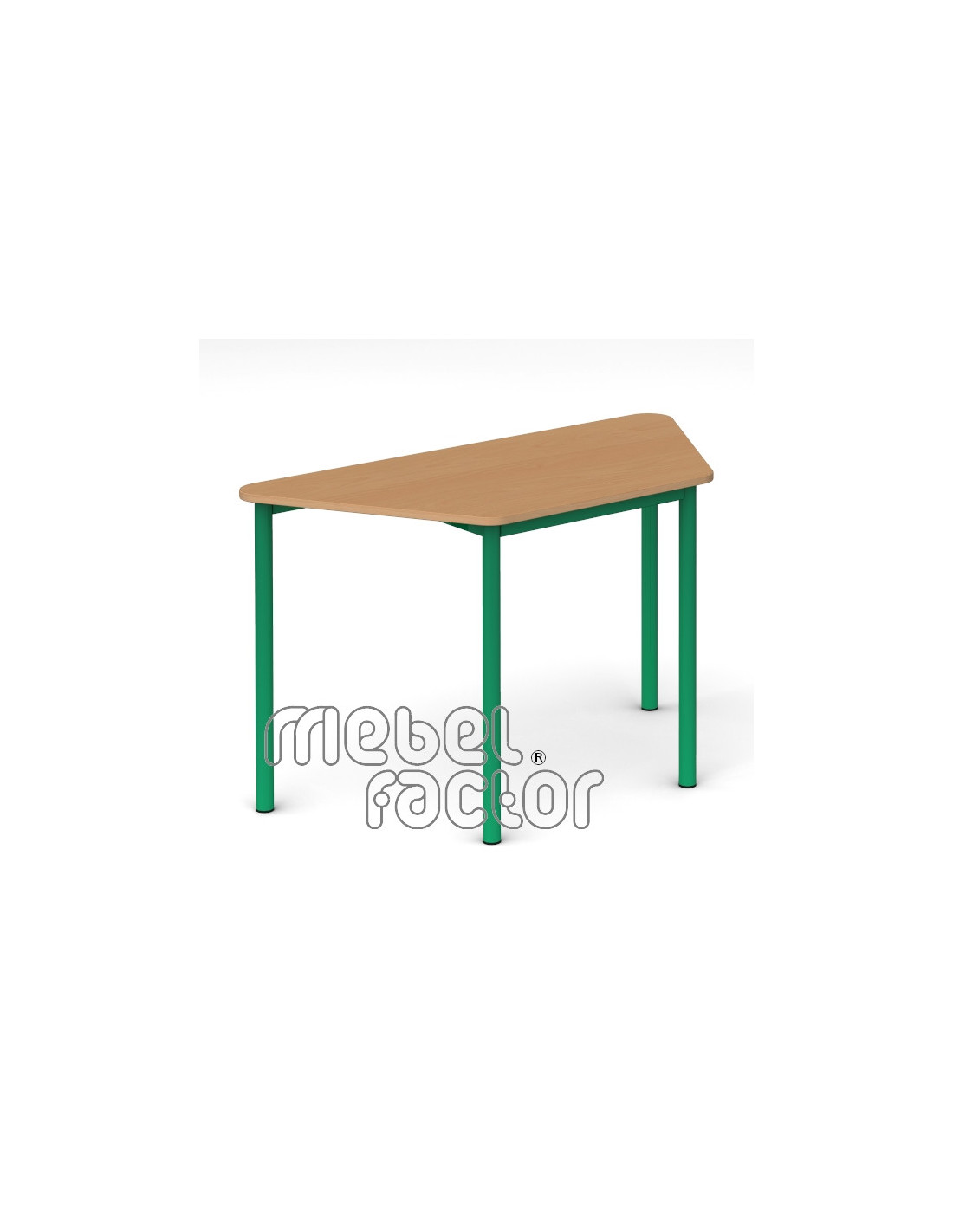 Ученическа модулна маса РОНДО, размер 5. Подходяща за възраст от 11 до 14 години. Трапецовиден плот с размери 120х58см./Н71см, кант 2,0мм. Дължина на горната основа и бедрата на трапеца - 60см. Обезопасени, заоблени ъгли на плота. Декори на ламинирано ПДЧ от фирмения картел. Заварена конструкция с крака от тръба 40мм. Царги от правоъгълен профил 40х20мм. Полимерно, прахово покритие в цветове по RAL. Произведено в България. Продуктът отговаря на стандарт БДС EN 1729 - "Мебели. Столове и маси за учебни заведения."