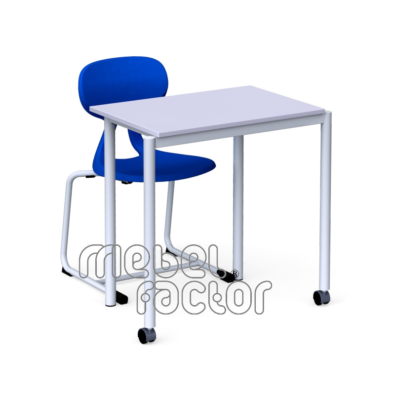 Подвижна маса РОНДО СТИФ, размер 5. Удобна за самостоятелна и групова работа. Подходяща за учебни и конферентни зали. Придвижване на две колела с фиксиращ механизъм. Стифиране до 4 броя. Подходяща за възраст над 14 години. Плот с размери 70х50/Н71см., кант 2,0мм. Декори на ламинирано ПДЧ от фирмения картел. Заварена конструкция с крака от тръба 40мм. Царги от правоъгълен профил 40х20мм. Полимерно, прахово покритие в цветове по RAL. Произведено в България. Продуктът отговаря на стандарт БДС EN 1729 - "Мебели. Столове и маси за учебни заведения."