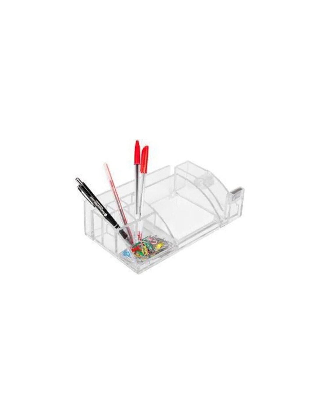 Органайзер за бюро с 3+2 отделения за химикалки, моливи; място за кламери; отделение за хартиено кубче; място за бележник; ленторезачка.