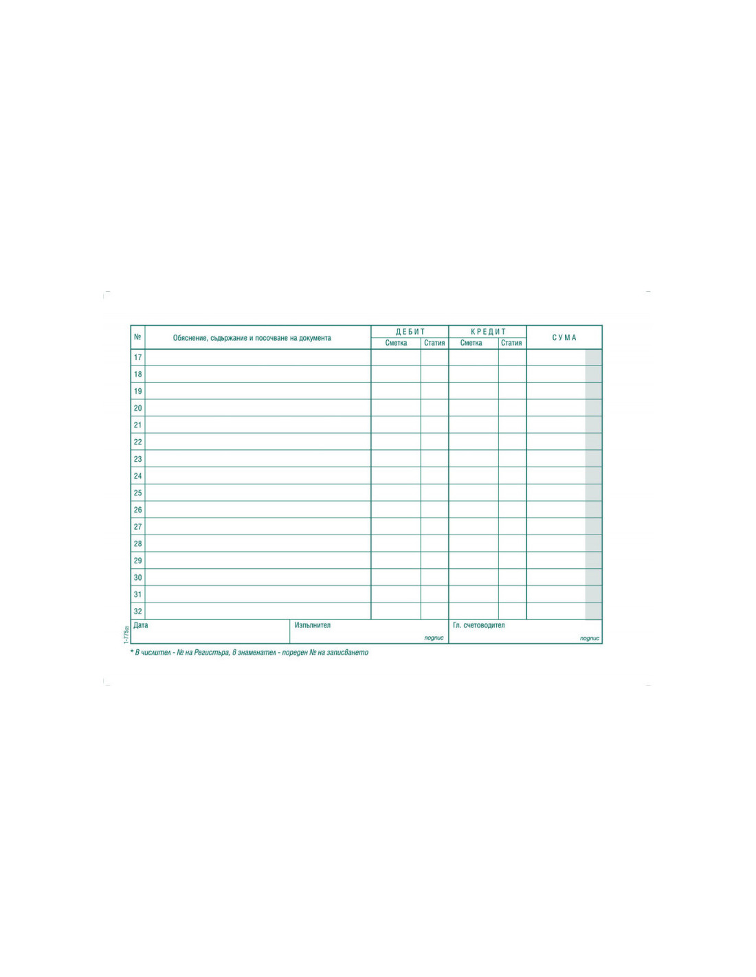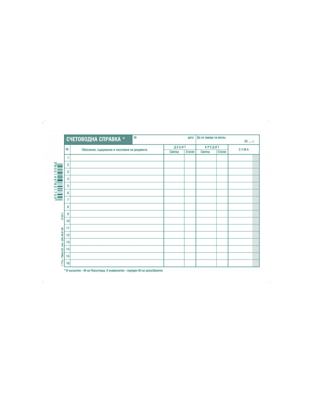 Счетоводна справка, вестникарска хартия, лепен кочан с размери 19.5 х 14 см.