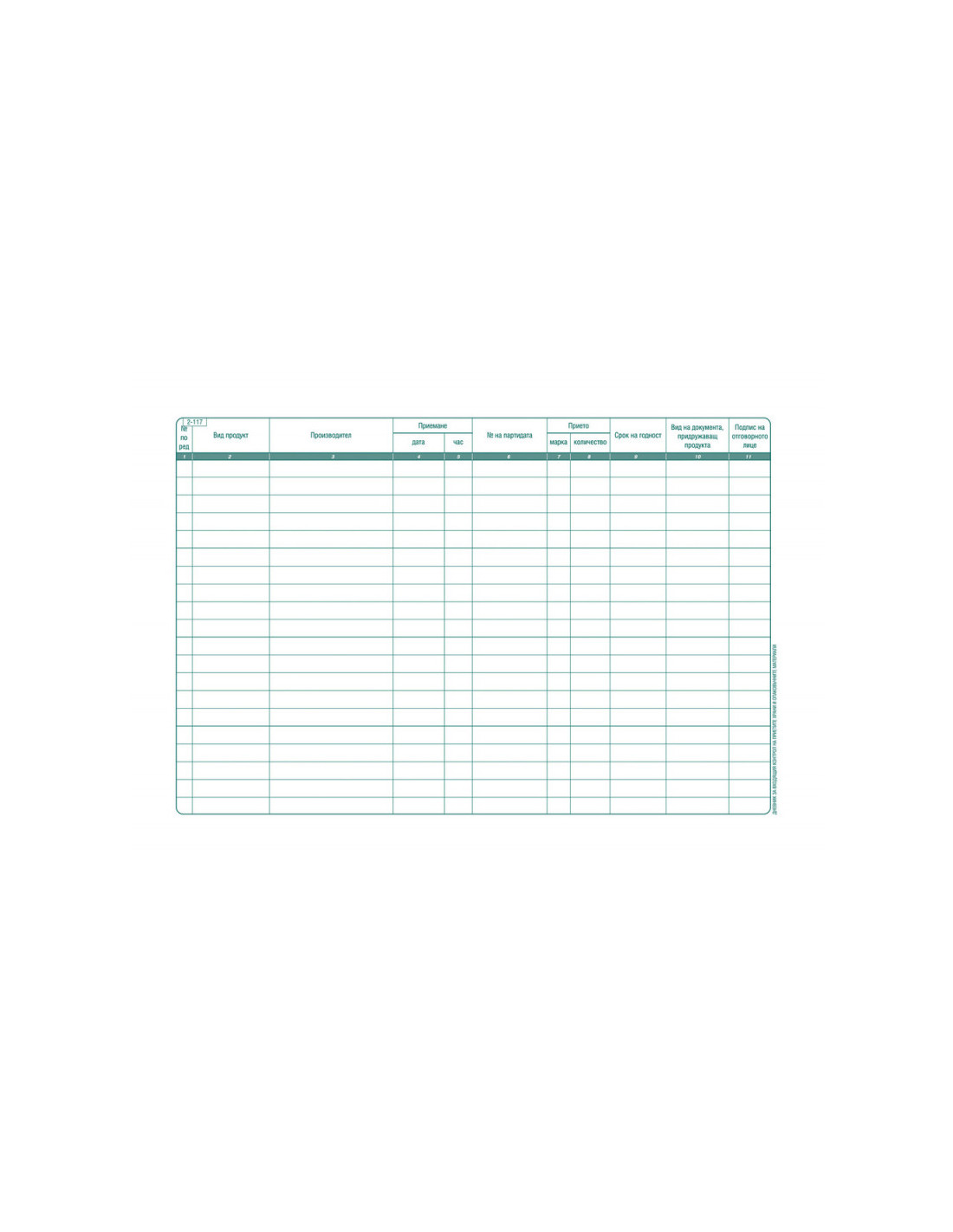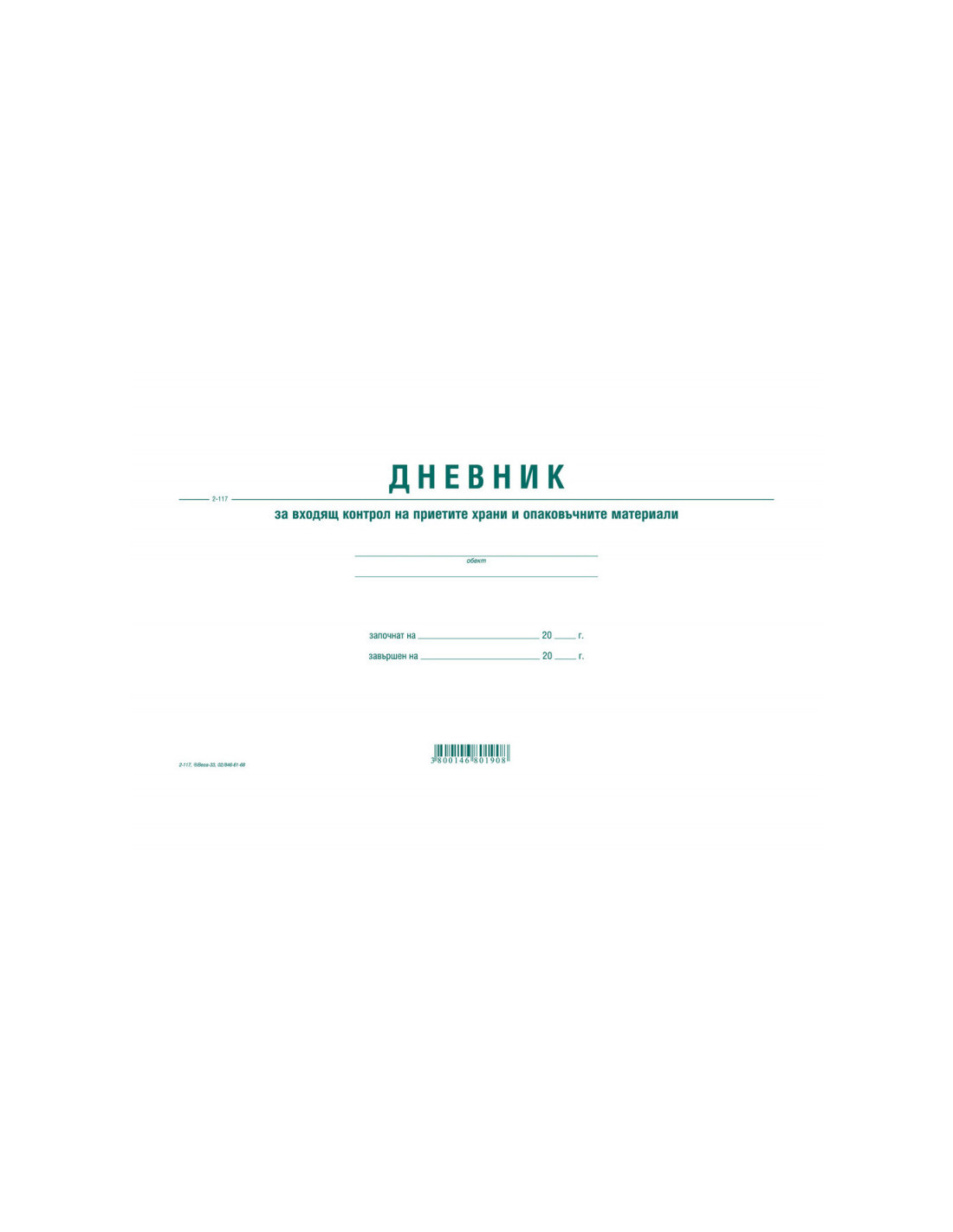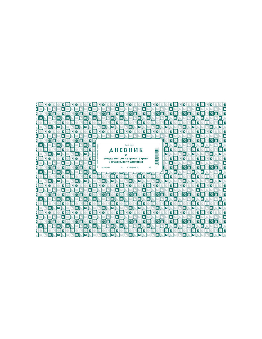 Дневник за входящ контрол на приетите храни и опаковъчните материали, брошура с мека подвързия, вестникарска хартия, размери 29 х 20 см, 50 листа.