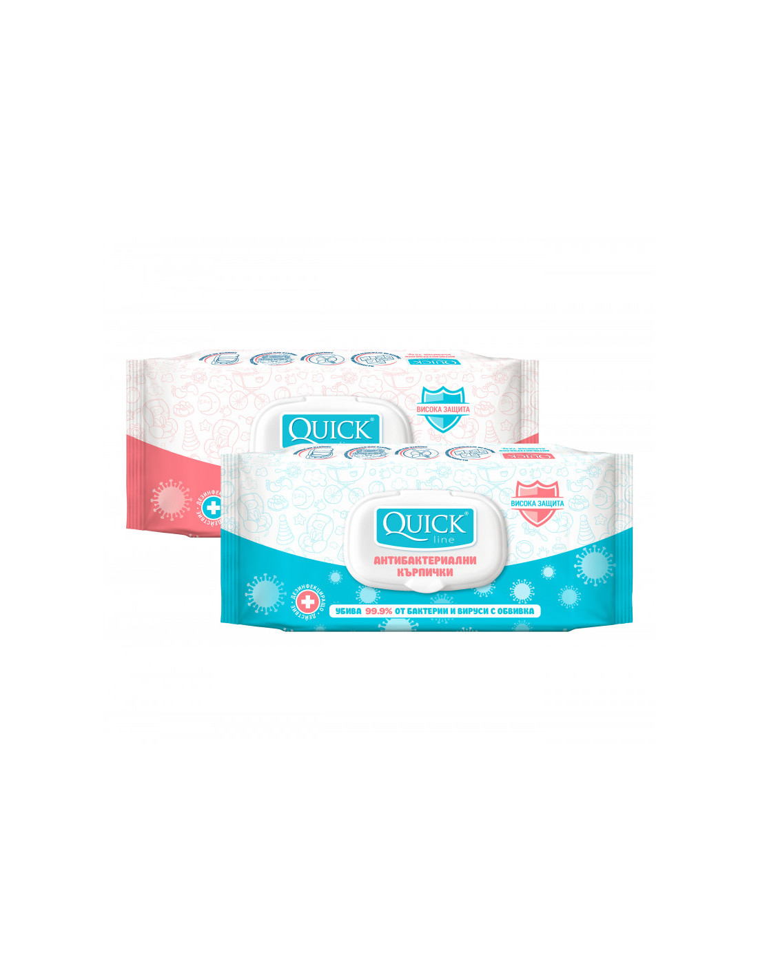 Антибактериалните влажни кърпички Quickline са специално създадени за дезинфекция на кожата на ръцете и малки повърхности без необходимост от употреба на вода. Антибактериалната формула осигурява надеждна защита срещу бактерии, фунги и вируси с обвивка. Кърпичките имат овлажняващо, омекотяващо и освежаващо действие с приятен аромат.