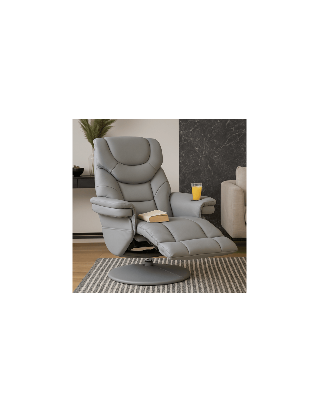 Кресло TIA е създадено за съвършен комфорт и истински моменти на отдих. Изработено от висококачествена еко кожа, моделът разполага с два независими релакс механизма за регулиране на поставката за крака и облегалката – и в тандем разгръщат креслото в почти легнало положение, създадено за безвремие. Вграденият джоб под левия подлакътник побира удобно книга или дистанционно, а вградената поставка за чаша допълва усещането за уют. Здрава метална основа с праховобоядисано покритие, облицована с еко кожа, осигурява стил и стабилност, а 360-градусовото въртене гарантира пълна свобода на движение.