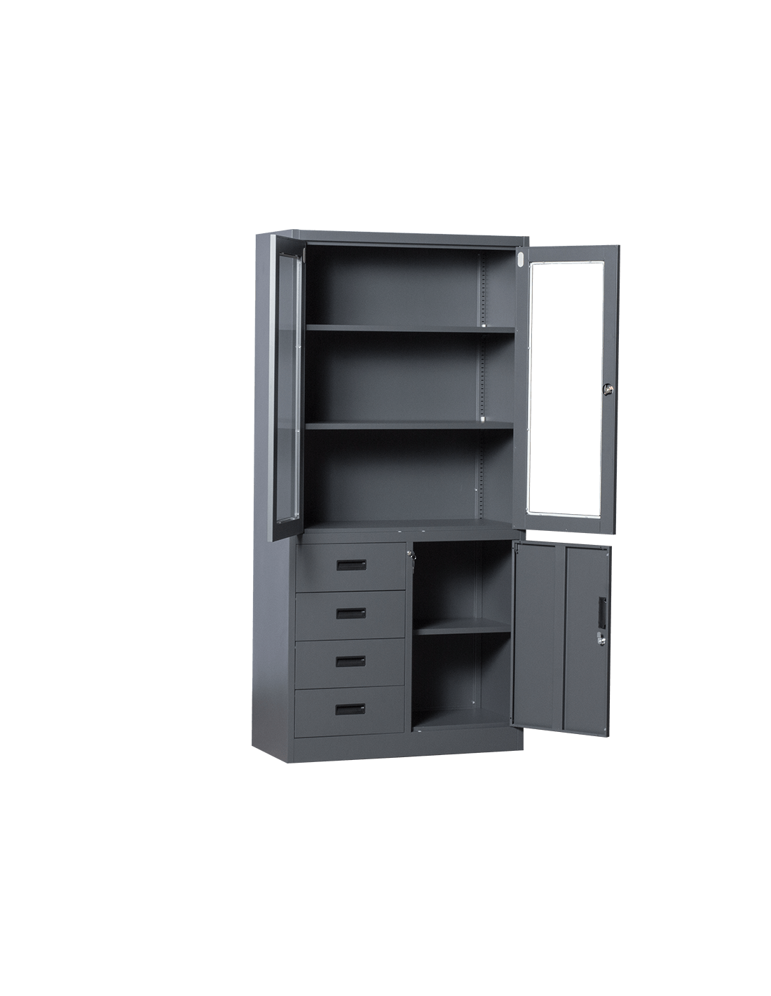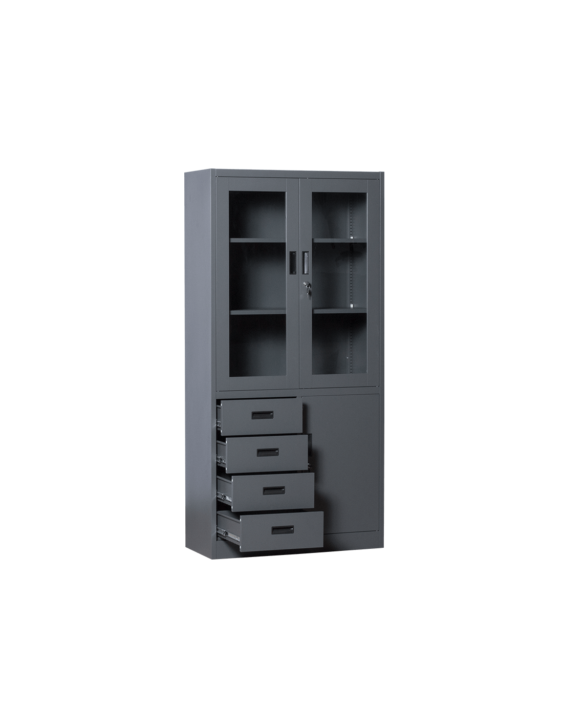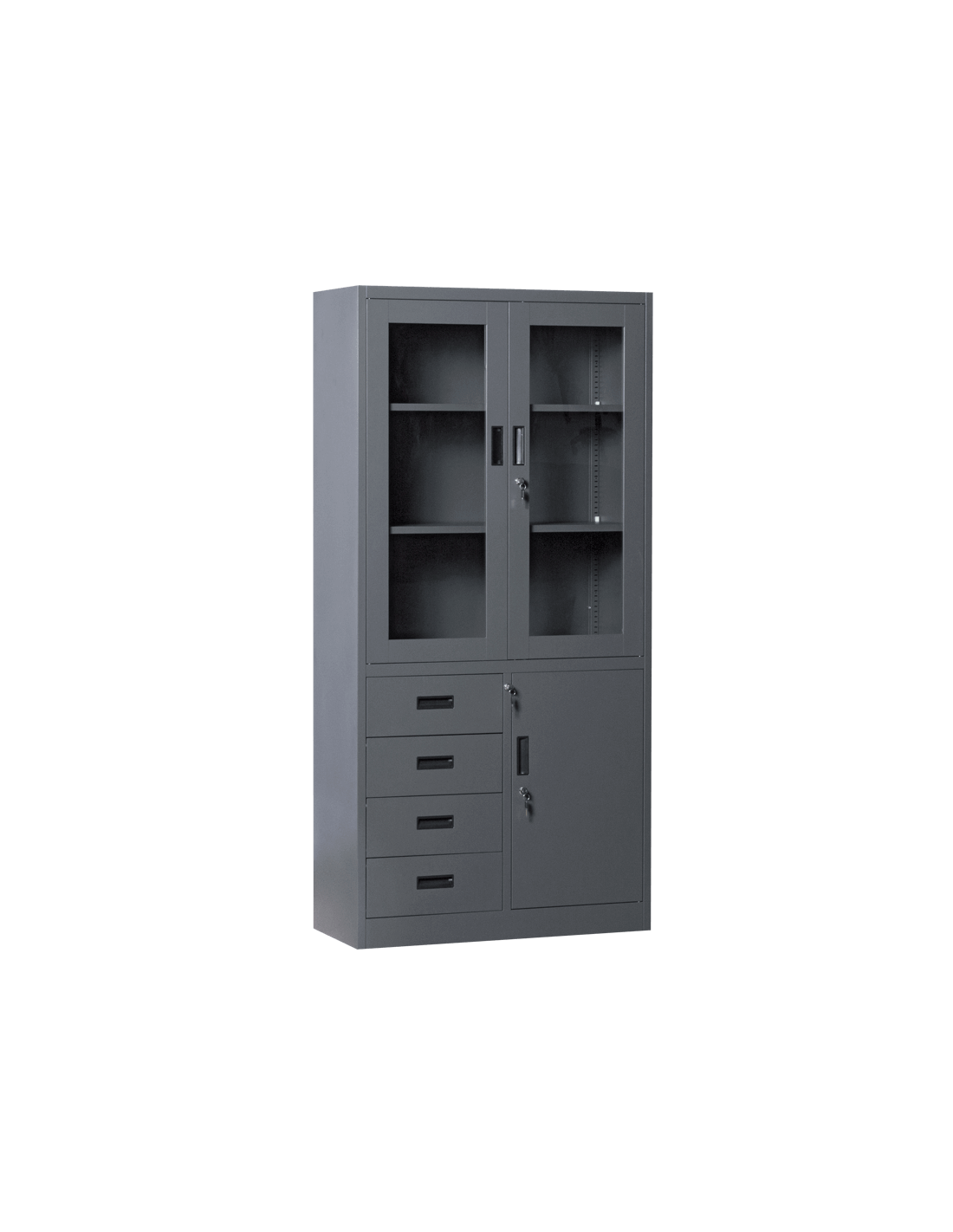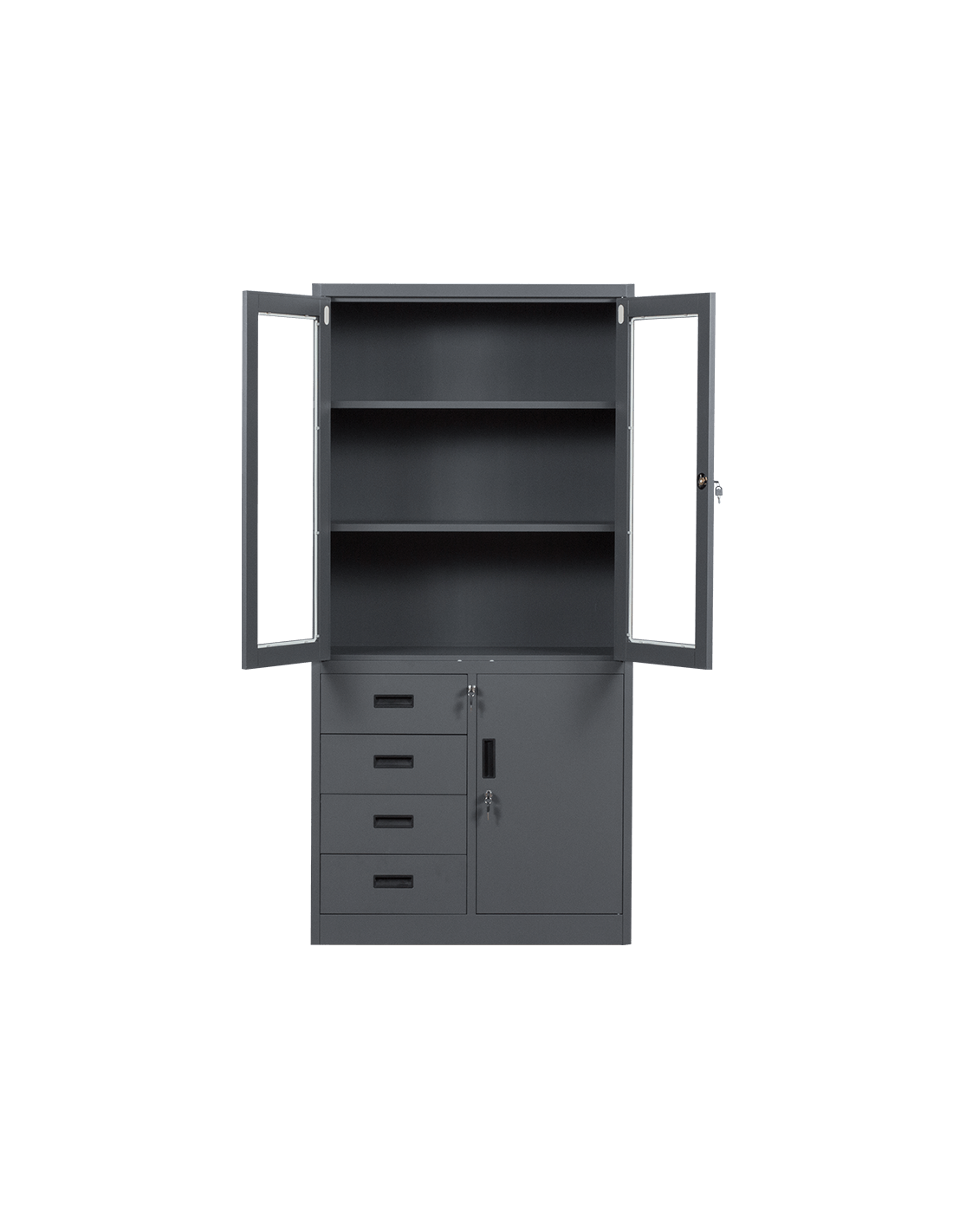 Carmen CR-1278 E L SAND е практичен метален шкаф за документи със заключване и удобно разпределение, включващо: 1 голям шкаф със стъклени врати и 2 рафта, един по-малък шкаф с 1 рафт и 4 чекмеджета. Размери: ш. 90 см / д. 45 см / в. 185 см. Пълна информация за размерите и характеристиките на модела ще намерите в таблицата в таб/поле "Техническа информация".