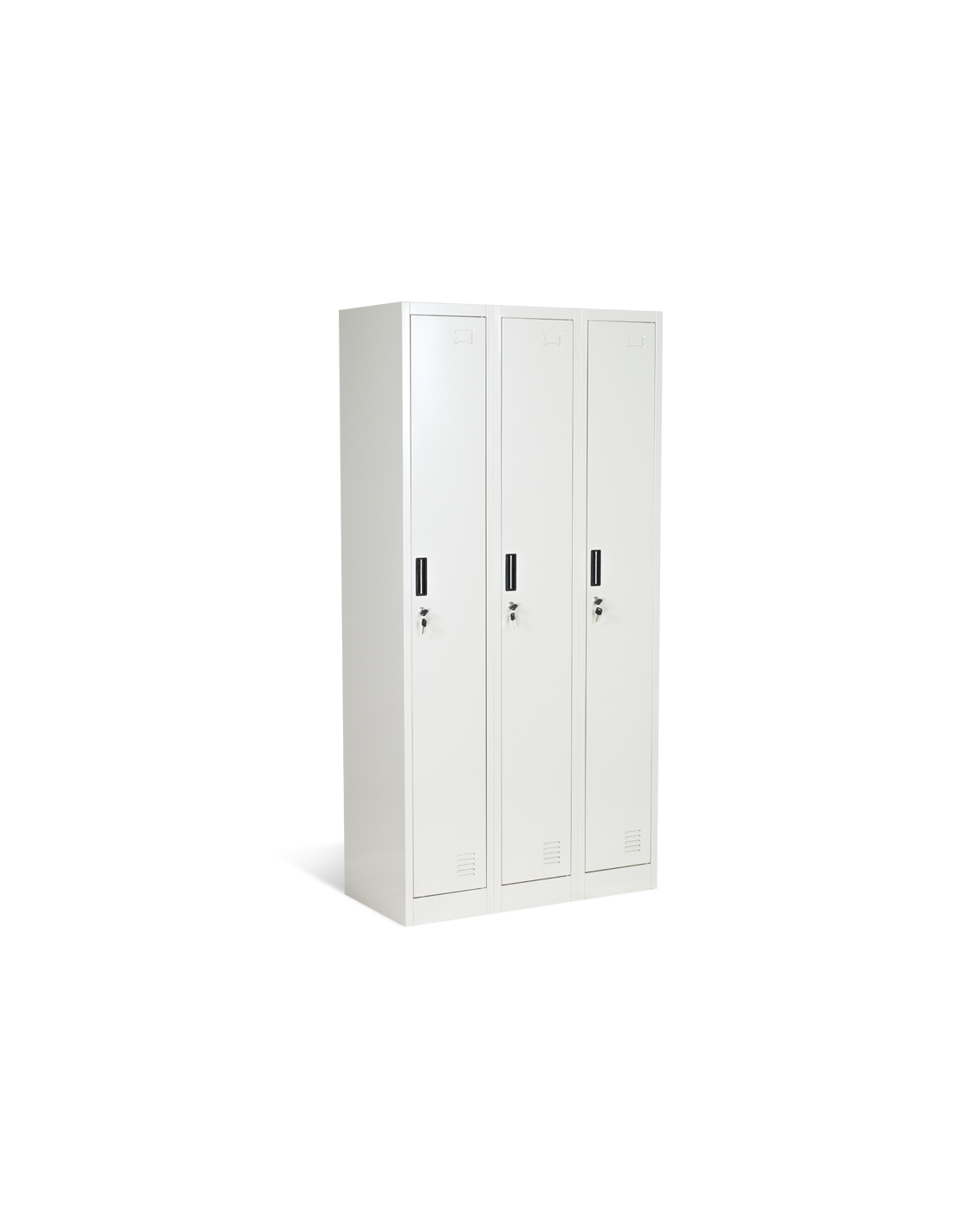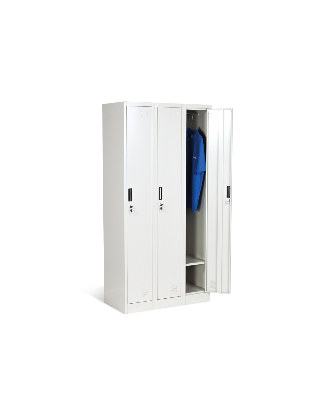 Метален шкаф за съблекалня CR-1242 J от серията метални шкафове на Carmen разполага с три метални врати, три рафта и възможност за заключване. Системата от метални мебели на Carmen включва офис контейнери, метални гардероби за съблекалня, метални контейнери, метални шкафове за документи, кардекс и други. Пълна информация за размерите и характеристиките на модела ще намерите в таблицата в таб/поле "Техническа информация".