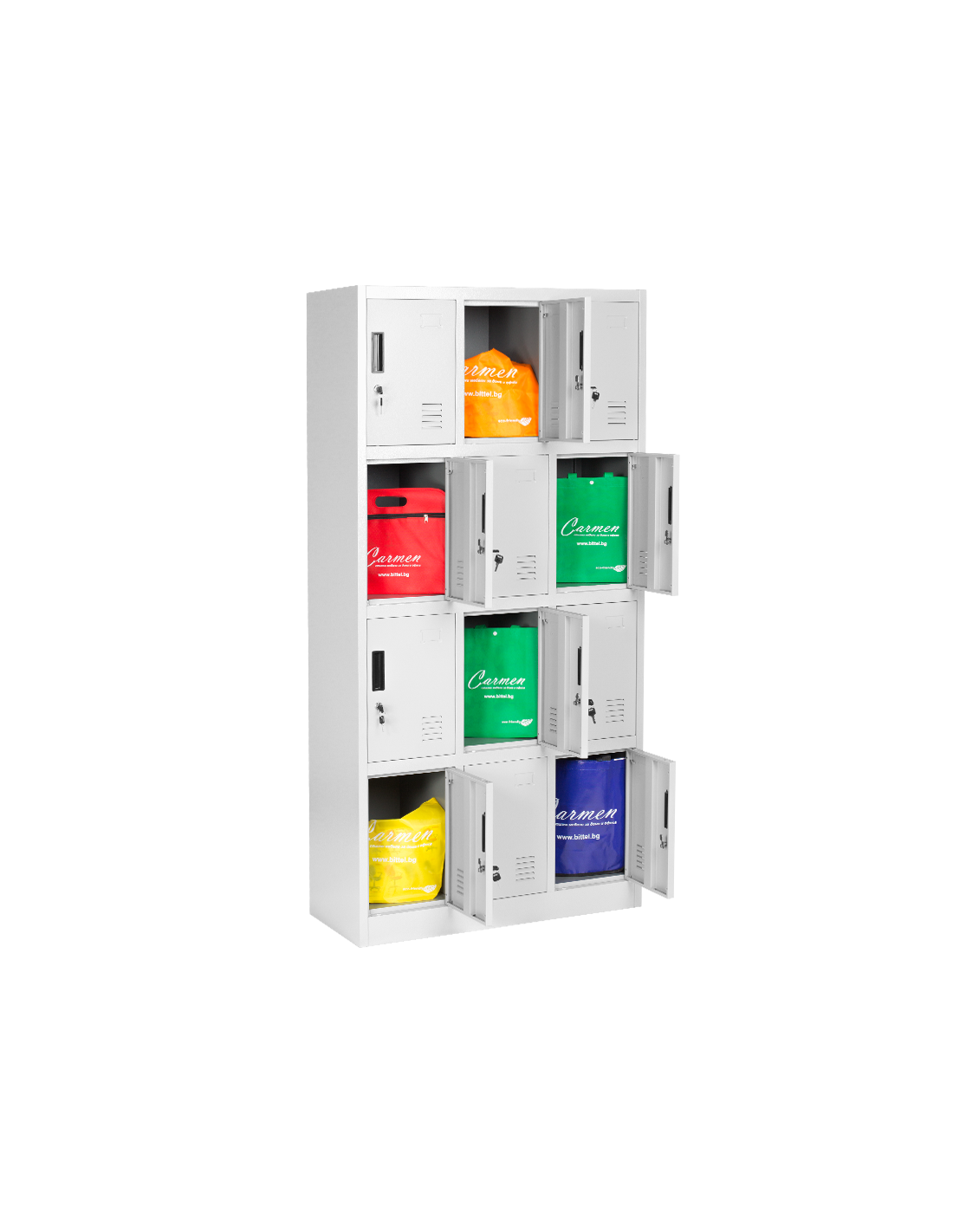 Металеният шкаф CR-1258 J е функционален гардероб с дванадесет на брой отделения с метални вратички и самостоятелни заключващи механизми. Подходящ е за съхранение на лични вещи, документи и багаж с компактни размери. Моделът е част от колекцията мебели от метал на Carmen, която включва метални контейнери, метални шкафове за документи, кардекс, метални сейфове, метални бюра и метални стелажи. Пълна информация за размерите и характеристиките на модела ще намерите в таблицата в таб/поле "Техническа информация".