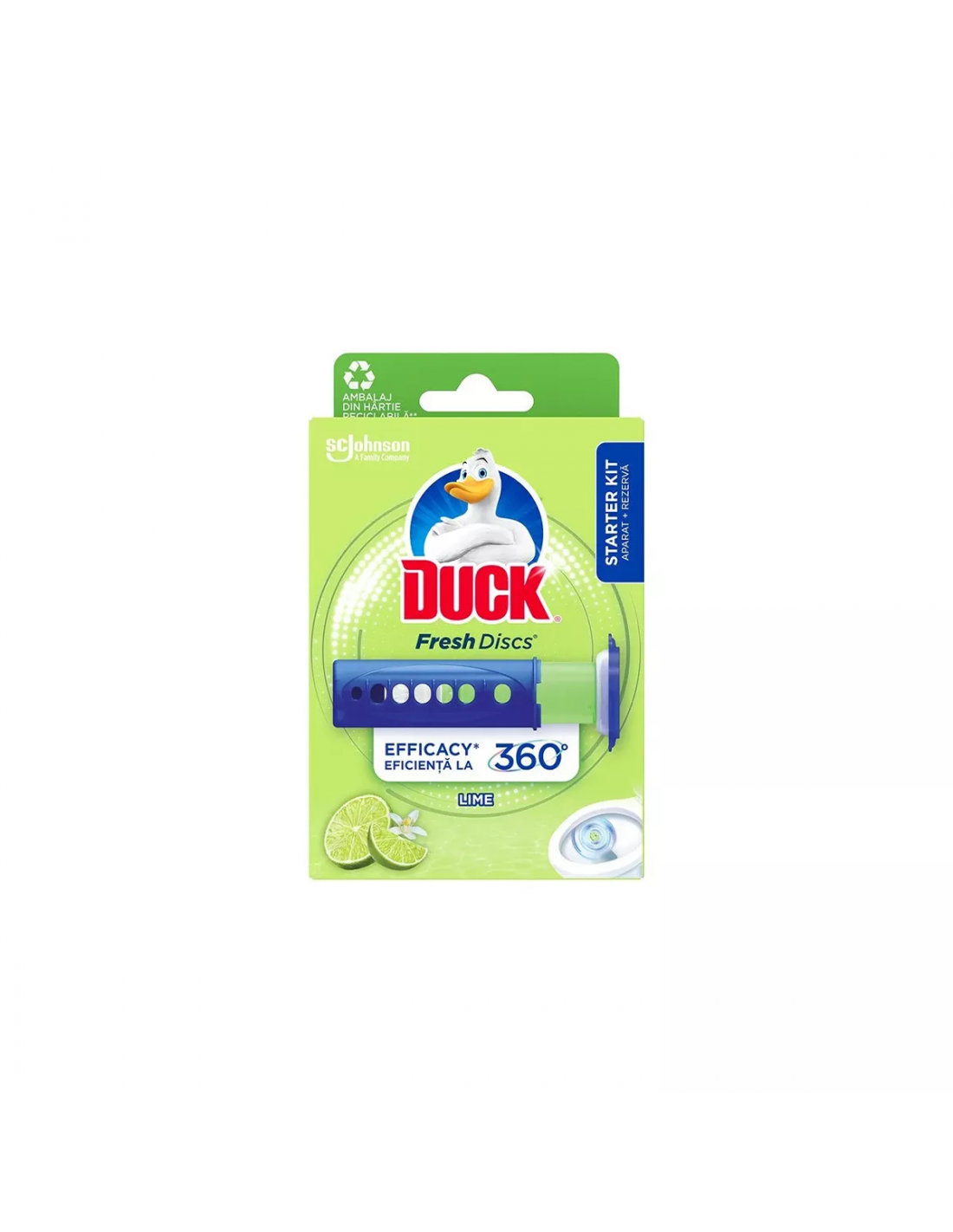 Тревожите ли се за традиционните клетки за почистване на тоалетни, в които се крият микроби? Не се тревожете повече. Duck® Fresh Discs Lime имат формула за премахване на петна от тоалетна на основата на гел, която се залепва сама за тоалетната чиния, така че клетките за зародиши не са нещо, за което да се тревожите. Fresh Discs предотвратява натрупването на варовик и петна от микроби. Просто залепете един към вътрешния ръб на тоалетната, за да можете да поддържате нещата чисти със свеж аромат на лайм. Не е необходимо докосване или търкане, само автоматично освежаващо действие при всяко промиване. Доста лесно, а? Този пакет за пълнене на почистващ препарат за баня съдържа 2 туби с гел с 12 диска.