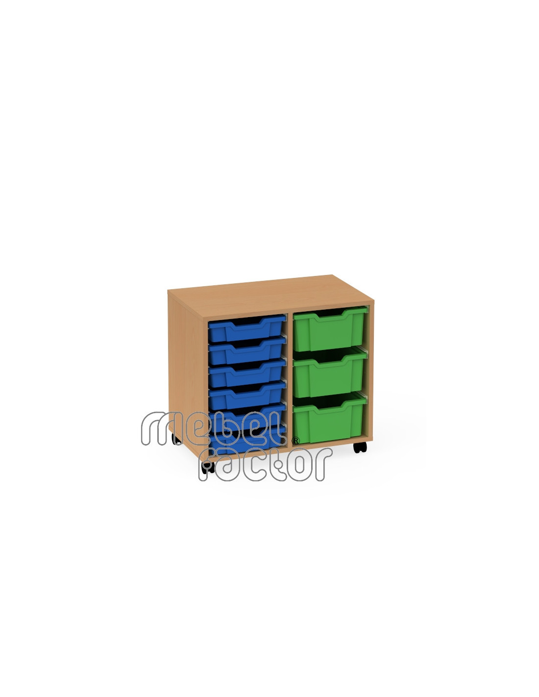 Подвижен двоен шкаф с 9 контейнера Gratnells Корпус от 18 мм ламинирано ПДЧ с кант 0,5мм Стабилна конструкция с плътен гръб и колела. Декори на ламинирано ПДЧ от фирмения картел. Шкафа съдържа: 6 броя плитък контейнер F1 3 броя среден контейнер F2 Произведено в България.