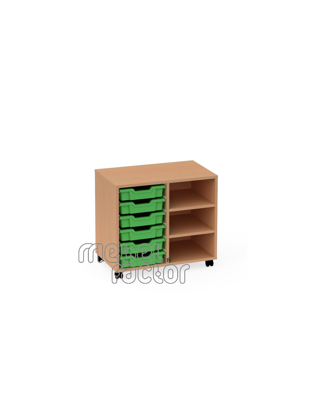 Подвижен двоен шкаф с 6 контейнера Gratnells Корпус от 18 мм ламинирано ПДЧ с кант 0,5мм Стабилна конструкция с плътен гръб и колела. Декори на ламинирано ПДЧ от фирмения картел. Шкафа съдържа: 6 броя плитък контейнер F1 Произведено в България.