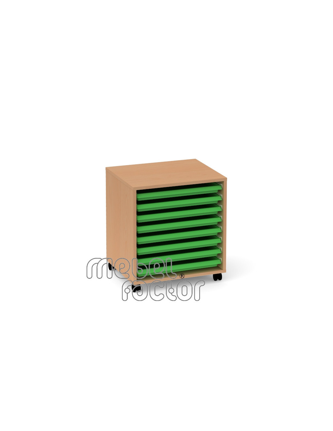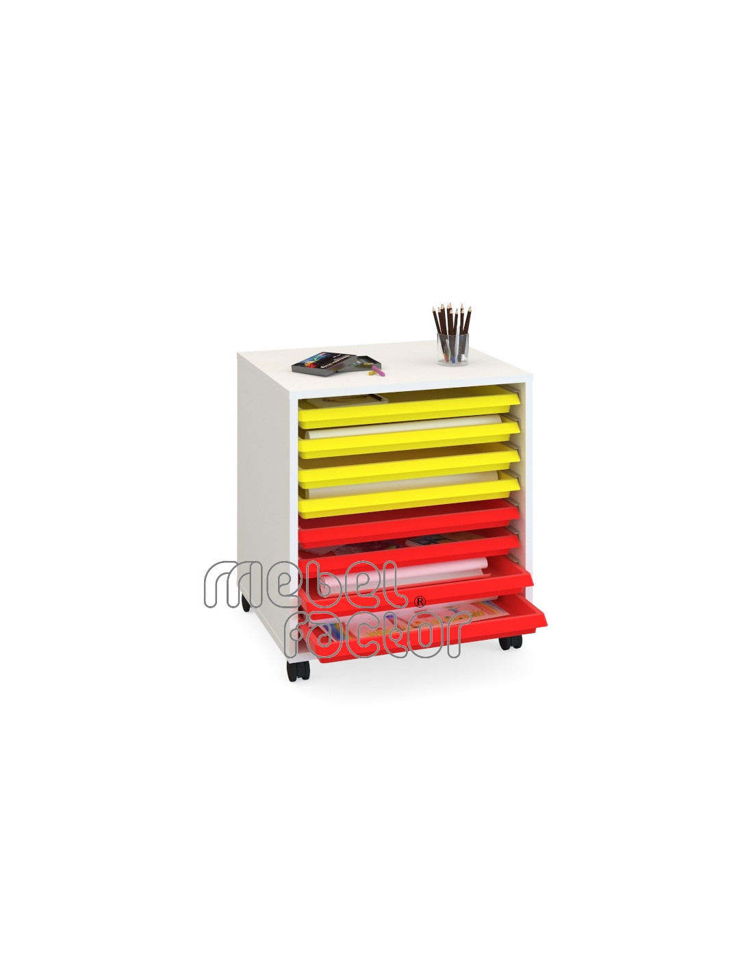 Подвижен шкаф с 8 цветни контейнера за изкуство А1. Корпус от 18 мм ламинирано ПДЧ с кант 0,5мм. Стабилна конструкция с плътен гръб и колела. Декори на ламинирано ПДЧ от фирмения картел. Шкафа съдържа: 8 броя цветен контейнер за изкуство А1. Произведено в България.